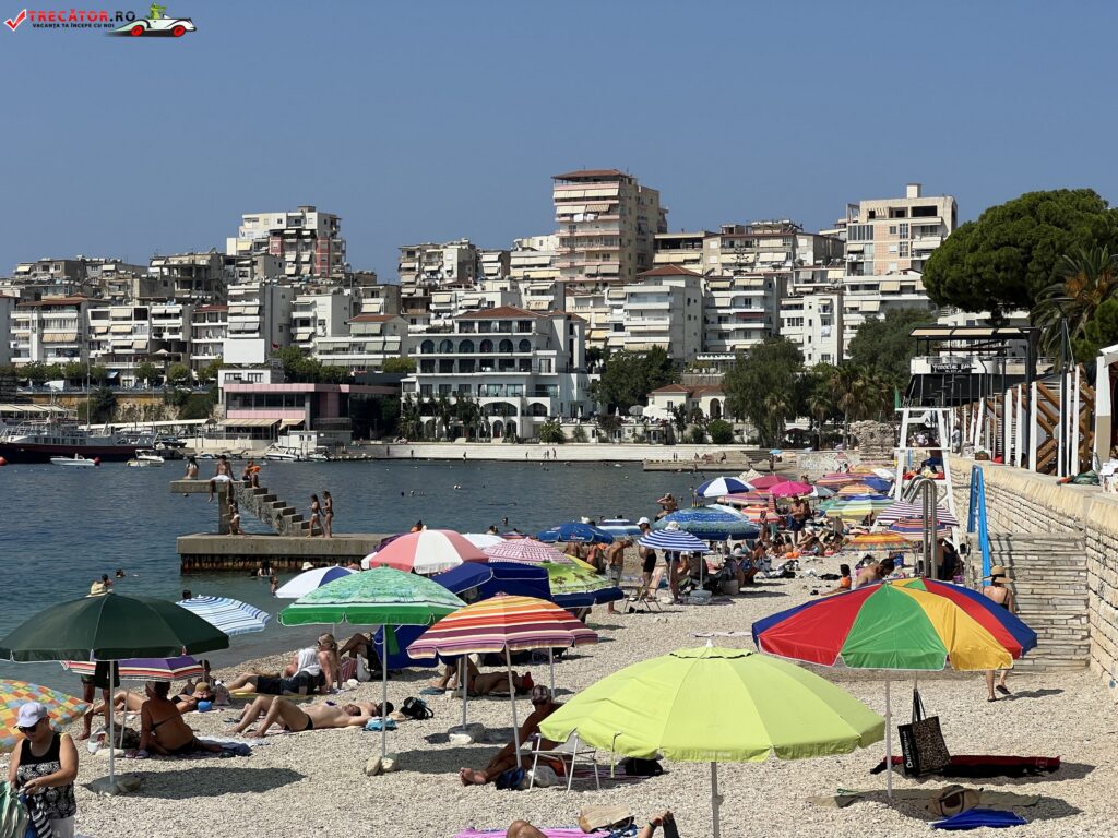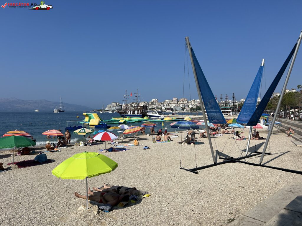 Plaja Saranda oferă o priveliște impresionantă asupra golfului, cu apa cristalină și azurie, și insula Corfu vizibilă în depărtare. Zona este înconjurată de dealuri și vegetație, iar orașul Saranda însuși contribuie la peisajul urban cu clădiri moderne și un port plin de iahturi și bărci.