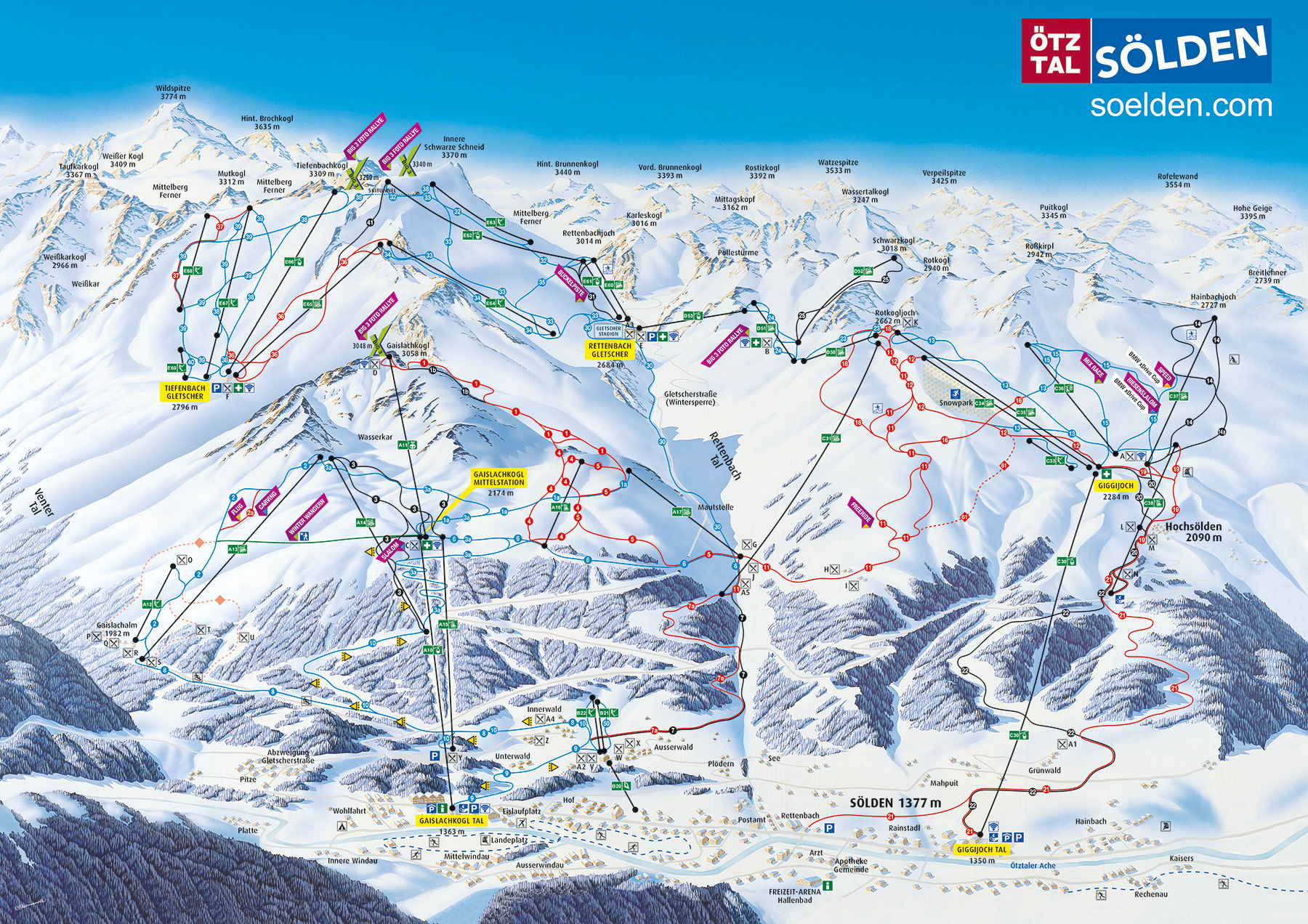 Bine inteles ca cele trei noi statii ofera si tot confortul modern, cum ar fi scari rulante sau lifturi in locul scarilor obositoare. La statia din mijloc fereastra de 190 metri patrati ofera o panorama grandioasa. Iar la statia de pe varf, platforma pentru privelistea BIG3 si restaurantul TreMilla sunt doar la cativa pasi distanta. Prin BIG3 se denumesc in Otztal cele trei varfuri de peste trei mii de metri: Gaislachkogl, Tiefenbachkogl si Schwarze Schneid. Cele trei apartin de regiunea de schi care cuprinde 150 kilometri de partii. Cea mai lunga partie este iarna de 15 kilometri si are o diferenta de nivel de peste 2.000 metri.