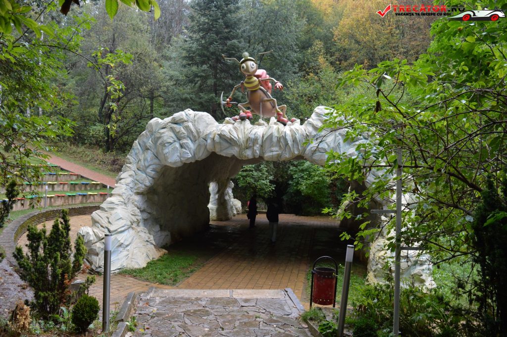 La intrarea în peșteră ne întâmpină o furnică gigant cocoțată pe o arcadă care imită gheața. Uuu, ne introduceau în spiritul zonei :). Defapt se vede destul de clar că toate amenajările din exteriorul peșterii au ca grup țintă familiile cu copii. Un amfitetru colorat pentru spectacole, un mini mini panou de escaladă, zonă de picnic și coșuri de gunoaie cu animăluțe desenate pe ele, toate îți inspiră sentimentul că o familie poate avea o ieșire relaxată în aer liber, cu vizitatul peșterii inclus.