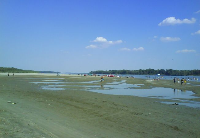 Coborâm de pe dig, urmând drumul care se pierde apoi în pădure. Câteva minute de mers şi dintr-odată copacii se dau la o parte, lăsând privirii doar fluviul. Şi mai ales plaja. Oftăm, din cauză că nu e soare. Picioarele ni se afundă în nisipul umezit de picăturile cerului plumburiu. Plajei nu i se vede capătul. Întinderea albă s-a luptat aici cu pădurea, luând cu asalt uscatul şi înconjurând vegetaţia. Ne întoarcem spre apă, zărind în apropierea malului ceva de care ochiul cu greu se poate desprinde – o insulă. „Se poate merge uşor prin apă, până la insulă”, auzim de la primar.