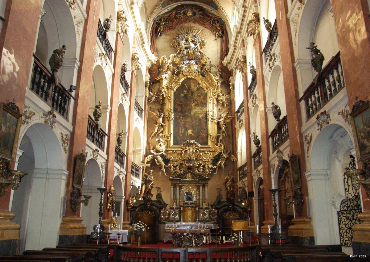 Una dintre cele mai mari atracții ale acestei biserici este mormântul fostului cancelar ceh Vratislav de Mitrovice. Design-ul elaborat a fost creat de Jan Bernard Fischer din Erlach și reprezintă un testament durabil al artei sale. Se spune că atunci când a fost deschis mormântul, cadavrul a fost găsit stând în ședere, încercând pare-se în van să iasă din mormânt. O altă atracție principală este statuia din secolul al XV-lea a Fecioarei Maria, care se găsește pe altarul principal.