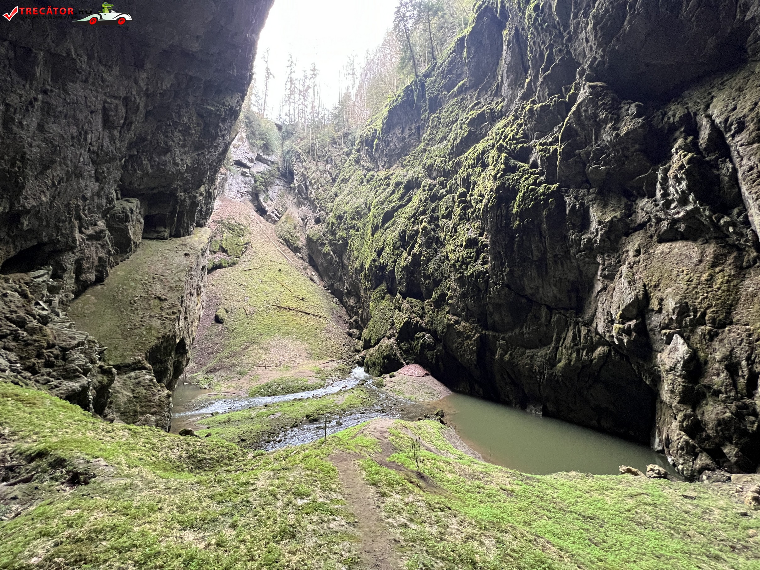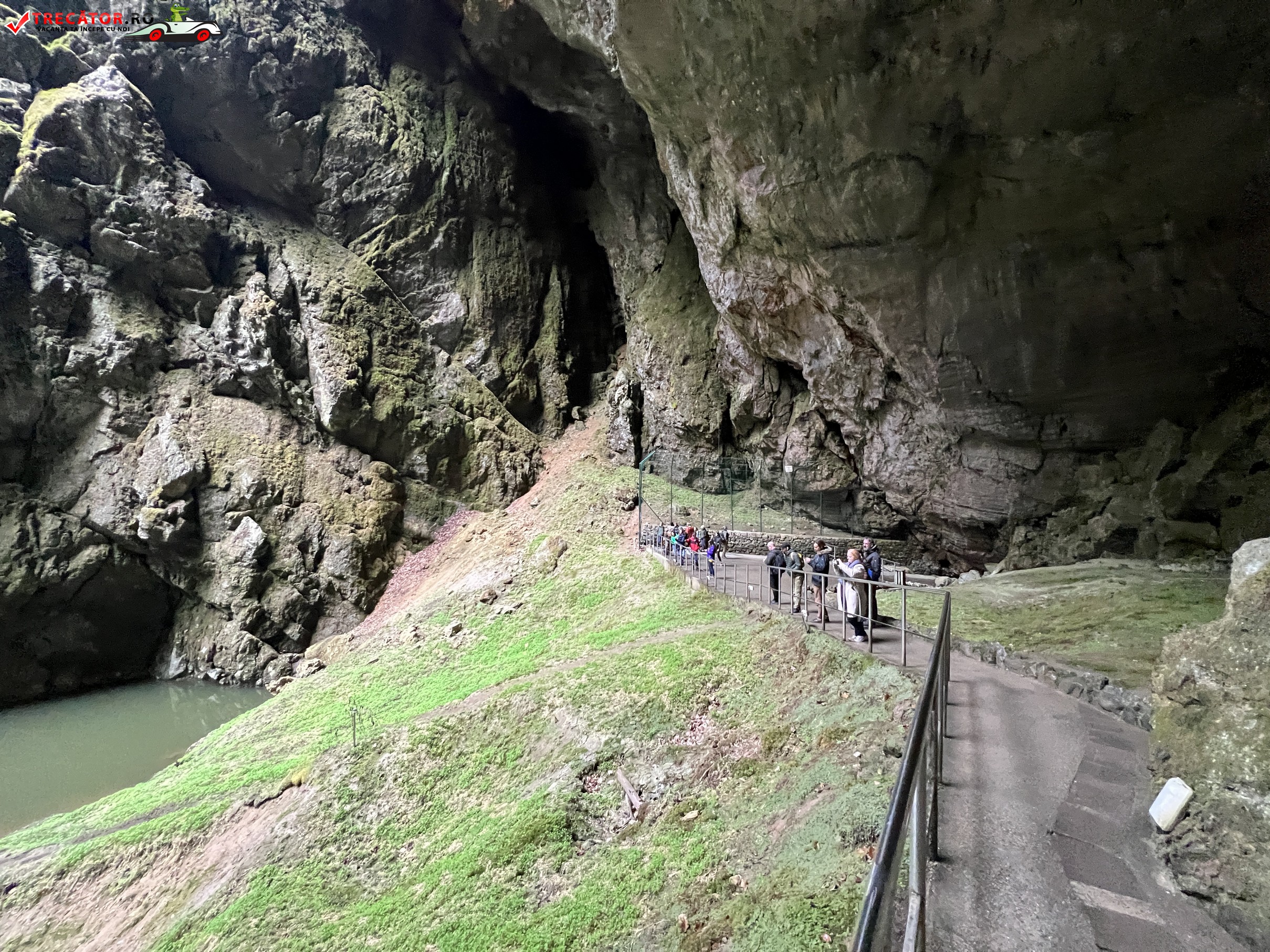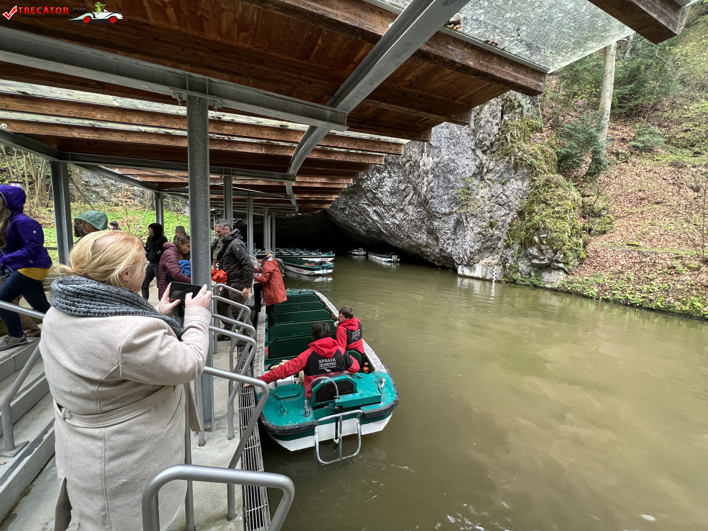 Din parcare, ca să ajungi până la intrarea în Peştera Punkva, fie alegi mica telecabină, cu un coborâş abrupt peste pereţii împăduriţi, fie o iei la pas pe drumul asfaltat, pentru o plimbare plăcută în serpentine.
