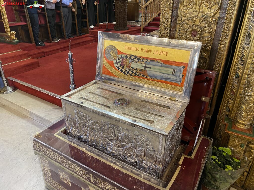 Sub biserică, în criptă, se află ceea ce se crede a fi mormântul original al Sfântului Lazăr. Este un loc de pelerinaj și rugăciune pentru creștinii din întreaga lume. Iconostasul bogat decorat din lemn aurit este o piesă remarcabilă de artă bisericească, datând din perioada otomană. Este considerat un exemplu excepțional de artă religioasă ortodoxă.