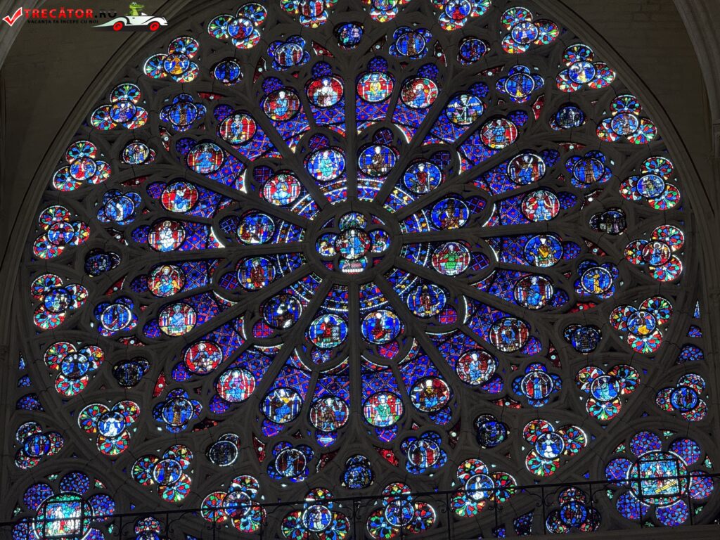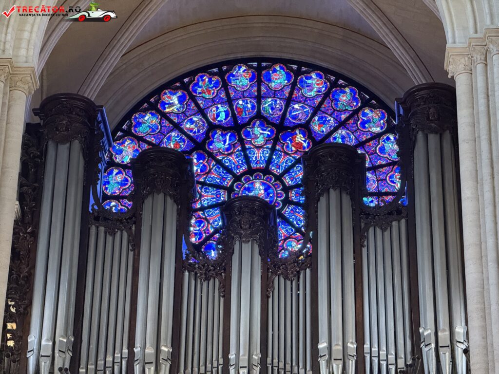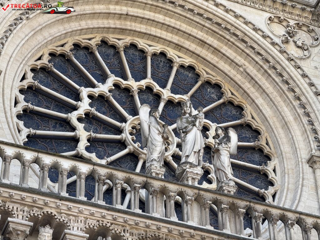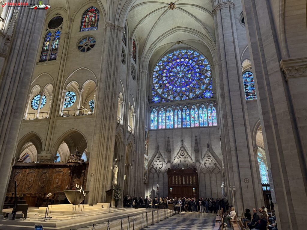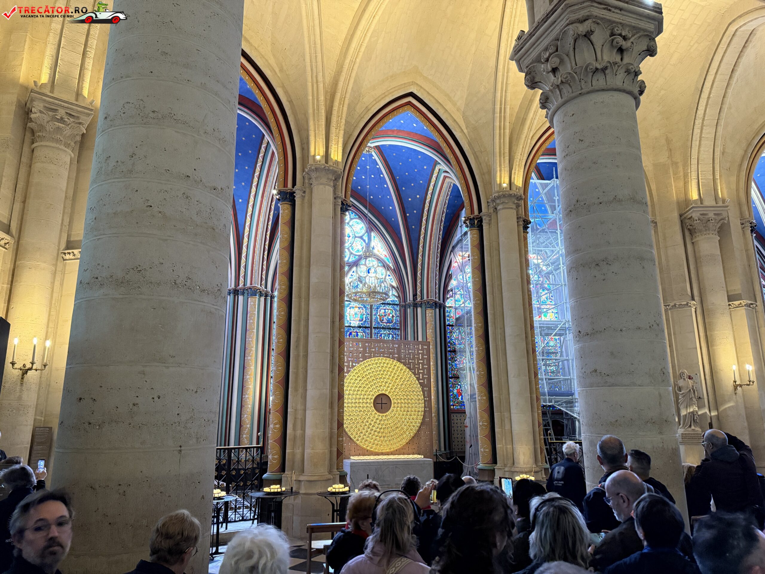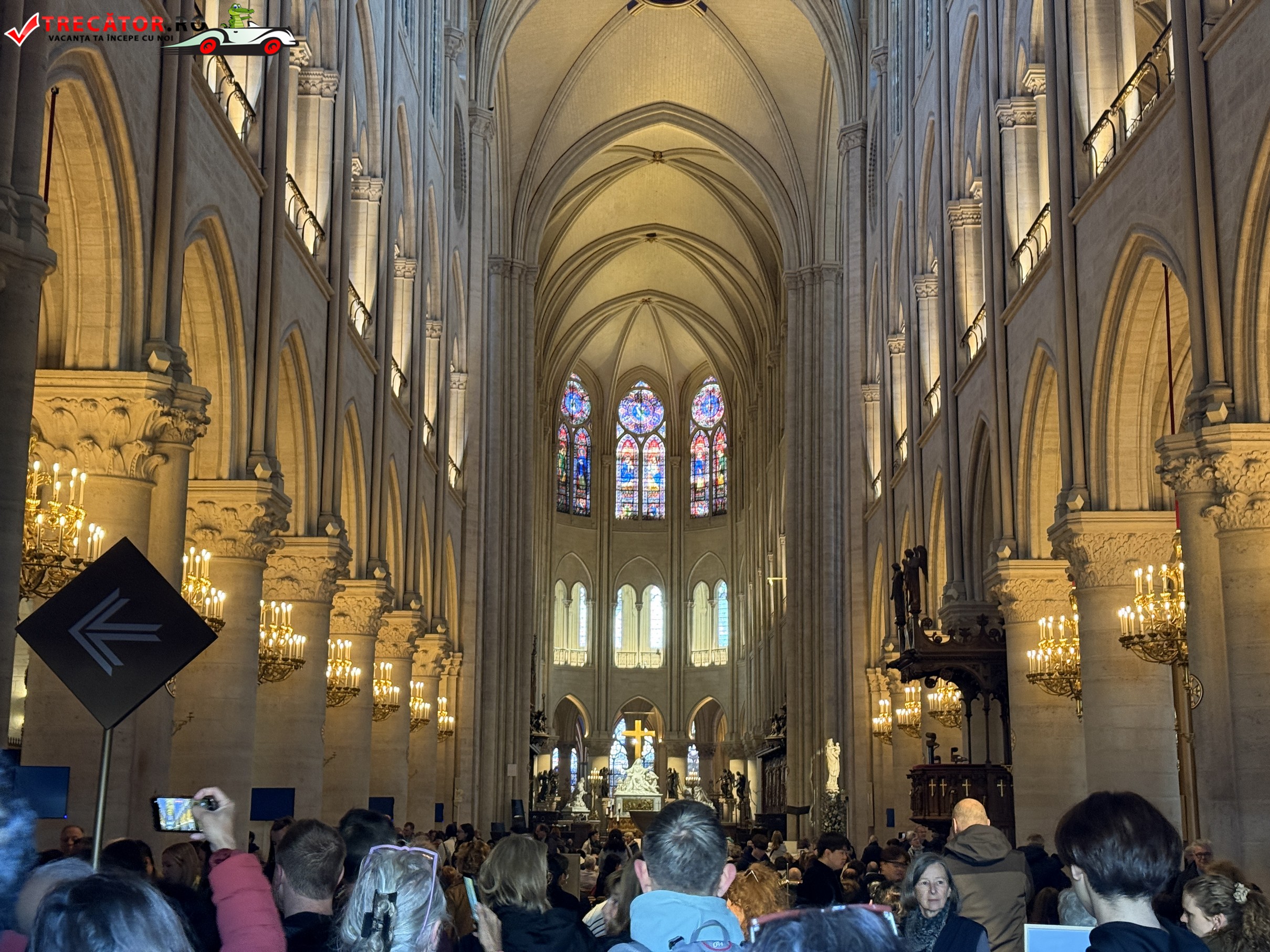 Catedrala Notre-Dame din Paris, redeschisă în decembrie 2024 după restaurarea post-incendiu, impresionează prin vitraliile gotice, inclusiv cele trei rozete, și sculptura „Pietà” de Nicolas Coustou. Interiorul, luminat de un sistem modern cu 2.000 de microproiectoare, evidențiază bolțile înalte și coloanele masive. Vizitatorii pot admira Coroana de Spini, relicvă creștină de mare valoare, și altarul de bronz recent consacrat. Galeria superioară oferă o perspectivă panoramică asupra navei și a orgii monumentale.