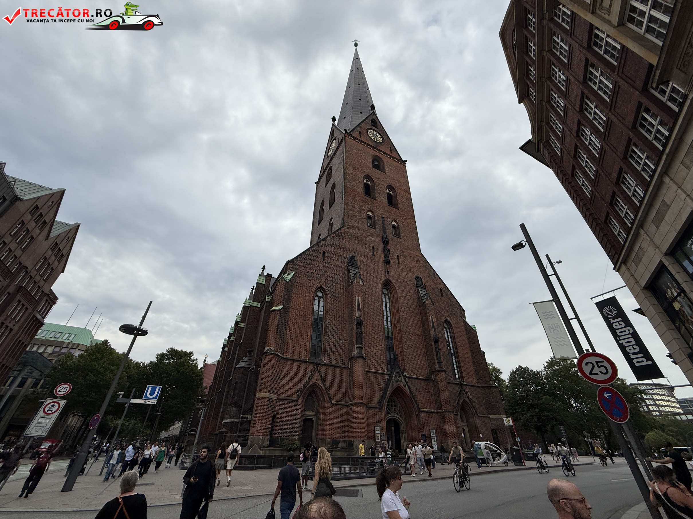 Turnul bisericii, început în 1342, a avut înălțimea de ~127,5 metri înainte de ce a fost depășit de alte construcții, iar platforma de observație se află la ~123 metri. Vizitatorii urcă cele 544 de trepte, traversând ferestre-mică (bullaugen) ce permit priveliști intermediare pe parcurs. De pe această platformă panorama asupra orașului este impresionantă: se pot vedea Rathaus (primăria), lacurile Alster (Binnenalster), cartierul vechi Altstadt, portul, și alte repere urbane.
