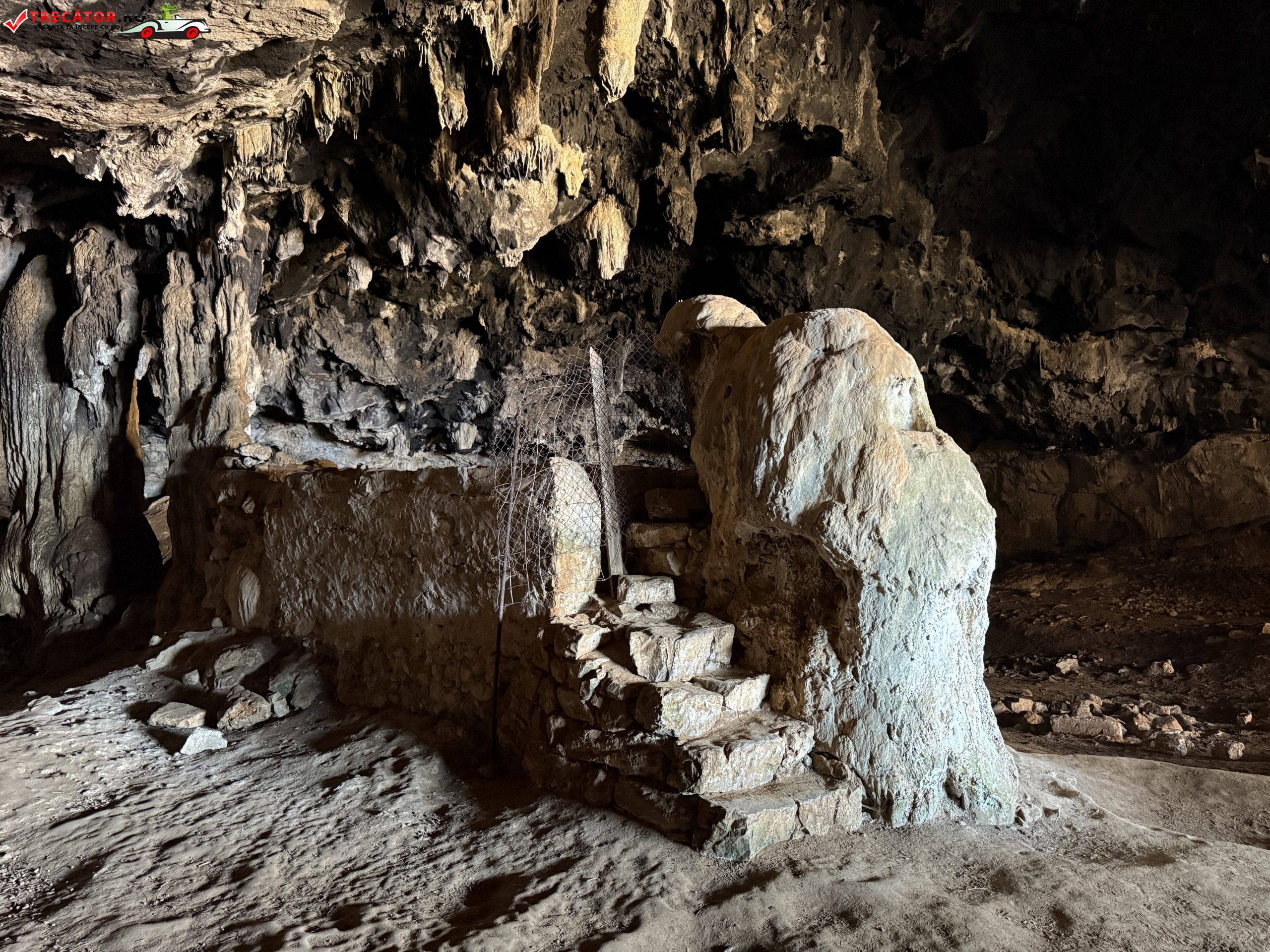 Interiorul peșterii este dominat de marele stalagmit care amintește de un urs care bea apă, așezat lângă un mic bazin format de picăturile cavernei. Acoperișul este întunecat de fum – semn al ritualurilor locale – deoarece anual, în data de 2 februarie (sărbătoarea Întâmpinării Domnului), mulți credincioși petrec noaptea în această peșteră, închinând rugăciuni, aprinzând focuri și aducând mâncare și vin.