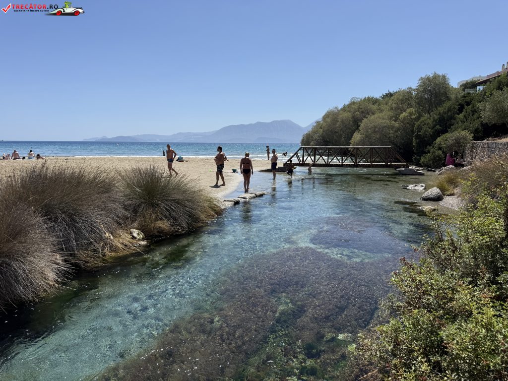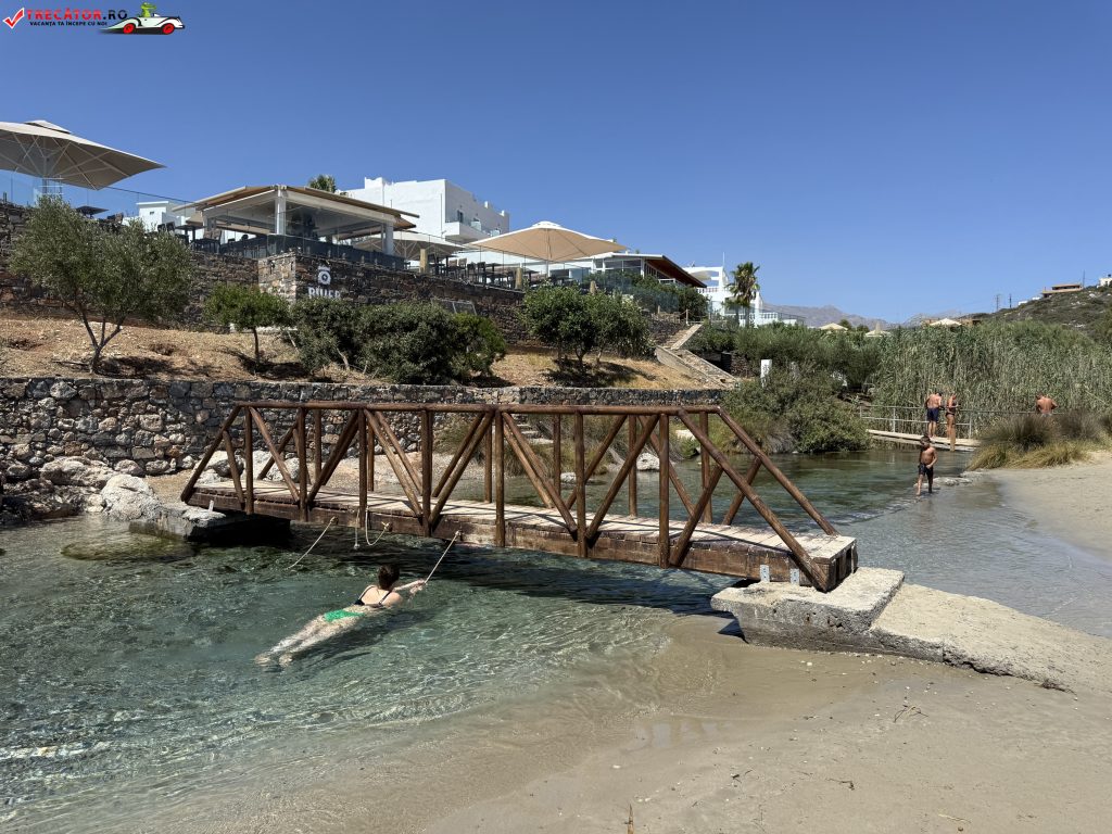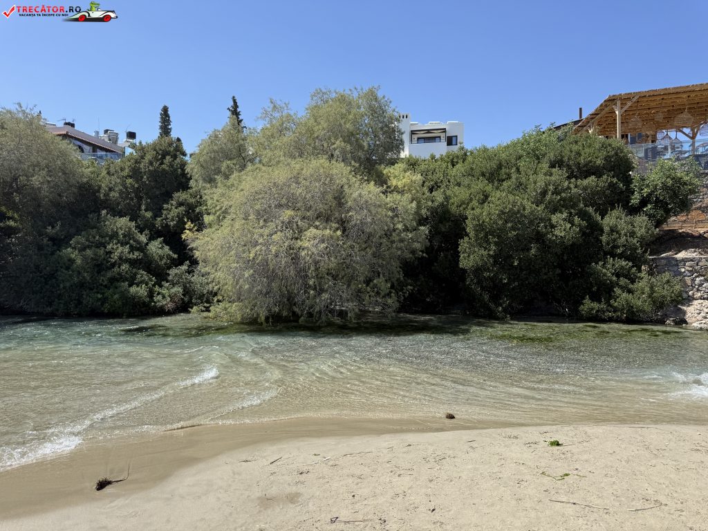Dacă ajungi în Creta de est și te plimbi prin Agios Nikolaos, e imposibil să nu auzi de Plaja Almyros. La doar câțiva kilometri de centrul orașului, această plajă lungă și nisipoasă este una dintre cele mai iubite destinații pentru localnici și turiști deopotrivă. Numele ei vine de la râul Almyros, un curs de apă impresionant care izvorăște din zona karstică și se varsă direct în mare. Râul are un debit constant, chiar și vara, și aduce cu el apă dulce ce se amestecă cu marea Egee. Rezultatul este fascinant: zonele unde curentul intră în contact cu apa sărată sunt mai reci, ceea ce face ca înotul să fie o experiență revigorantă chiar și în zilele toride.