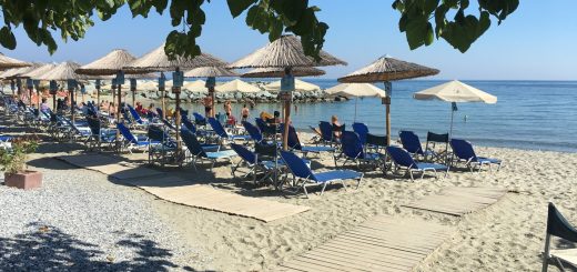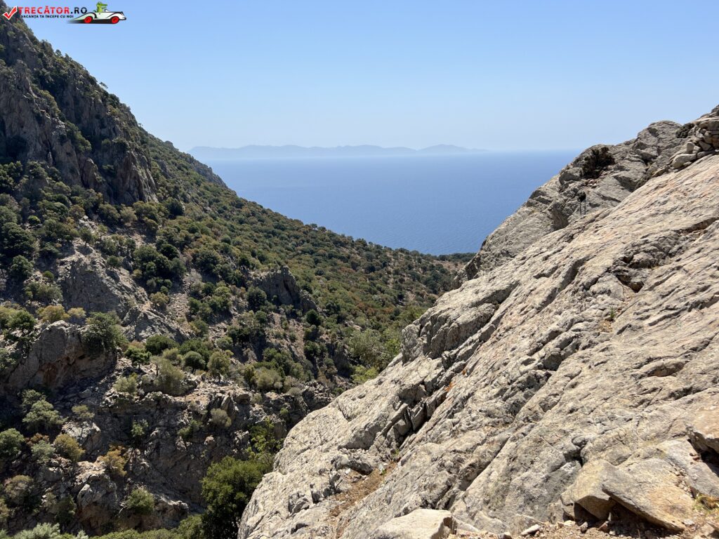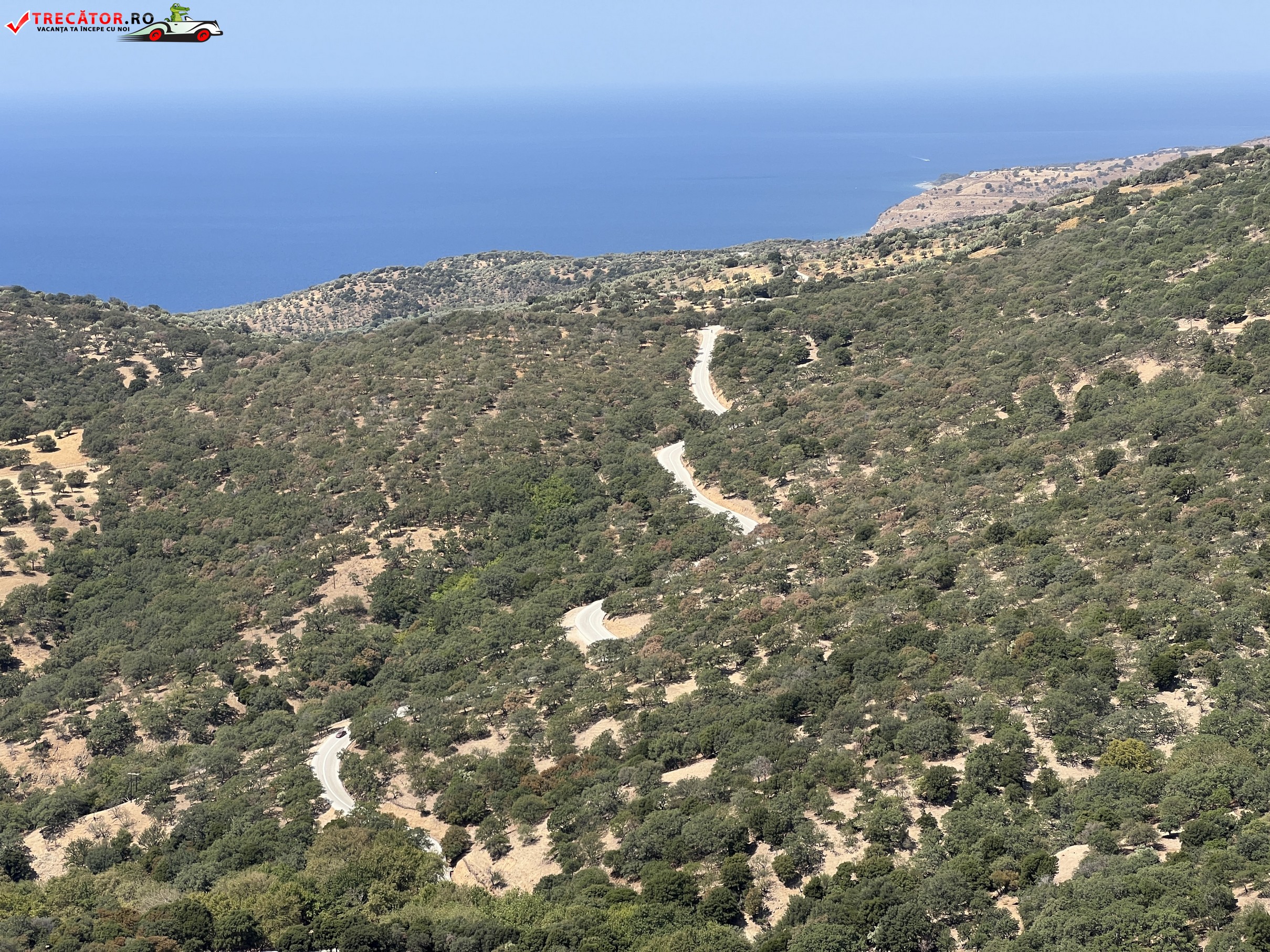 Pe partea dreaptă se deschid priveliști uimitoare asupra plajei Pachia Ammos și albastrului nesfârșit al Mării Egee, cu insula Gokceada (fostul Imvros grecesc) conturându-se la orizont.