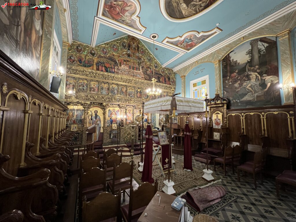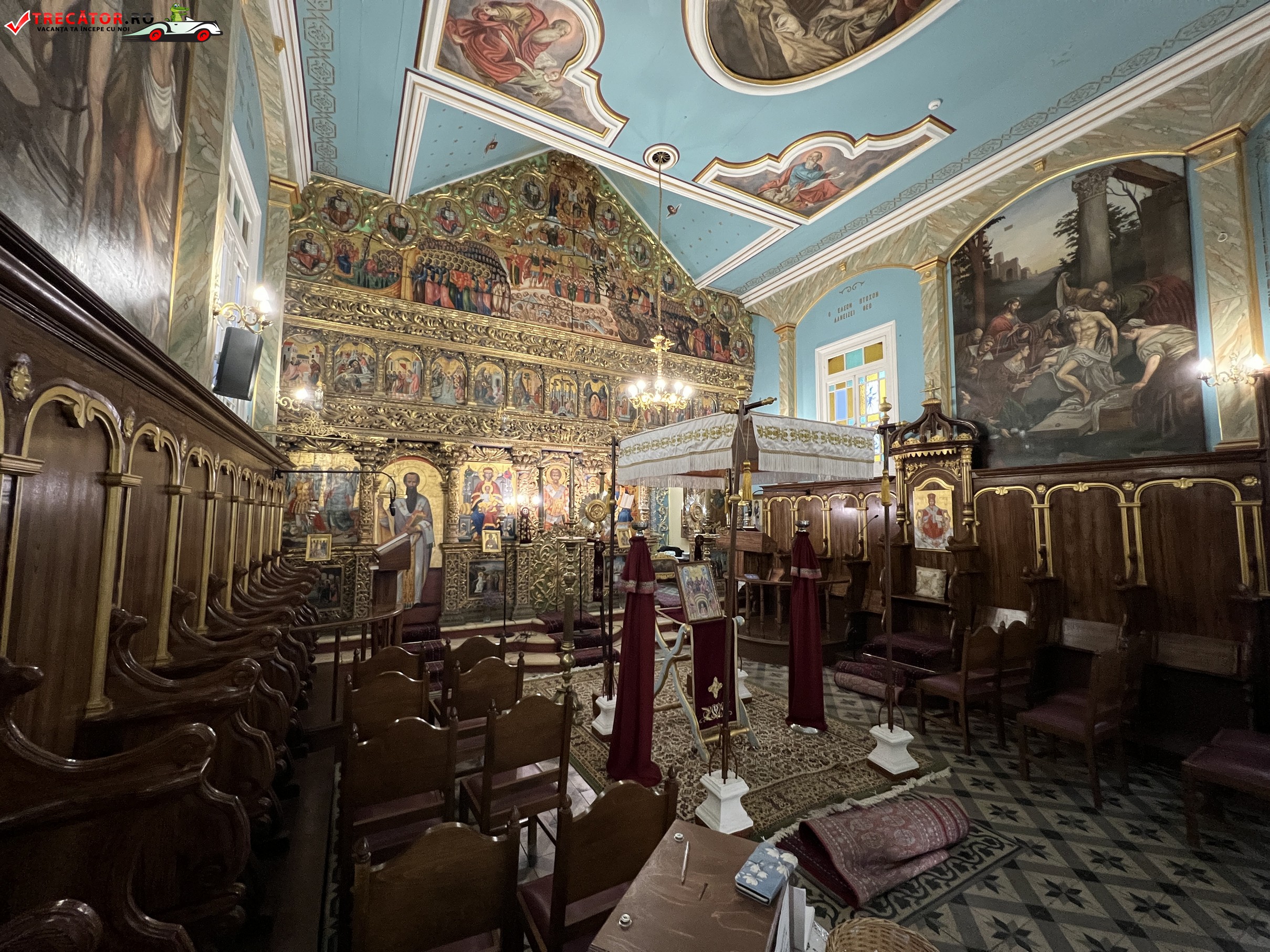 Biserica Agios Spyridon se remarcă prin arhitectura sa frumoasă și stilul său neoclasic. Fațada este decorată cu detalii elegante și are o cupolă impresionantă. În interior, biserica este bogat ornamentată cu fresce și icoane, care înfățișează scene religioase și sfinți.