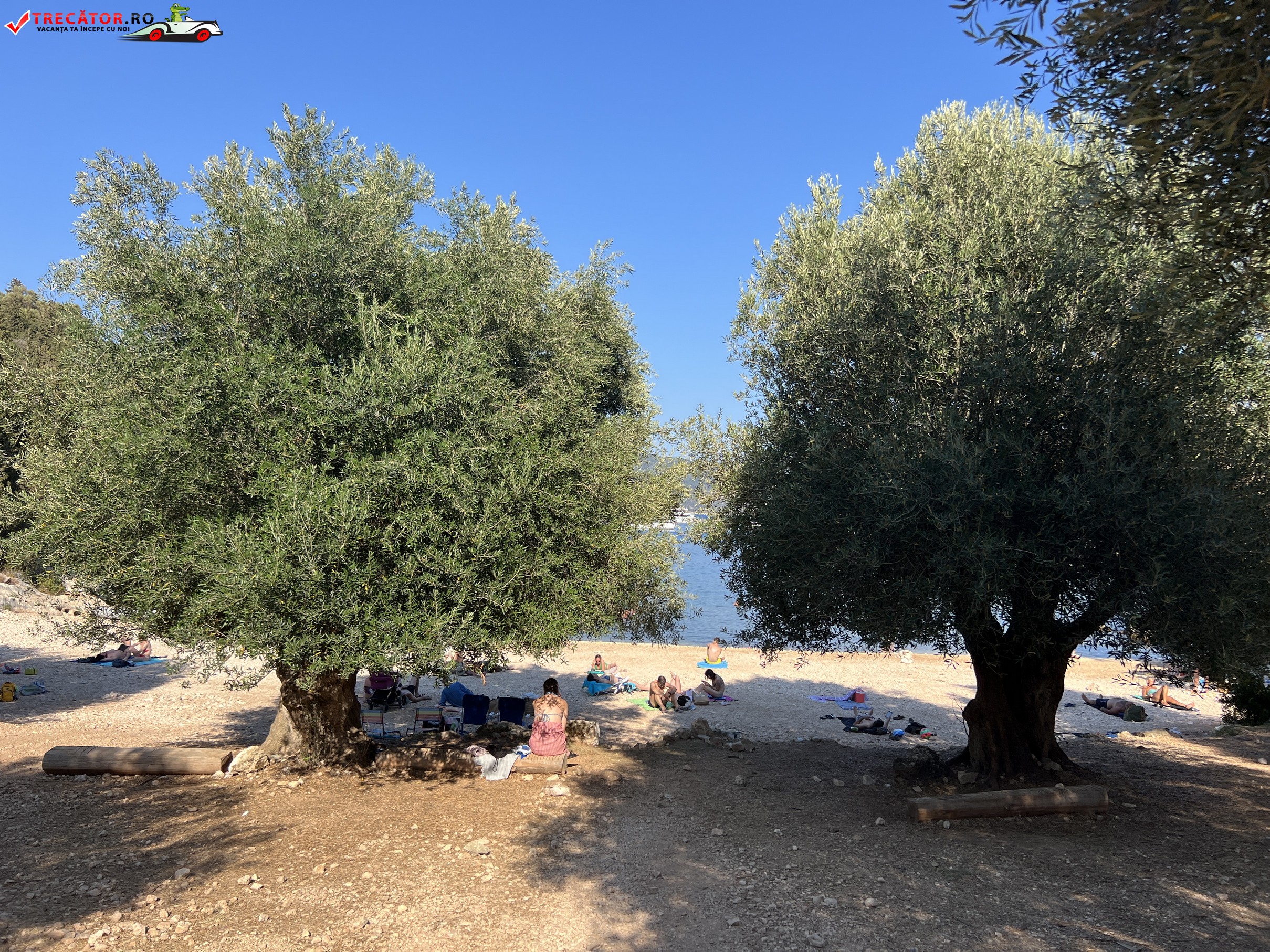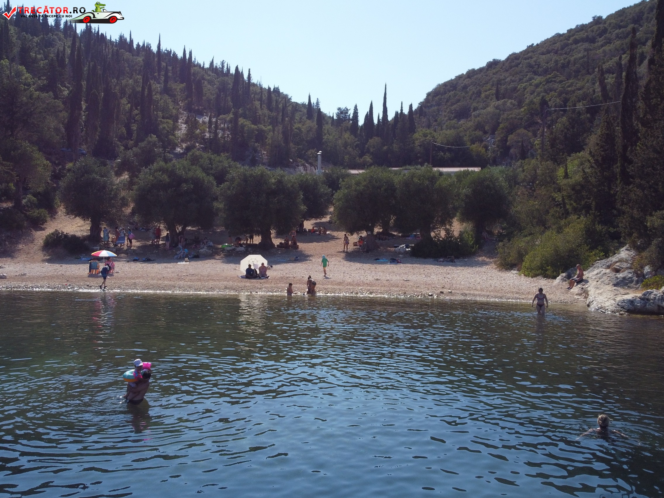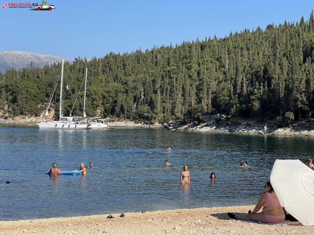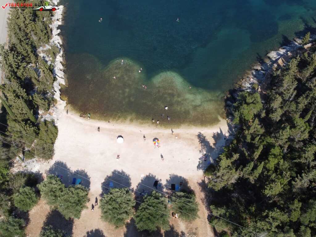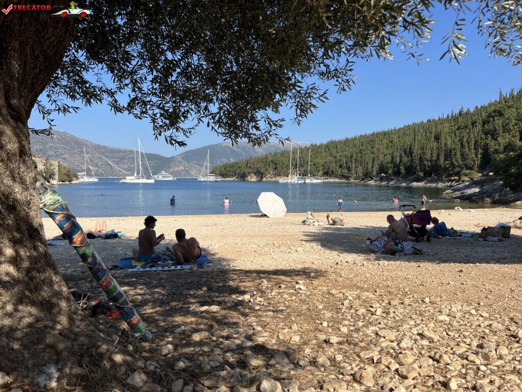 La aproximativ un kilometru sud de Fiskardo, de-a lungul drumului de coastă, întâlnim o plajă pe care nu se stă la umbră sub clasicele umbrele ci direct sub ramurile măslinilor crescuţi până aproape de malul mării.