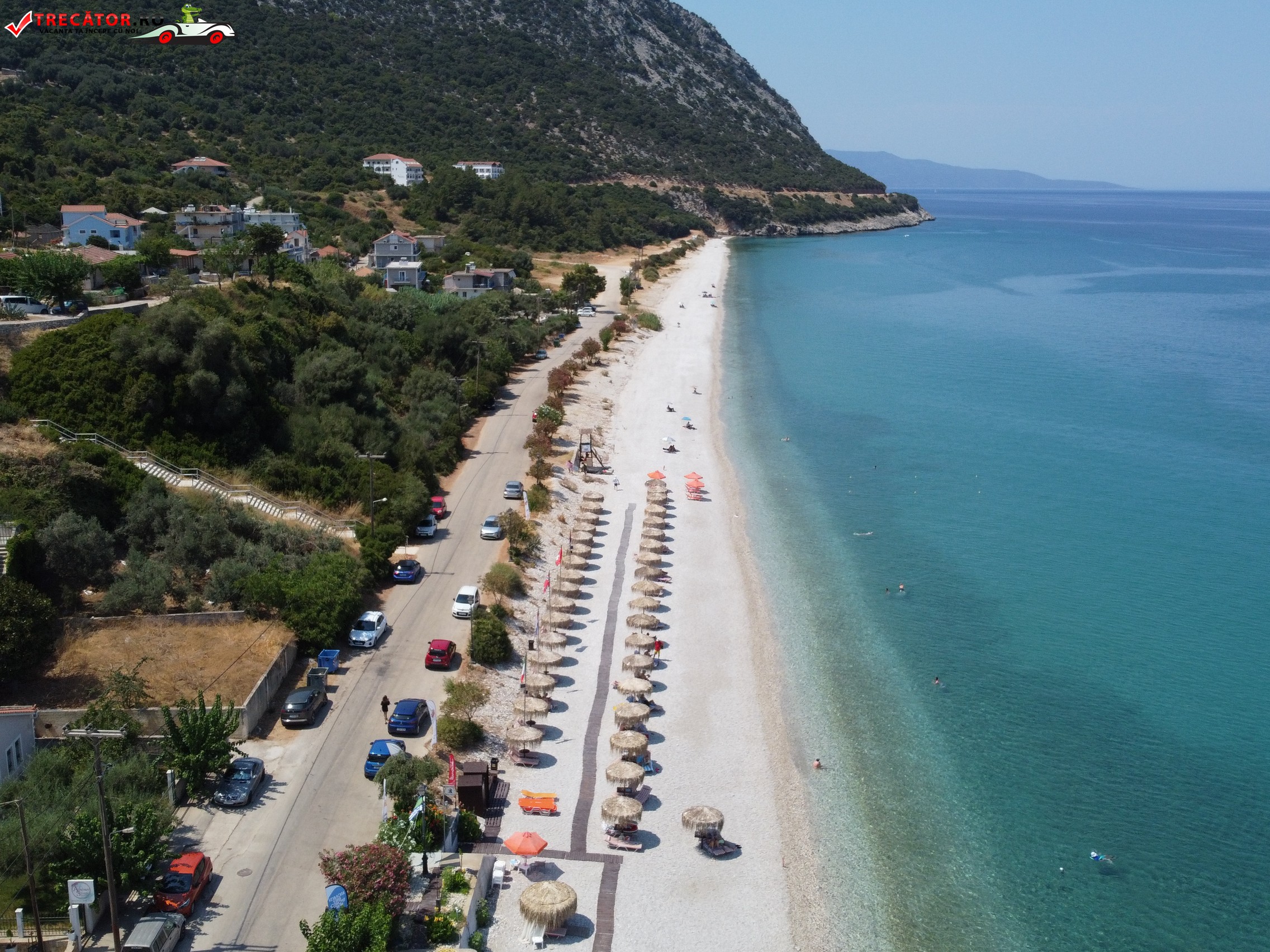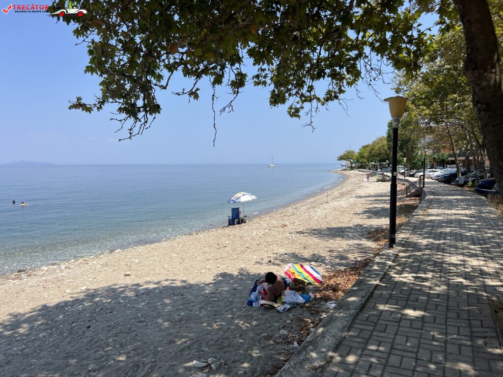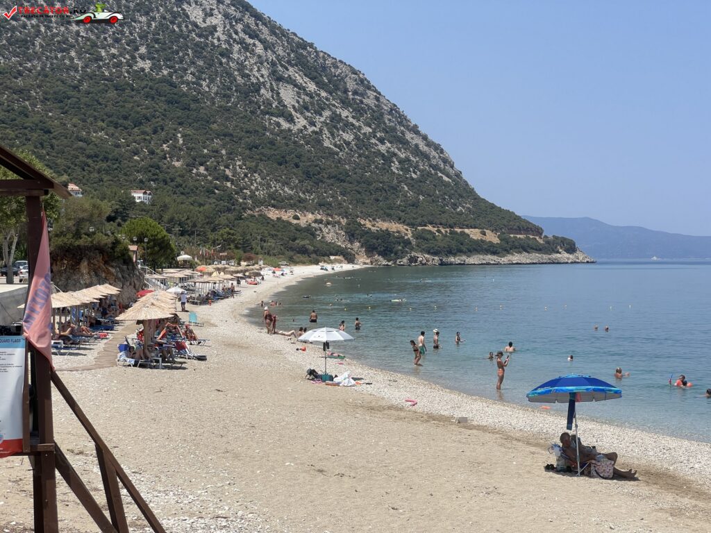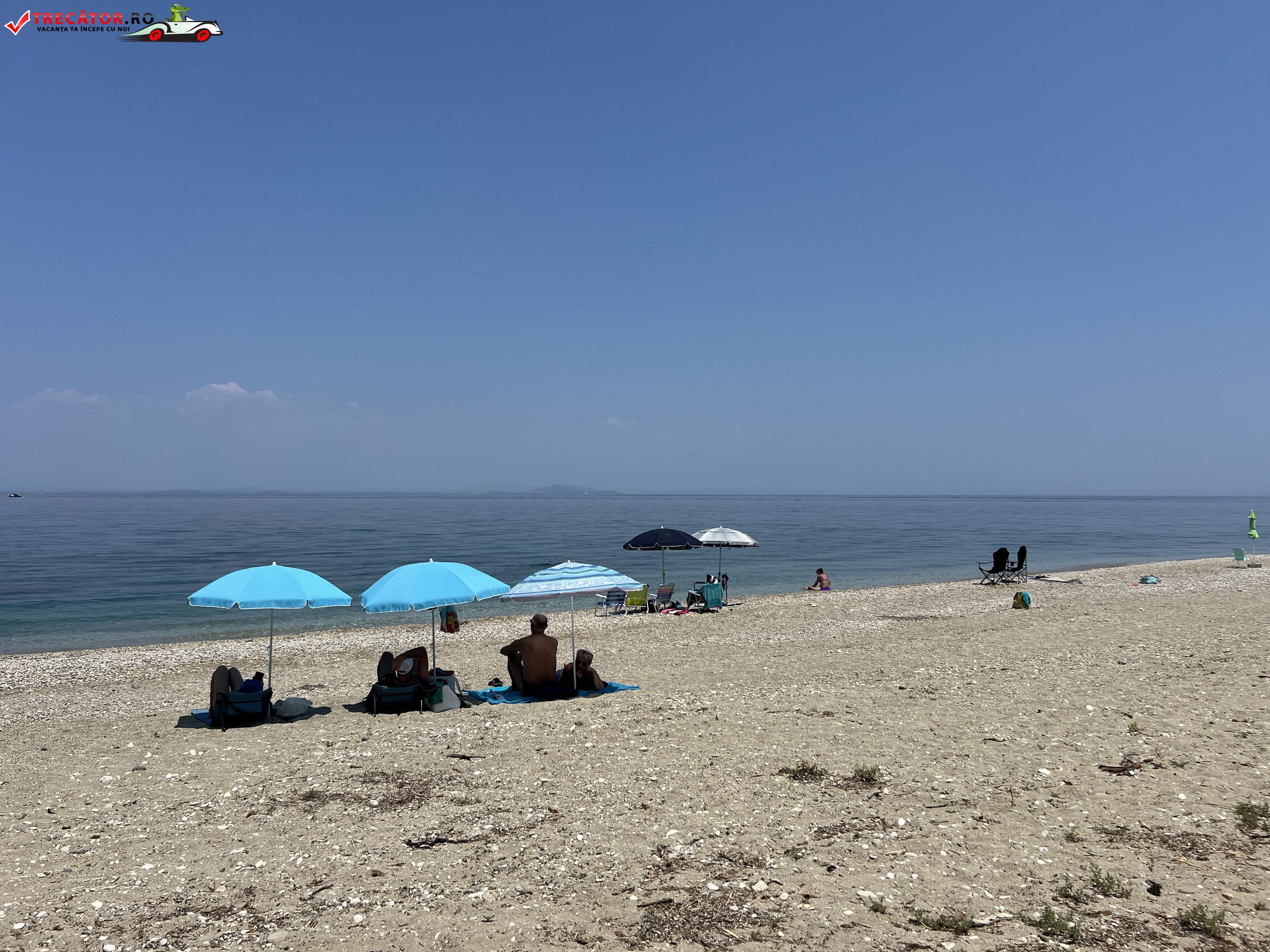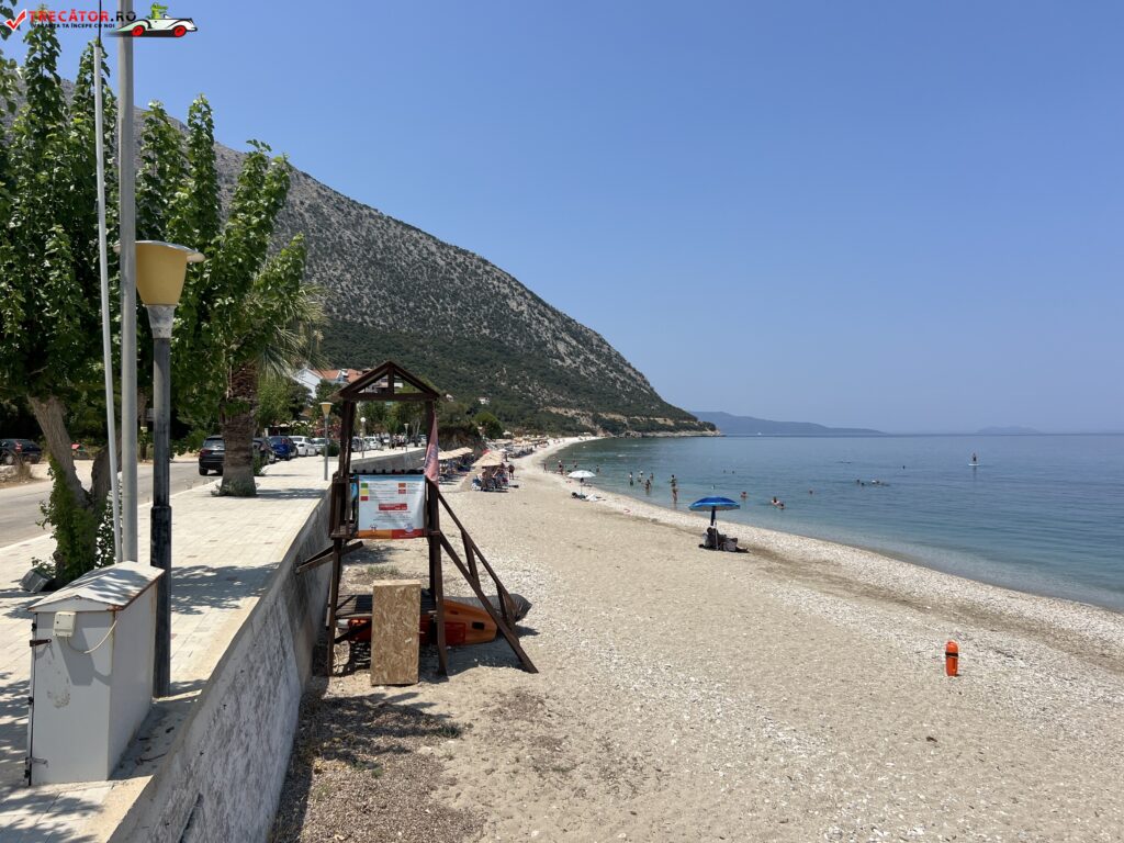 Dotată cu şezlonguri, umbrele şi o tavernă, plaja se întinde pe câteva sute de metri de-a lungul promenadei. Plaja se află foarte aproape de magazinele şi tavernele staţiunii.