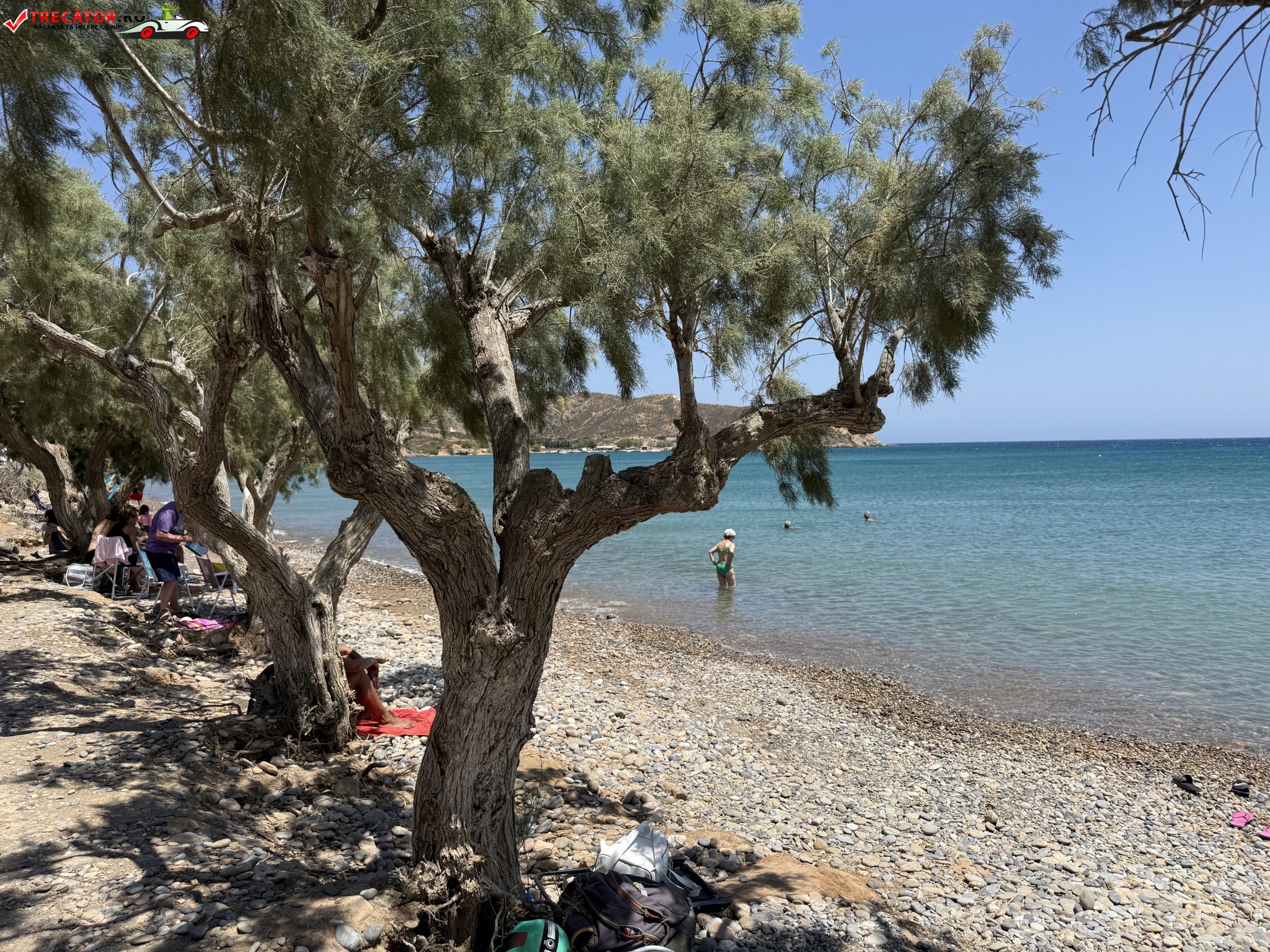 Kouremenos se întinde pe o lungime impresionantă de peste 1,5 km, fiind una dintre cele mai întinse plaje din zonă. Nisipul, fin și de culoare maronie, contrastează plăcut cu apa turcoază, iar tufișurile de tamarisk oferă umbră naturală și un aer sălbatic și autentic.