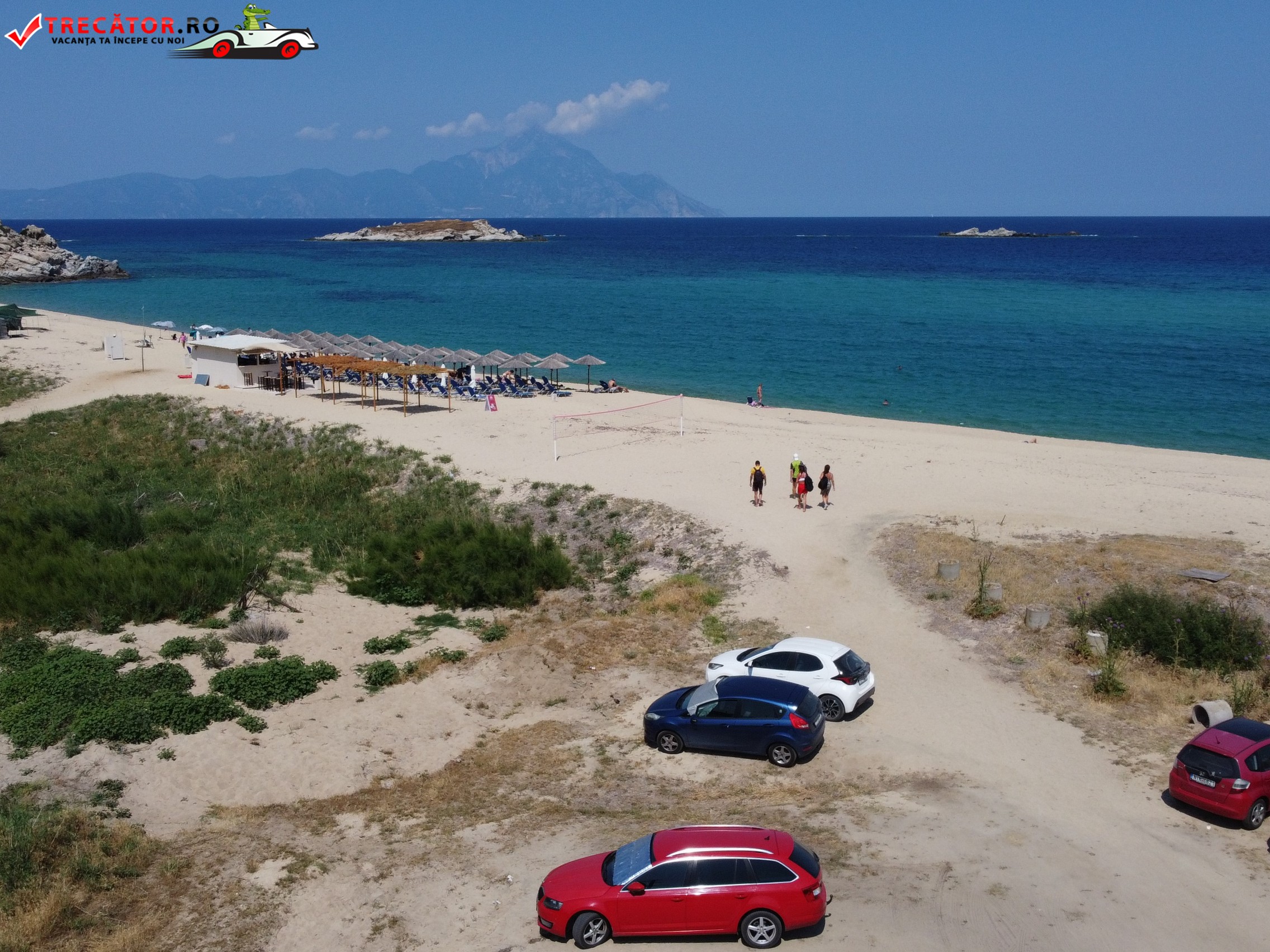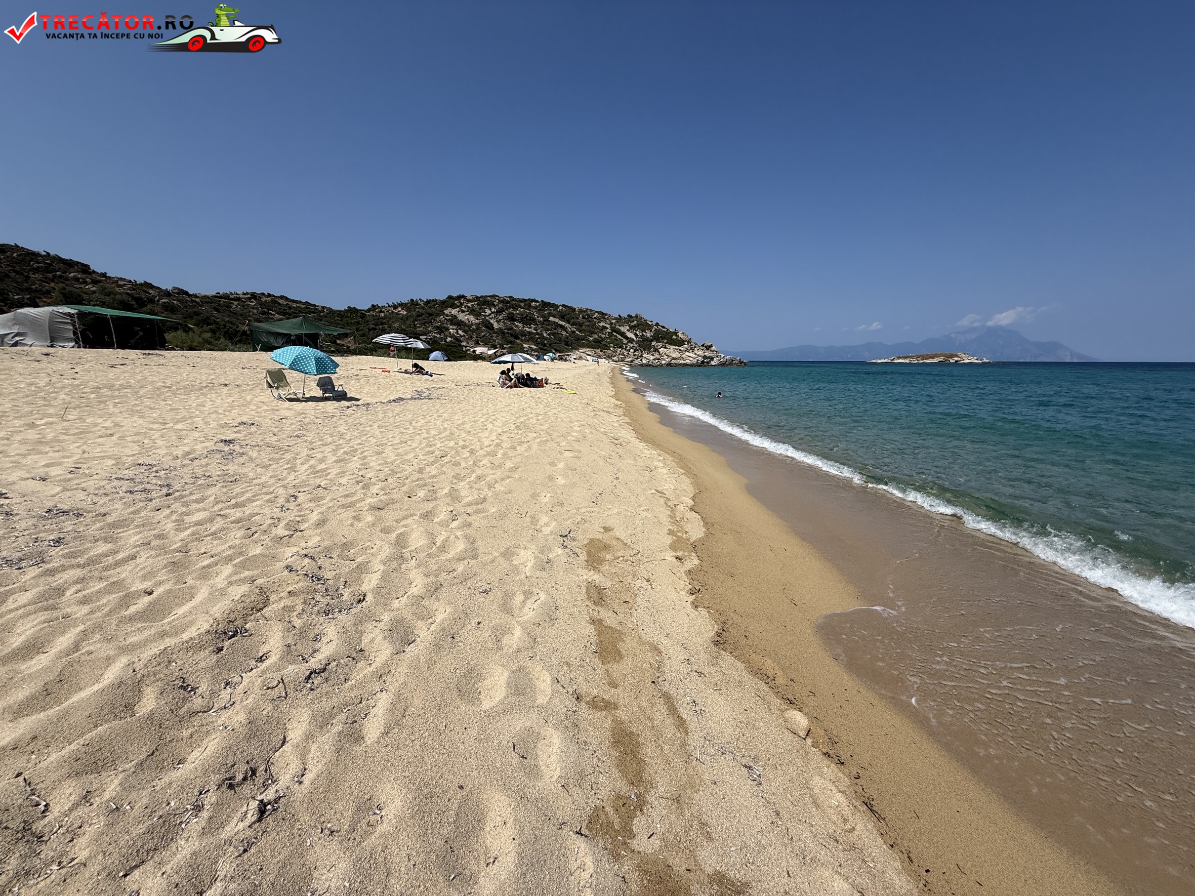 Unul dintre atuurile unice ale plajei este panorama asupra Muntelui Athos, care se poate admira în toată splendoarea sa de pe țărm, mai ales la apus. Atmosfera devine mistică, liniștită, aproape spirituală – un moment perfect pentru reflecție sau o plimbare solitară de-a lungul malului.