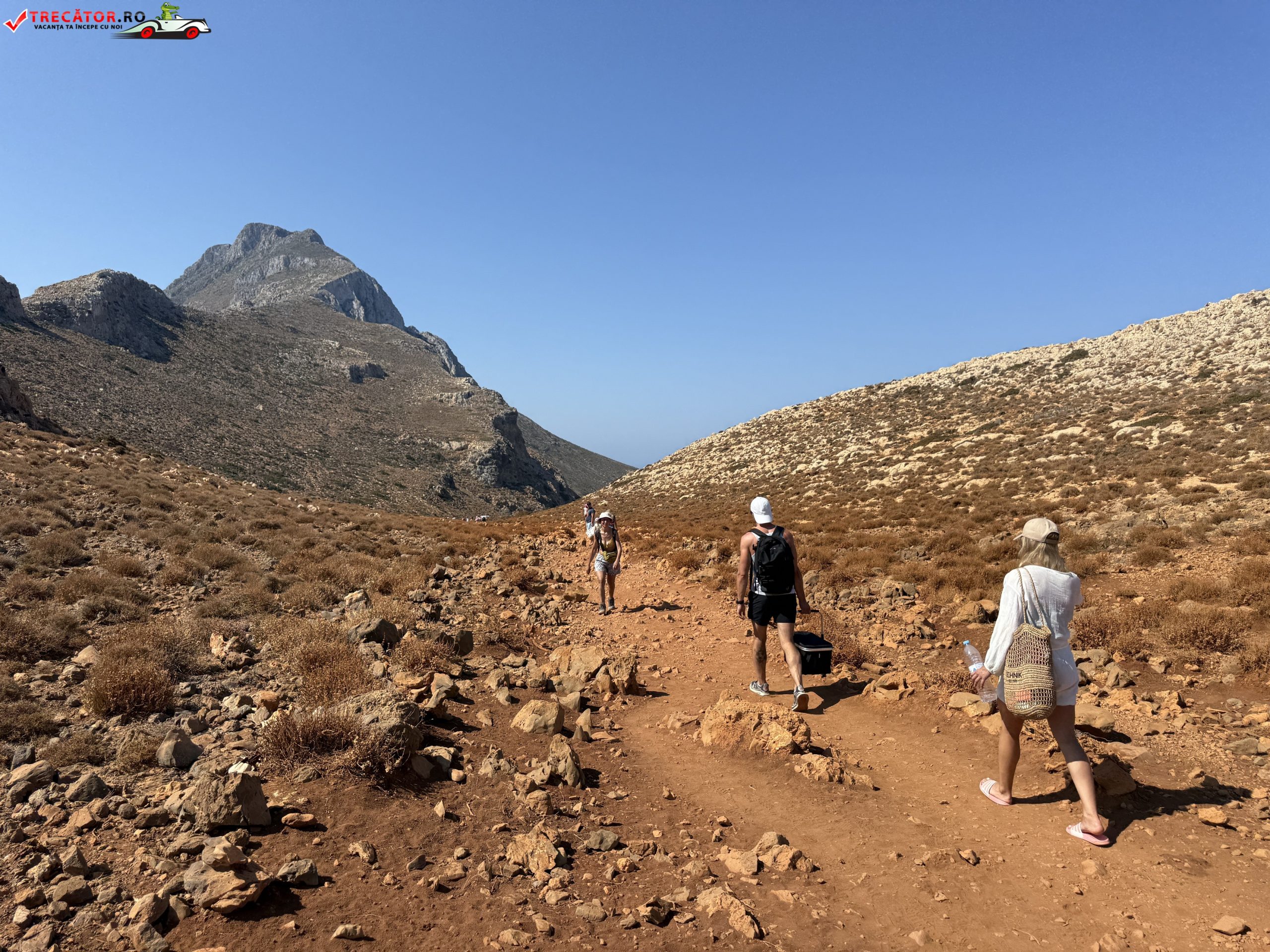 La un moment dat, după ce am condus cu multă prudență, drumul era din ce în ce mai jos. Era târziu (parcă deja erau câteva mașini lăsate pe lângă drum), așa că am lăsat mașina acolo și ne-am pregătit pentru plimbarea de aproximativ 5 km spre locul unde începe drumul spre plajă. În realitate, distanța de la parcare până la Balos e cam de 2–2,5 km cu o coborâre abruptă ce durează în jur de 20–30 de minute.