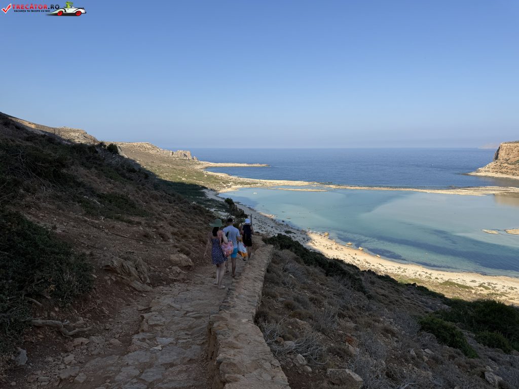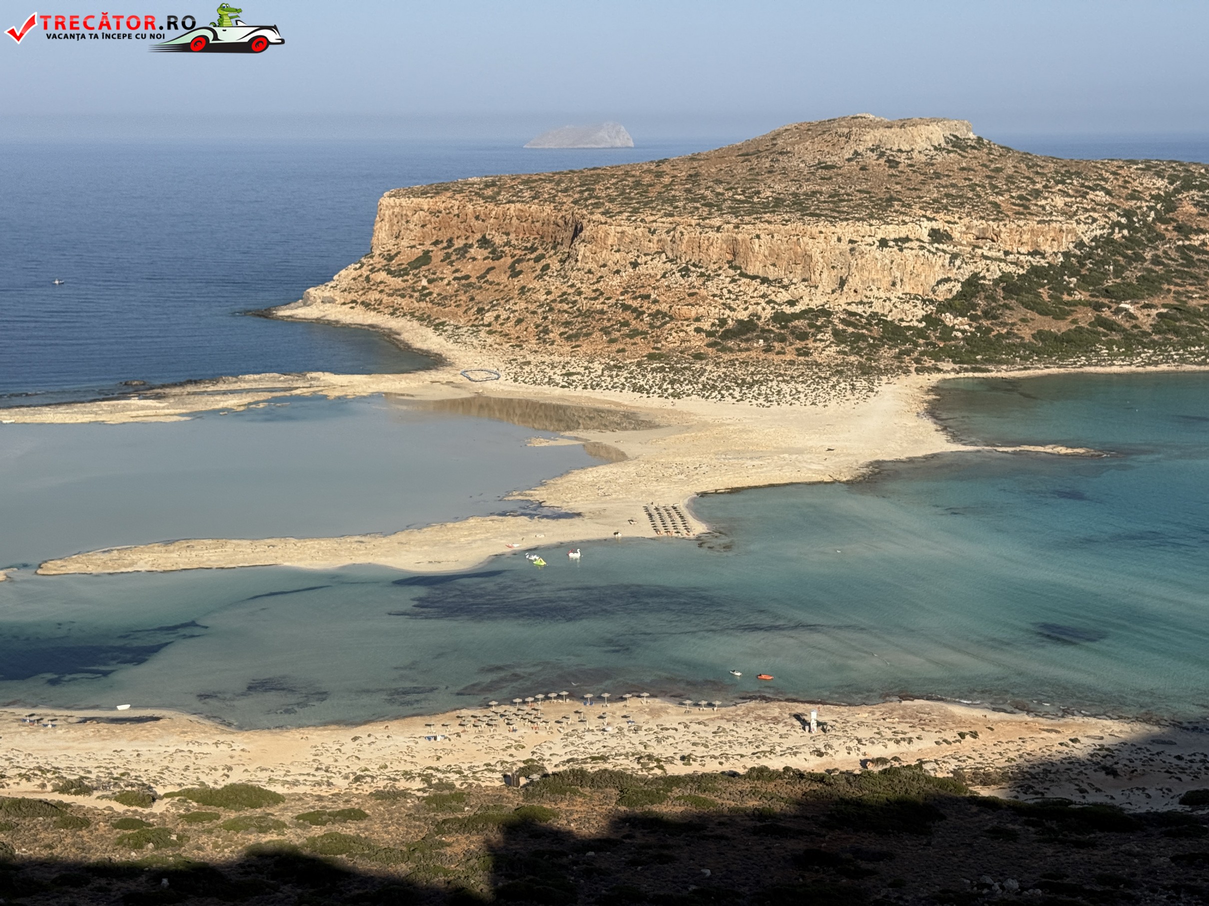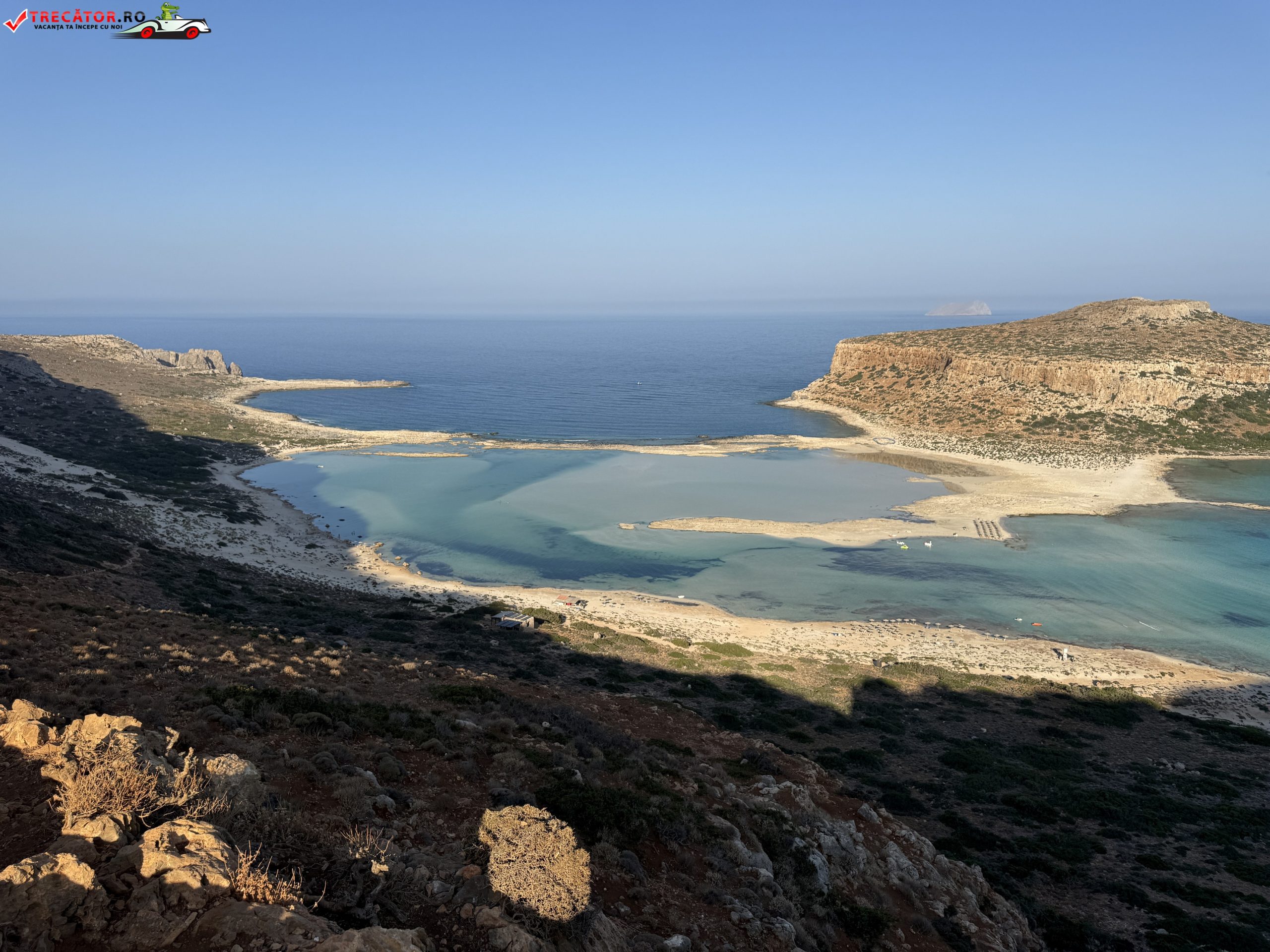 Dar, din nou, perspectiva schimbată — de data asta de sus — e ceva ce nu ocolești. Întinzătura lagunei, salba de turcoaz, formațiunea “ciupercă” dintre mare și lagună, și conturul insulei Imeri Gramvousa în depărtare — totul e cinematografic.