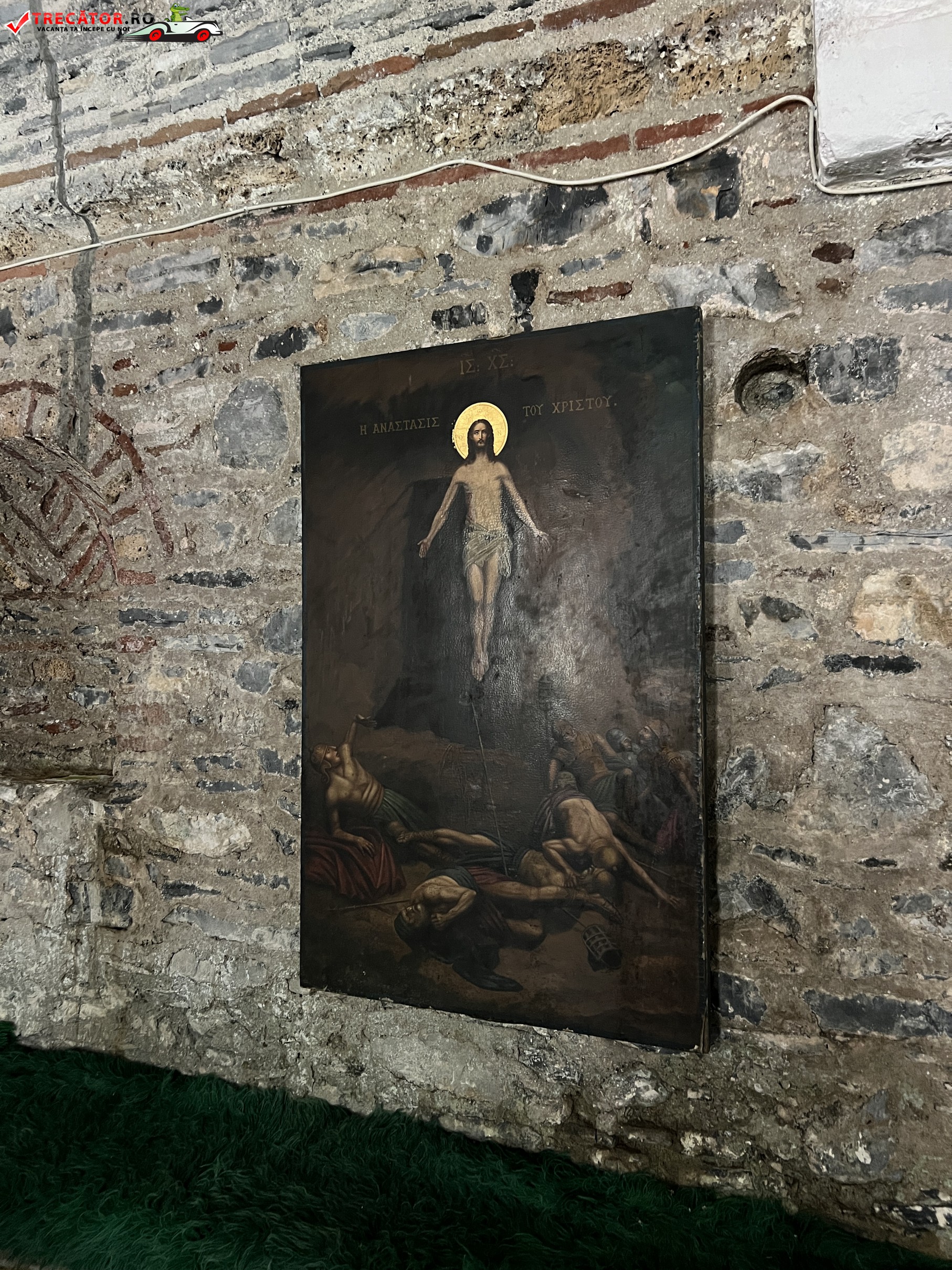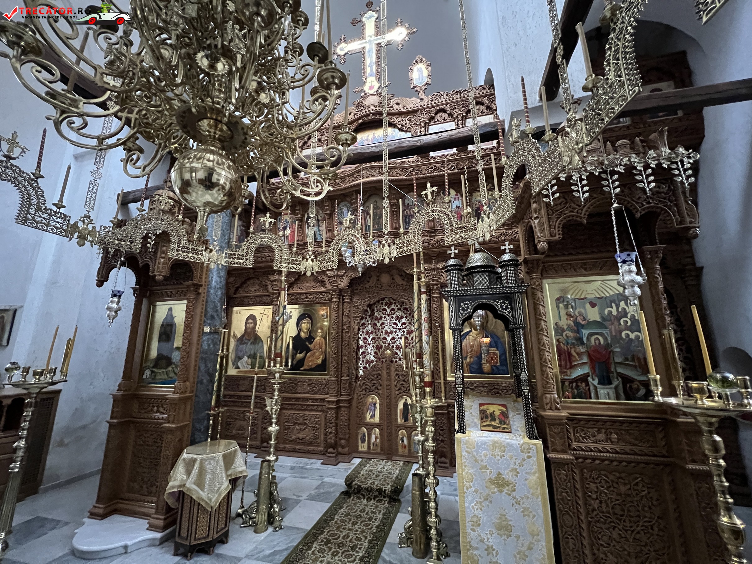 Prima reședință a Sfântului Dionisie, o peșteră la aproximativ douăzeci de minute de mănăstire, servește acum ca altar și hrană monahului. Peștera Sfântă, sau Agion Spilaion în greacă, a fost construită sub o stâncă suspendată chiar deasupra unui izvor natural. Micul paraclis cuprinde un spațiu de devoțiune în care călugărul a cinstit sfânta liturghie, precum și un mic șopron care a servit drept adăpost. Această capelă faimoasă atrage în fiecare an vizitatori care doresc să asculte și să guste apa sfințită.