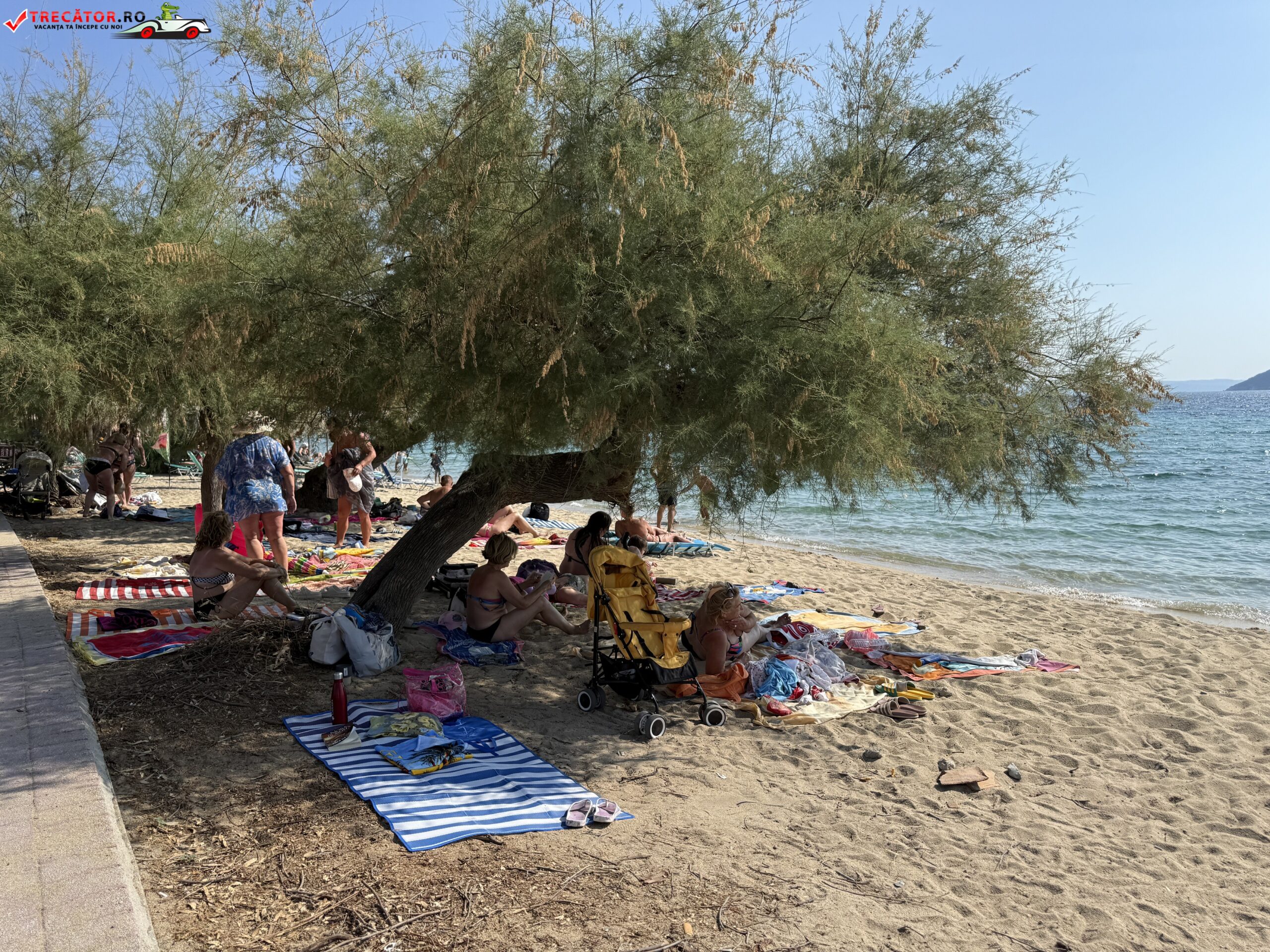 Ceva aparte este umbra naturală. O parte a plajei este flancată de pini, ceea ce înseamnă că poți avea un colț răcoros fără să depinzi mereu de umbrelă. Tot aici găsești cabine de schimb, dușuri, toalete și acces ușor către cafenele și taverne.
