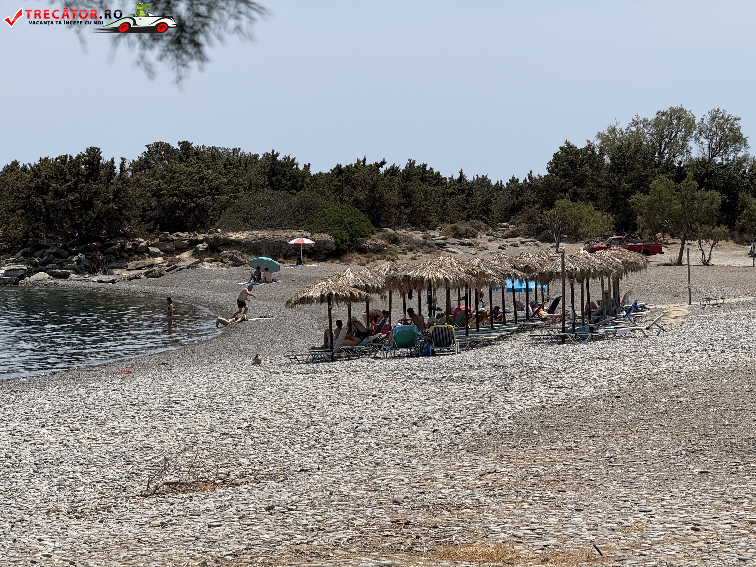 Vizitatorii se bucură de șezlonguri și umbreluțe de plajă disponibile pentru închiriere (în jur de 10 € pentru două șezlonguri și o umbrelă, conform vara 2024). Există taverne mici și beach bar-uri în apropiere, unde poți savura preparate locale, iar facilitățile cum ar fi dușuri, cabine de schimb și parcare sunt disponibile.