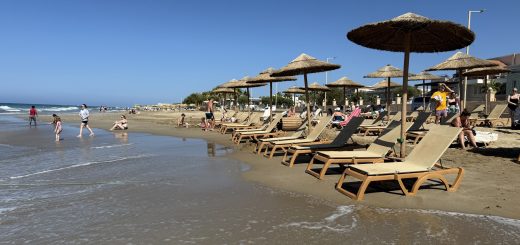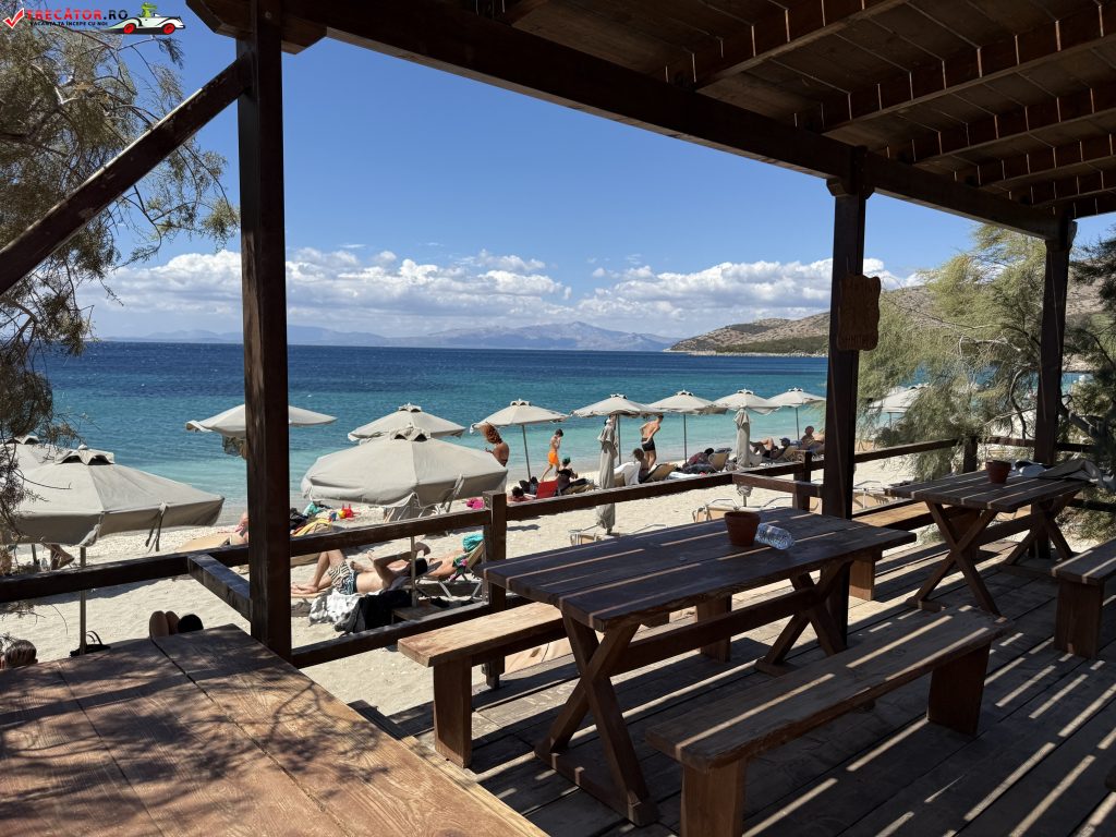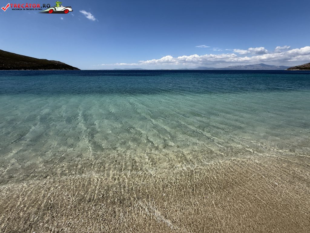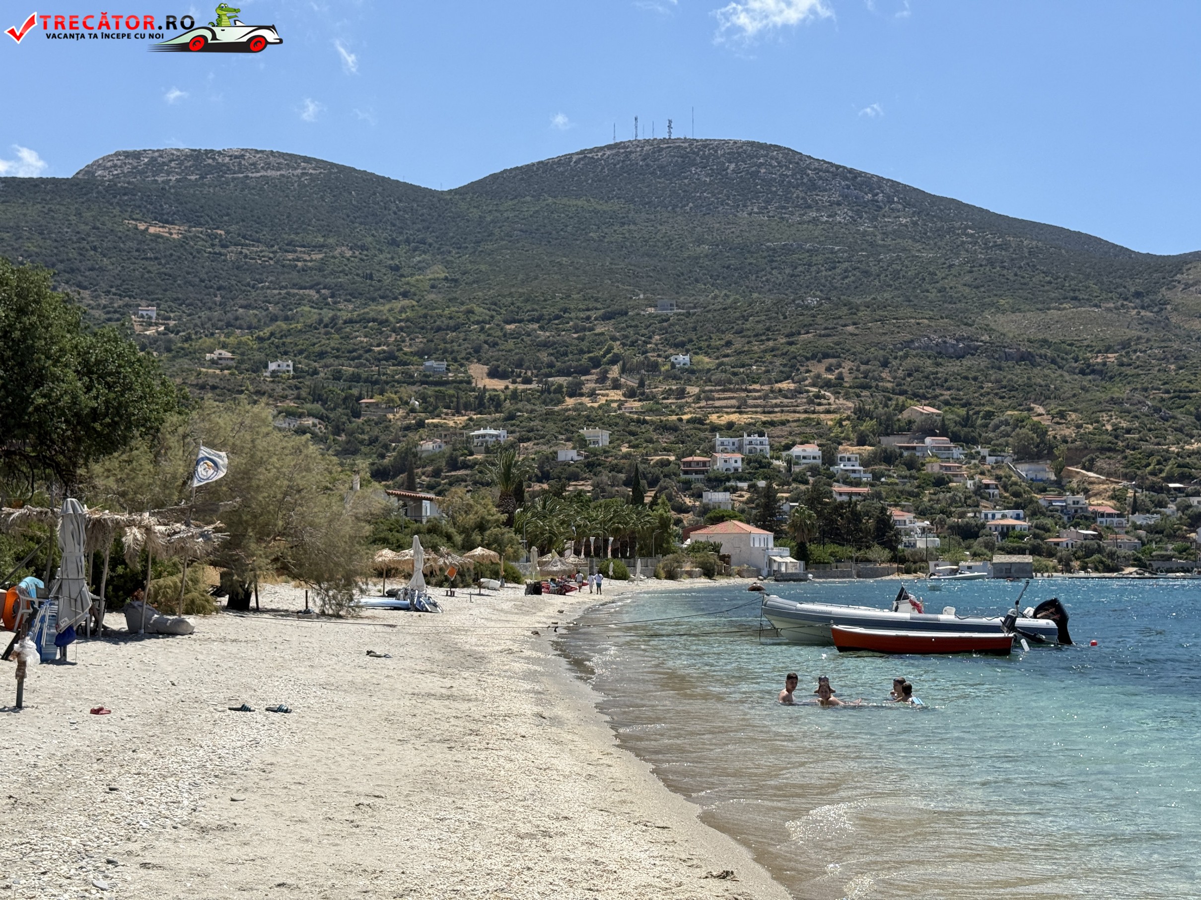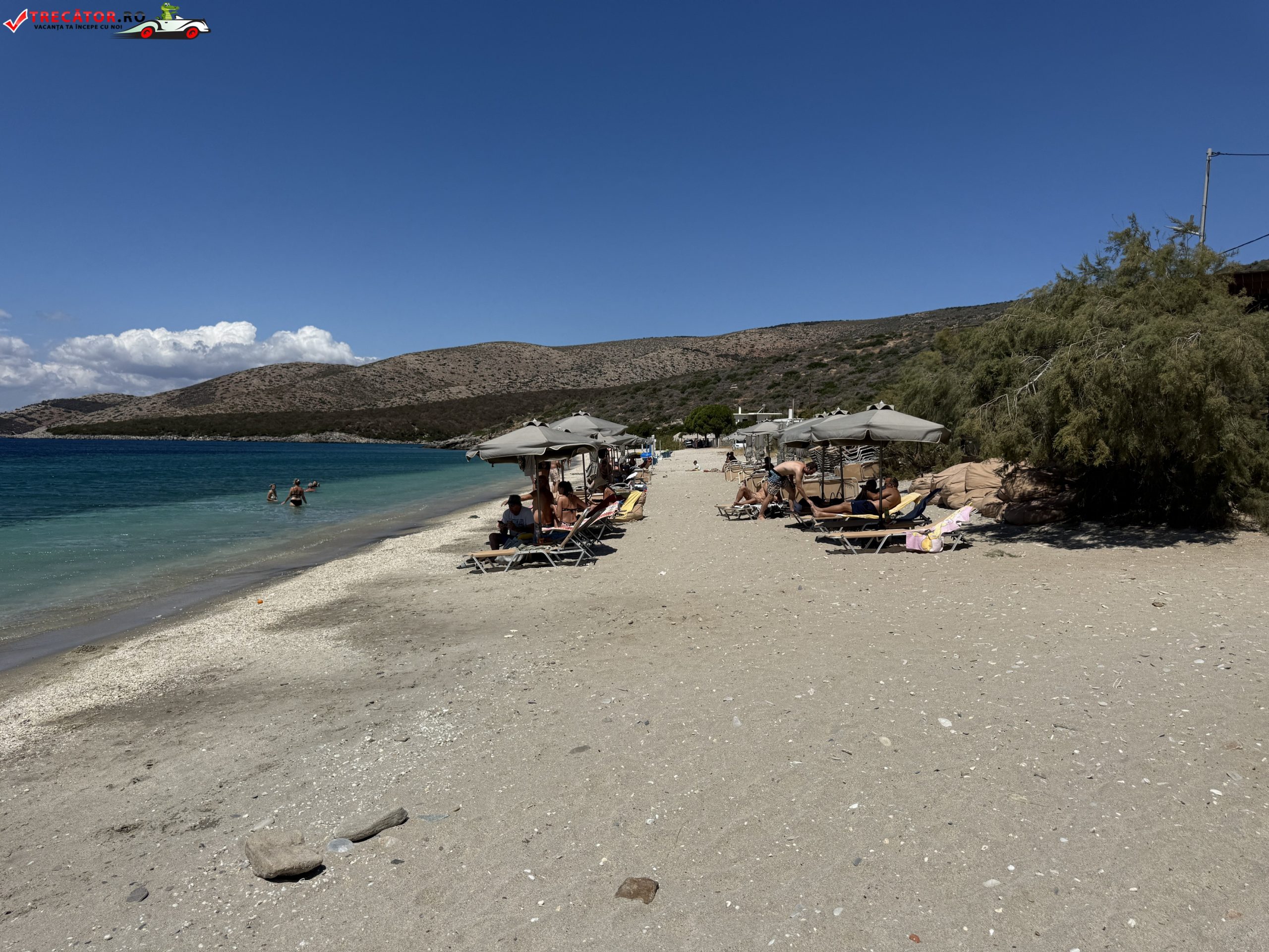 Plaja este foarte aproape de sat, la doar câteva minute de mers pe jos de reședințele locale. Apele sunt calme și clare, perfecte pentru baie, snorkel sau relaxare la mal. Vegetația mediteraneană din jur, natura te inspiră liniște și contemplație. De asemenea, traseele de drumeție atrag vizitatori: ruta care urcă spre vârful Pyrgari, trecând pe lângă vechile cariere romane, oferă priveliști impresionante asupra coastei și mării.