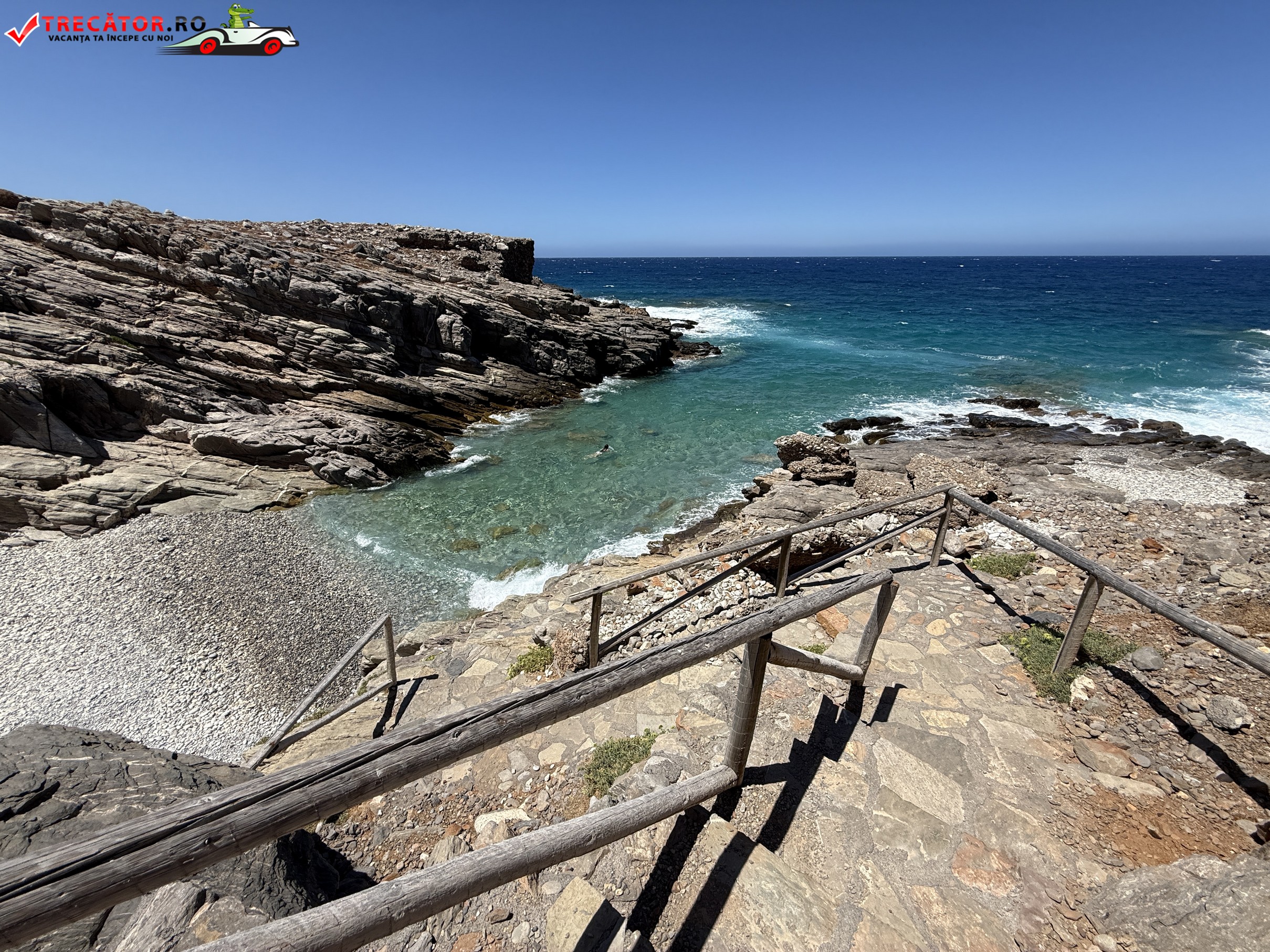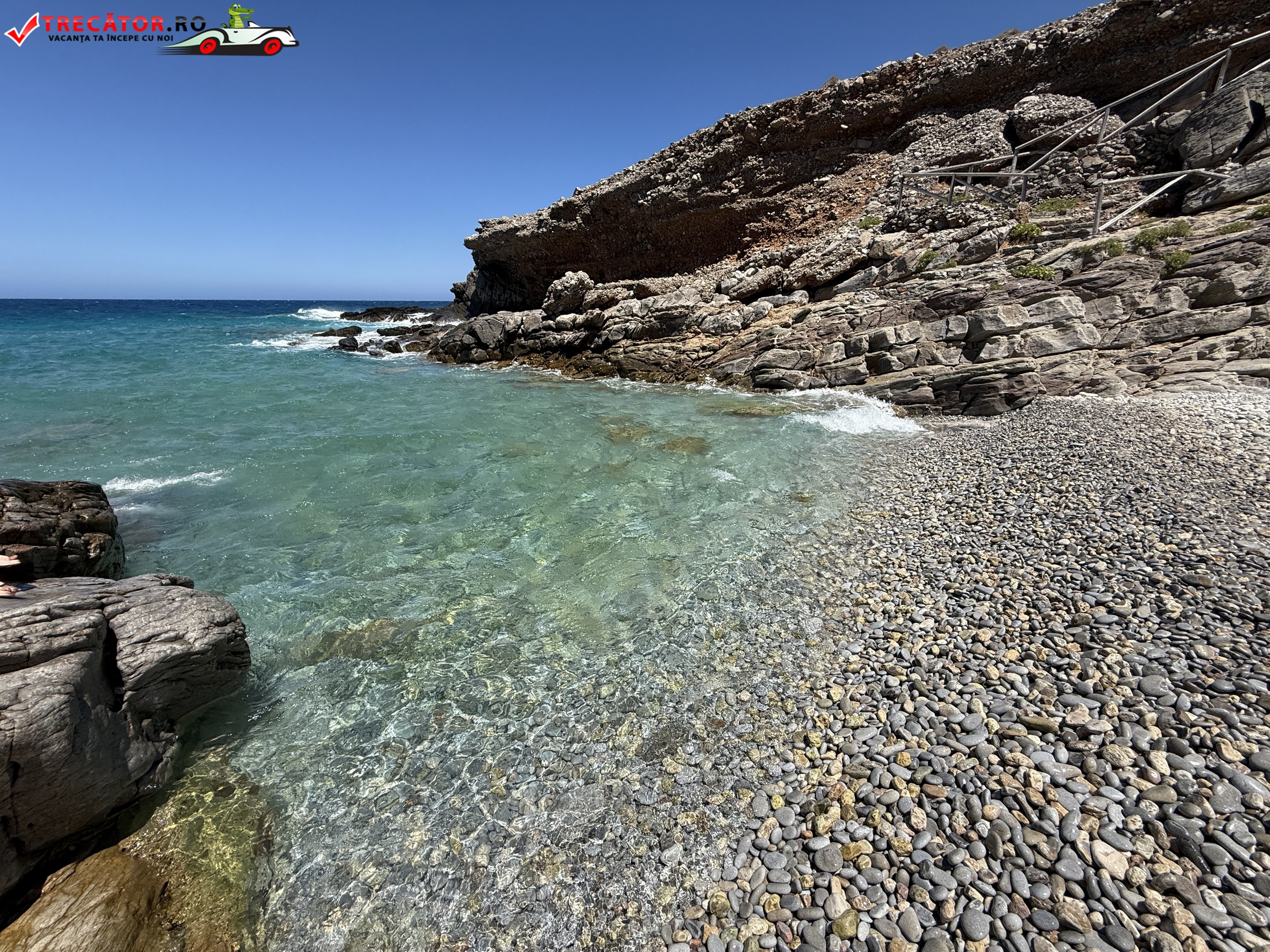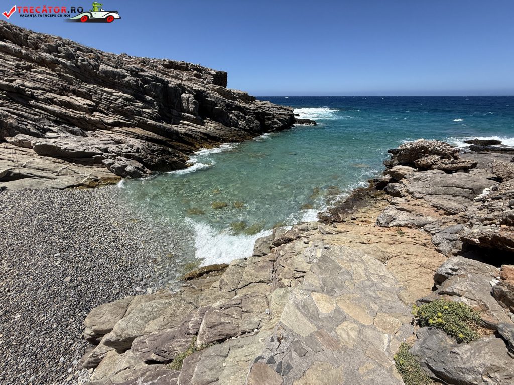 Extinzându-se pe o distanță de circa 40 metri, plaja este în albastru profund doar prin simplitatea sa. Este acoperită de cioburi de piatră bej, marginită de stânci abrupte și oferă ape limpezi ce invită la o scăldată liniștită. Pe pontonul naturii, acest loc este o raritate greu de egalat — fără umbrele, șezlonguri, taverne sau indicii de civilizație modernă.