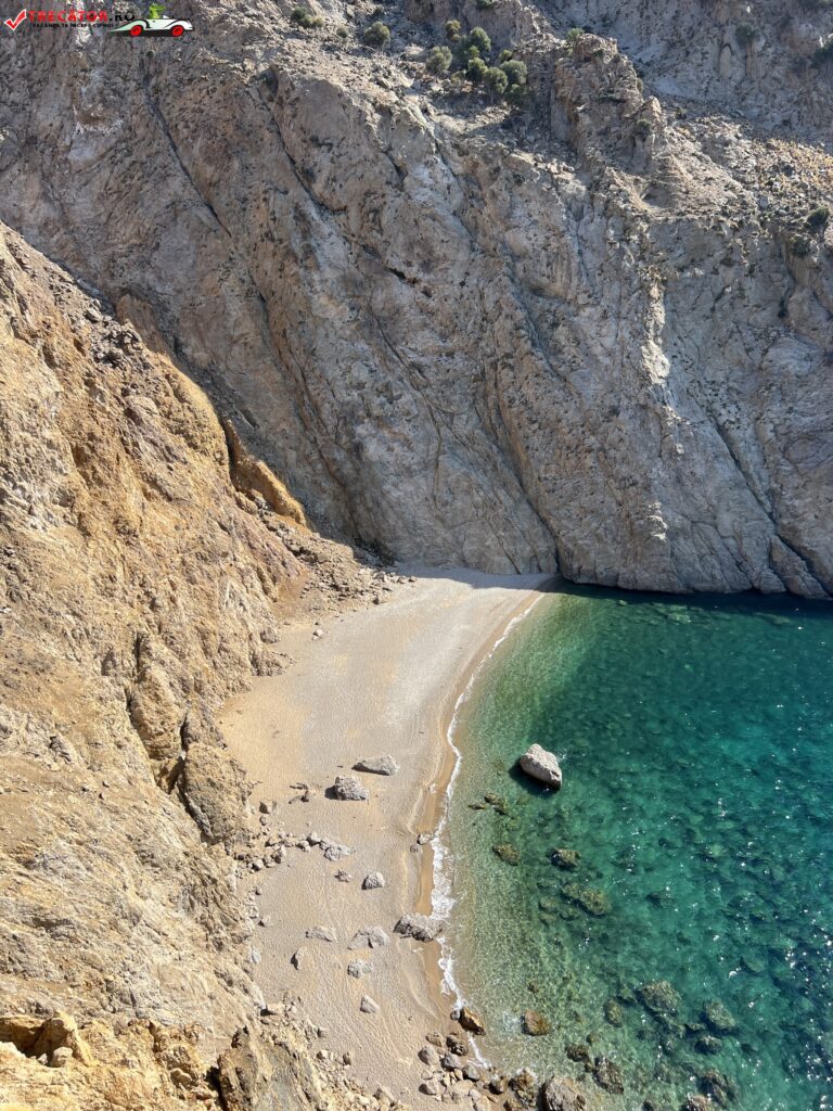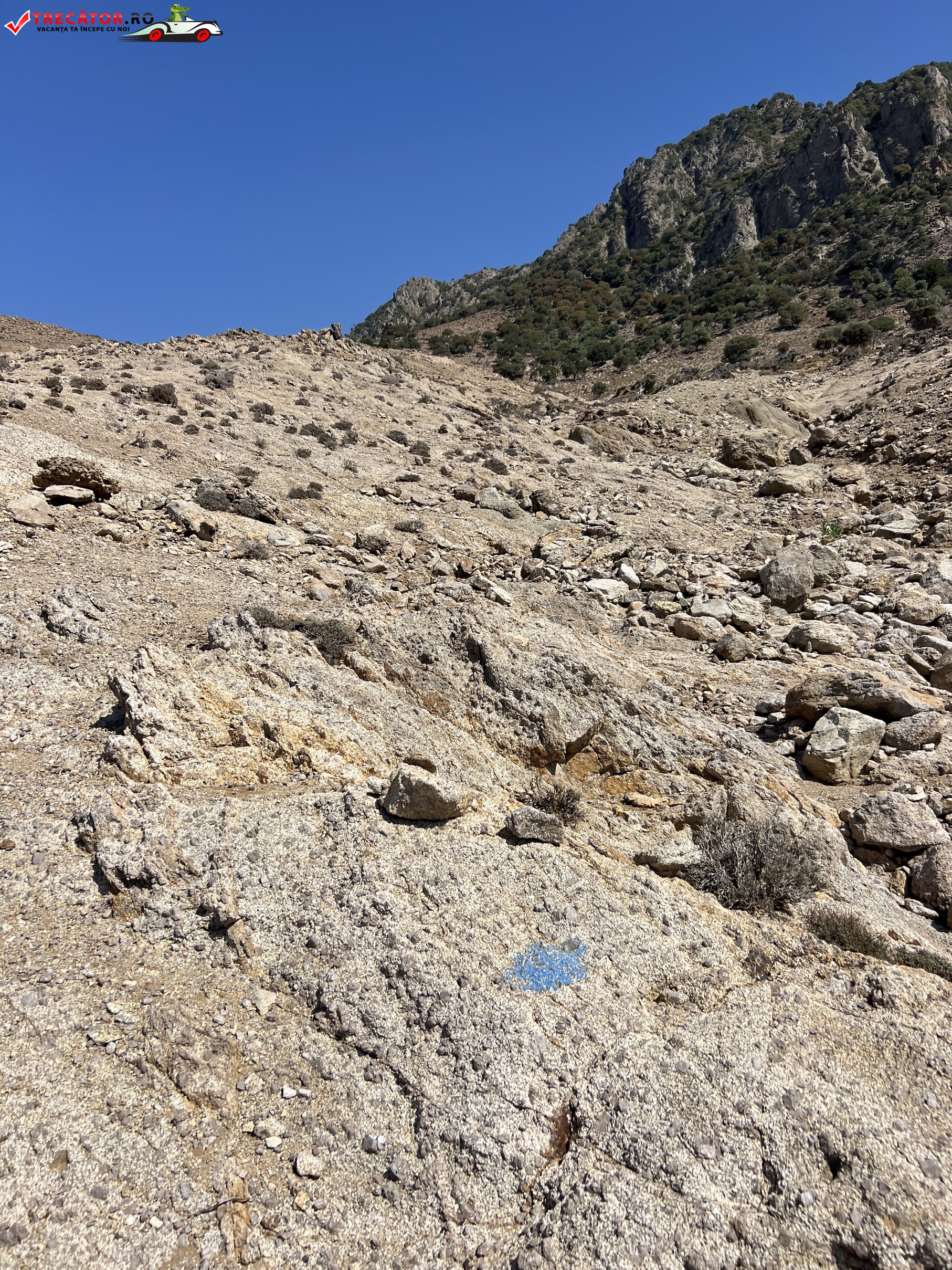 Traseul este marcat cu cerc albastru dar datorită faptului că a fost făcut cu mulți ani înainte și nu mai este îngrijit abia mai poți să îl observi. Noi am făcut de la plaja Pachia Ammos aproximativ 30 de minute.