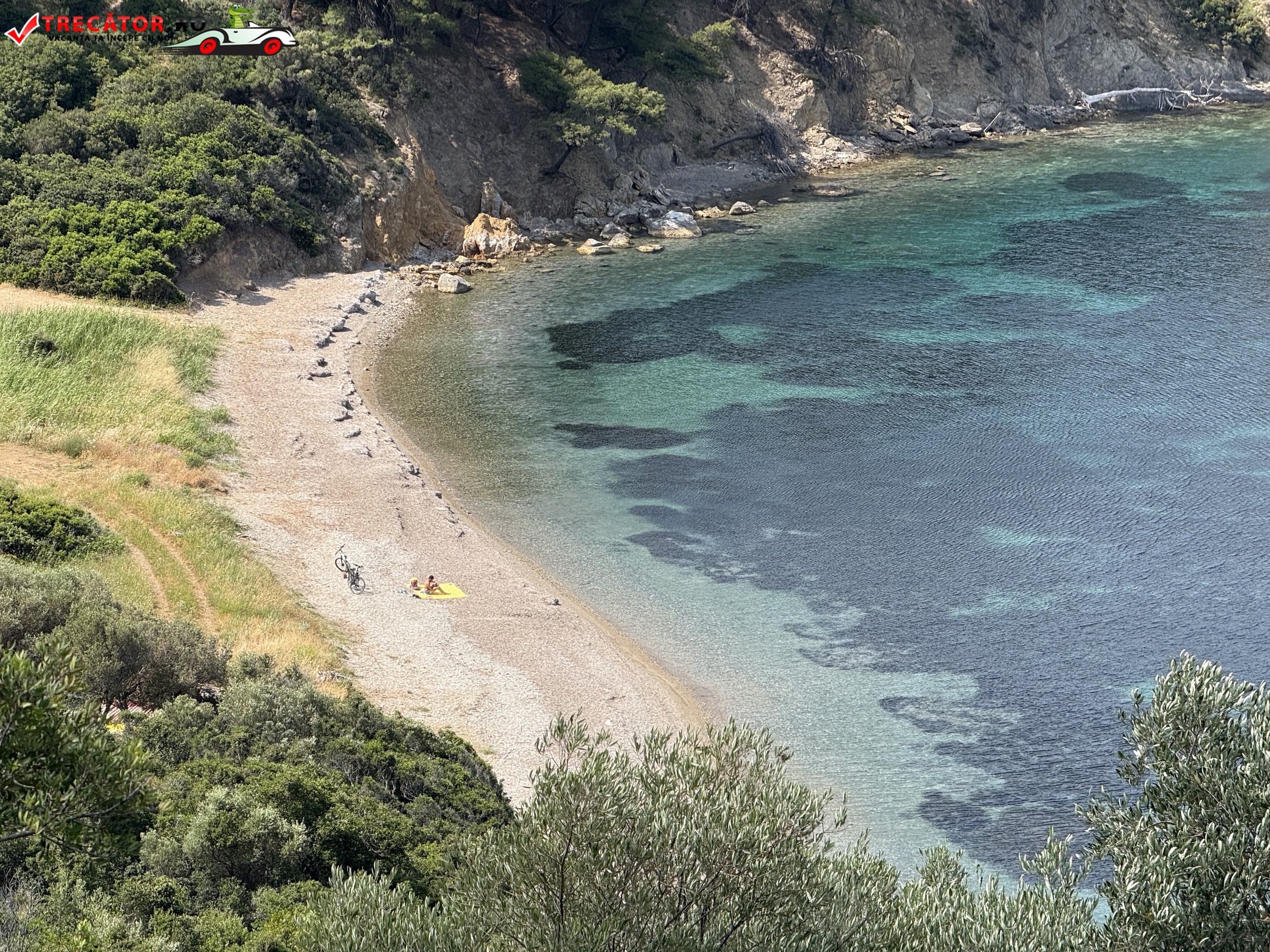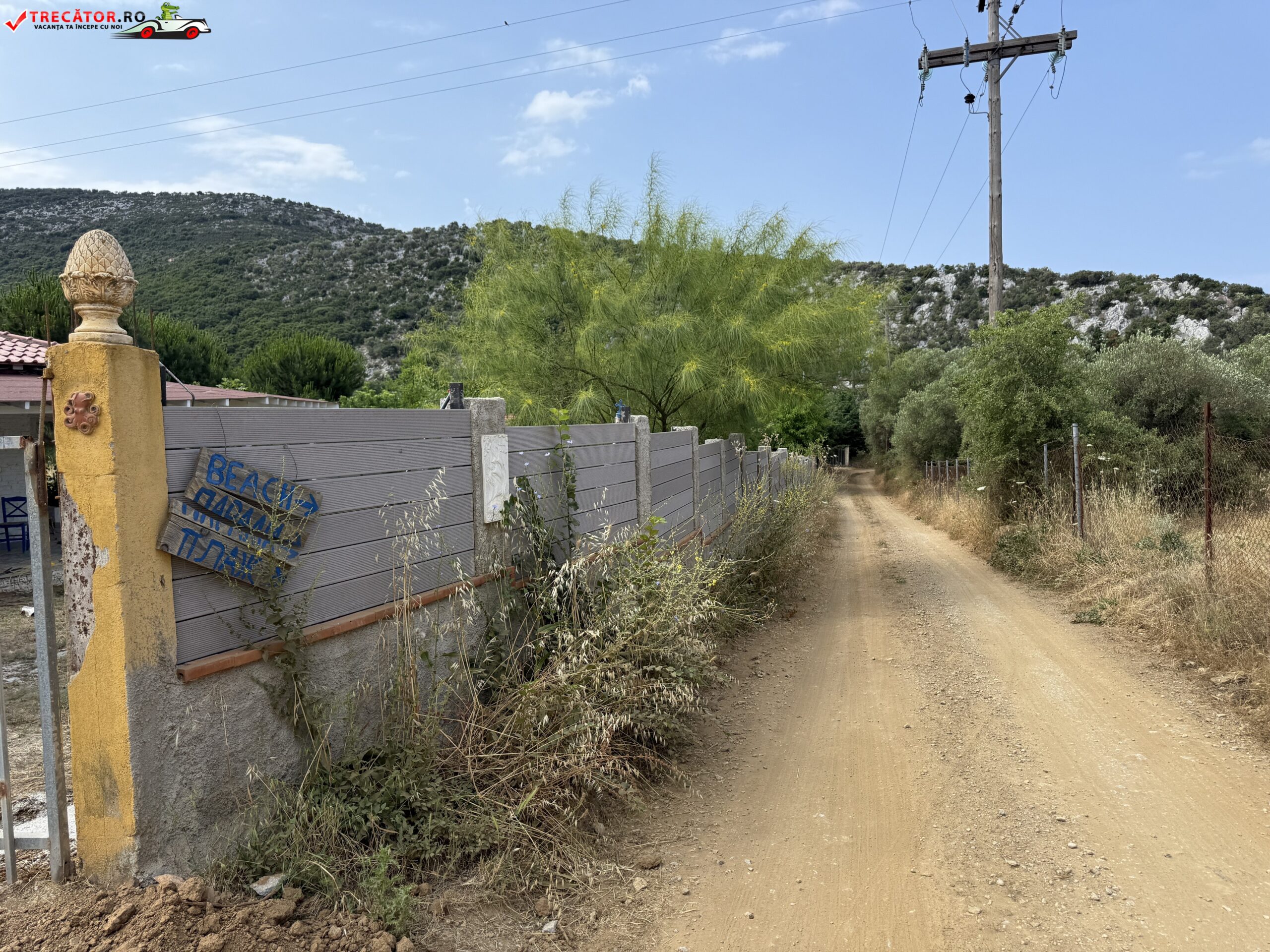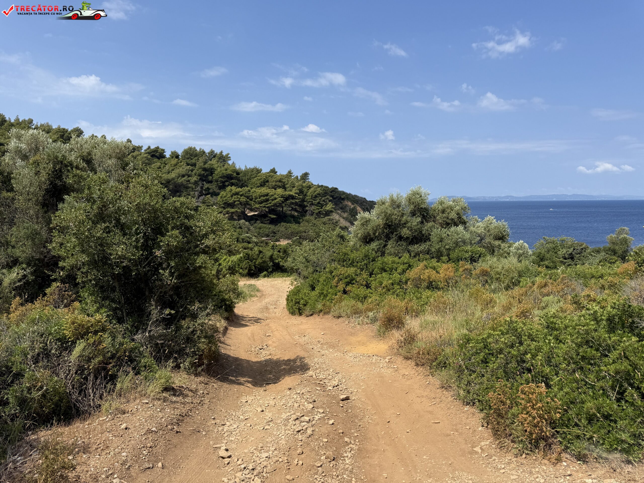 Este genul de traseu pe care îl găsești doar dacă îl cauți intenționat, eventual cu ajutorul unei hărți locale sau GPS. Drumul neasfaltat, cu pietriș și denivelări, te duce printr-o zonă sălbatică și spectaculoasă, până aproape de coastă. Acolo, după o scurtă coborâre printre pini și stânci, se deschide în fața ta Secret Beach – o adevărată bijuterie ascunsă a Sithoniei.