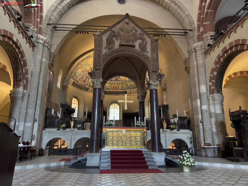 Unul dintre cele mai prețioase obiecte de artă din interiorul basilicii este Altarul de Aur, realizat în anul 835 de către meșterul Vuolvinio. Acest altar impresionant este decorat cu scene sculptate din viața lui Hristos pe partea frontală și episoade din viața Sfântului Ambrozie pe partea din spate, demonstrând măiestria și rafinamentul artei medievale. Deasupra altarului se află un ciboriu susținut de coloane antice, care protejează și evidențiază această capodoperă.
