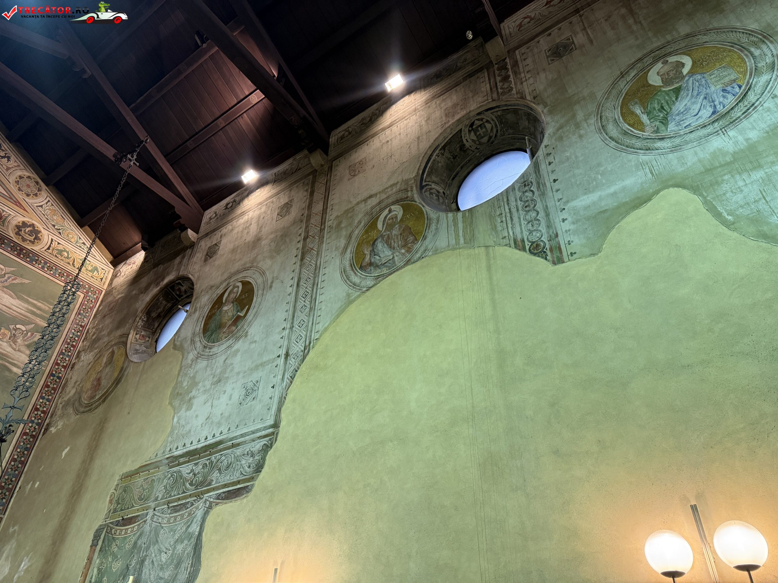 Absida, reconstruită în formă semicirculară, continuă decorul exterior cu arcade și elemente romanice, creând o unitate vizuală între fațadă și partea posterioară a clădirii.