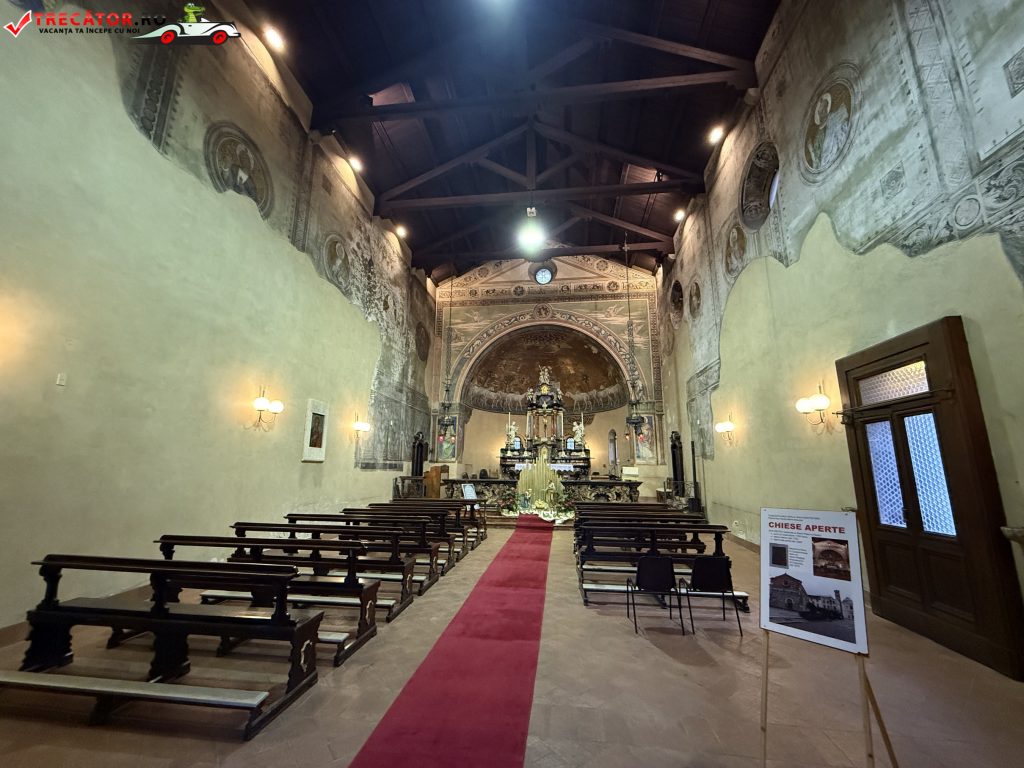 Interiorul este simplu și sobru, cu plan rectangular și acoperiș din lemn cu grinzi aparente. Pardoseala din teracotă și spațiul deschis accentuează atmosfera medievală a bisericii. O parte din frescele realizate la începutul secolului XX de pictorul Ernesto Rusca s-au deteriorat în timp din cauza umidității, însă unele fragmente decorative sunt încă vizibile.