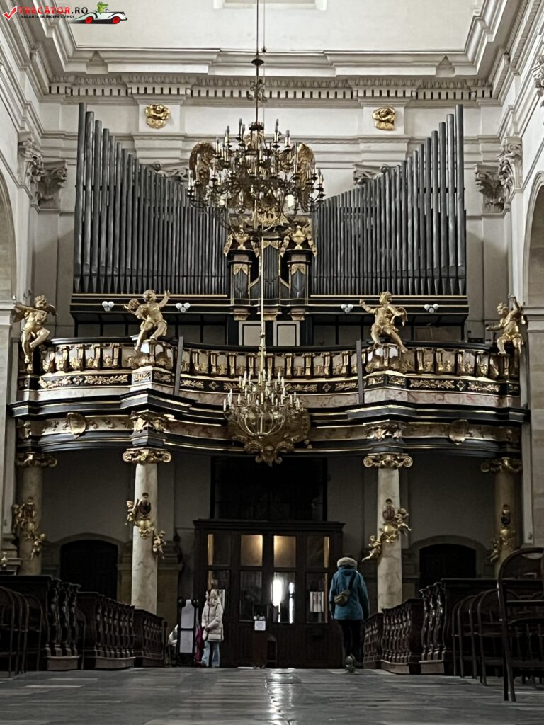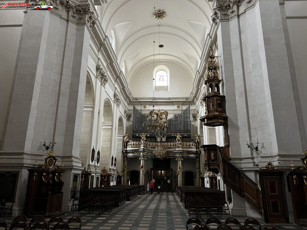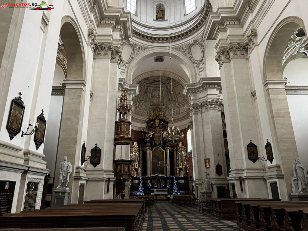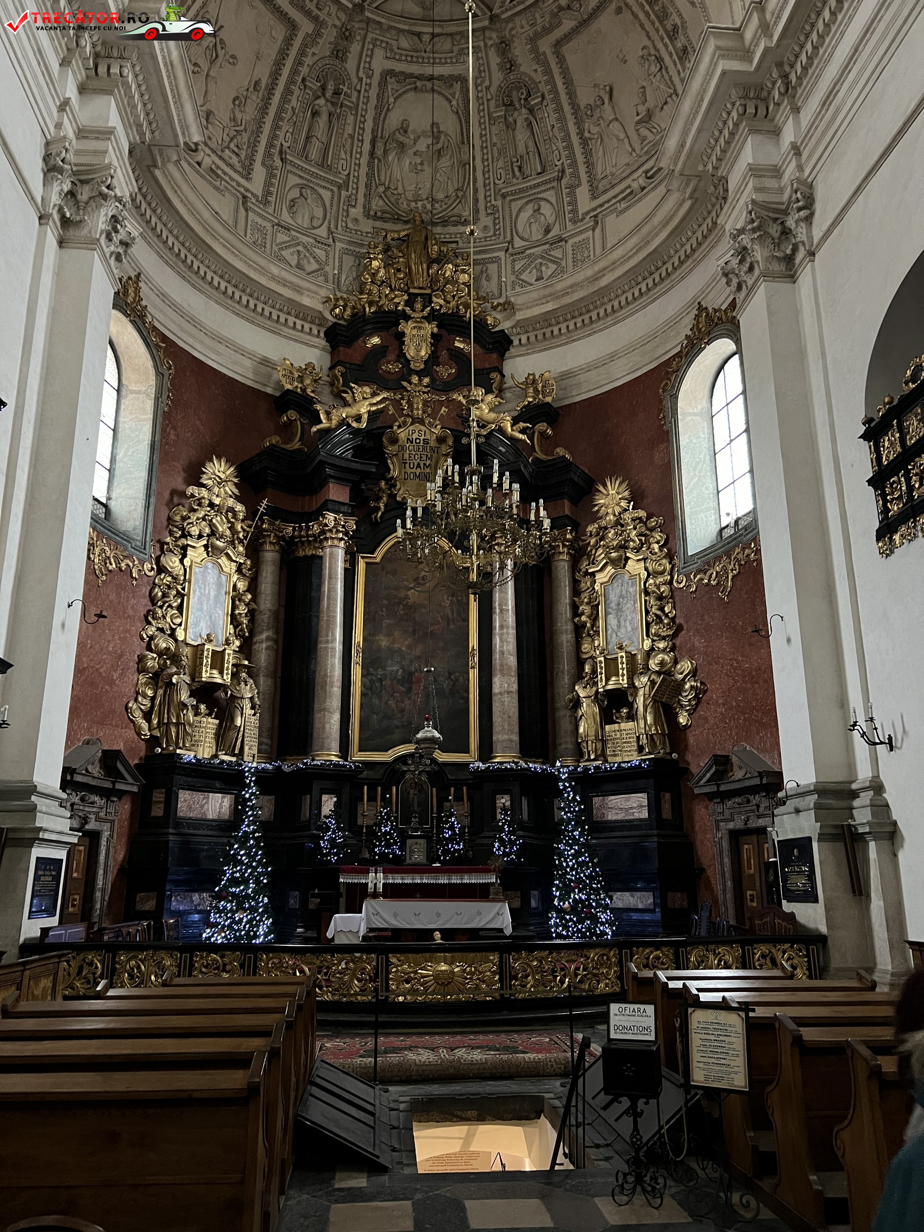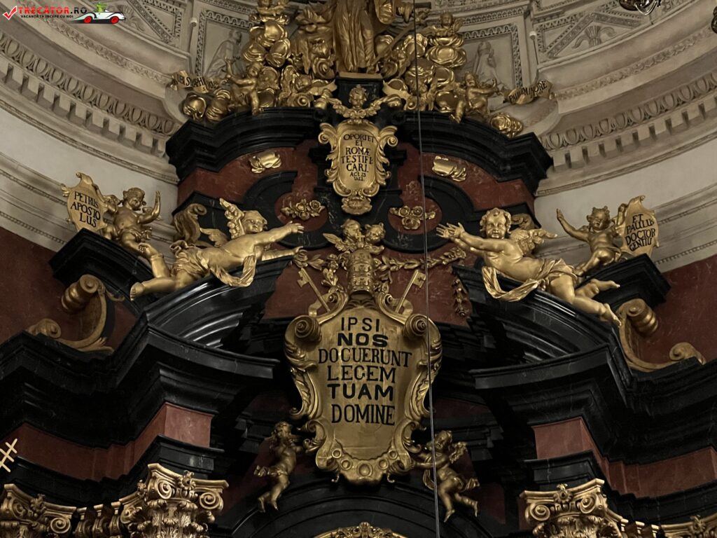 Deasupra portalului principal se poate observa emblema ordinului iezuit precum si statuile Sfintilor Ladisalau I al Ungariei si Sigismund de Burgundia. Biserica se bucura de un interior spatios, avand un singur naos si doua capele in abside. In absida parohiala puteti admira reprezentatii ale scenelor din viata si moartea Sfintilor Apostoli Petru si Pavel, statuile Sfintilor Stanislawa si Wojciech considerati patronii spirituali ai Poloniei.