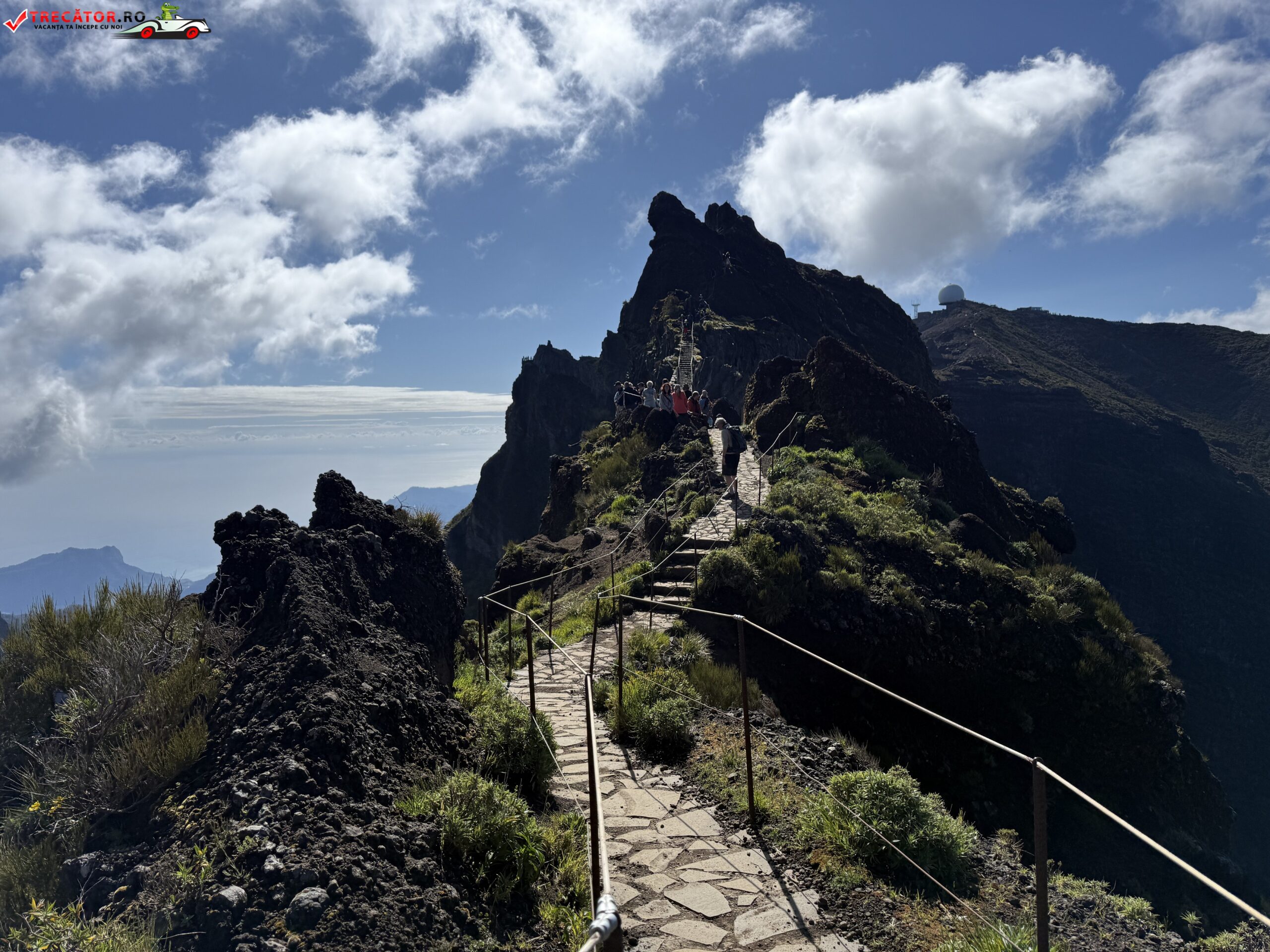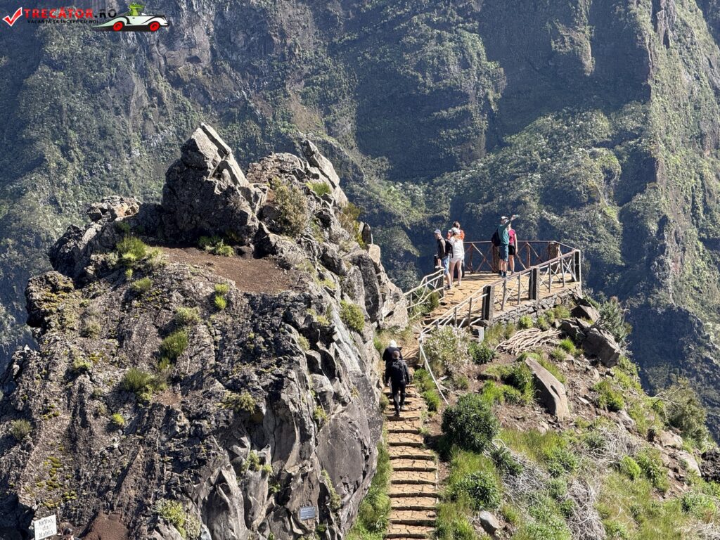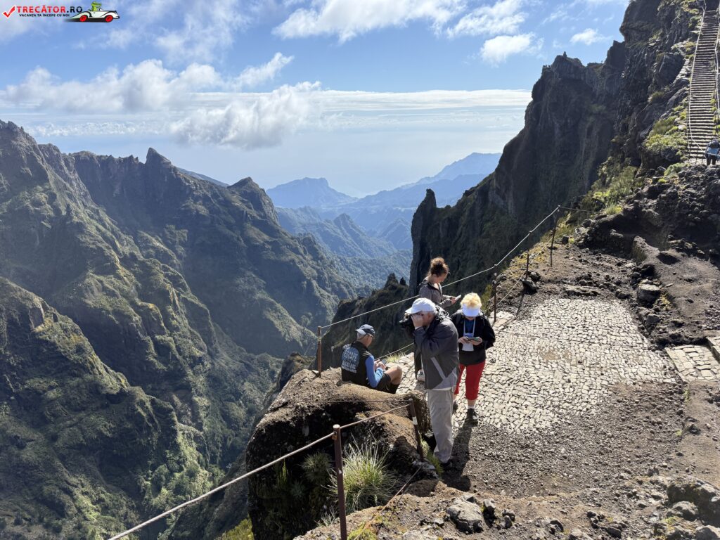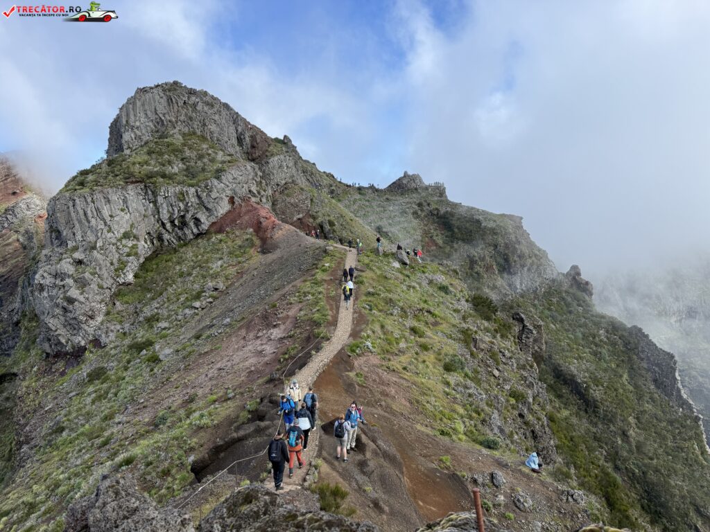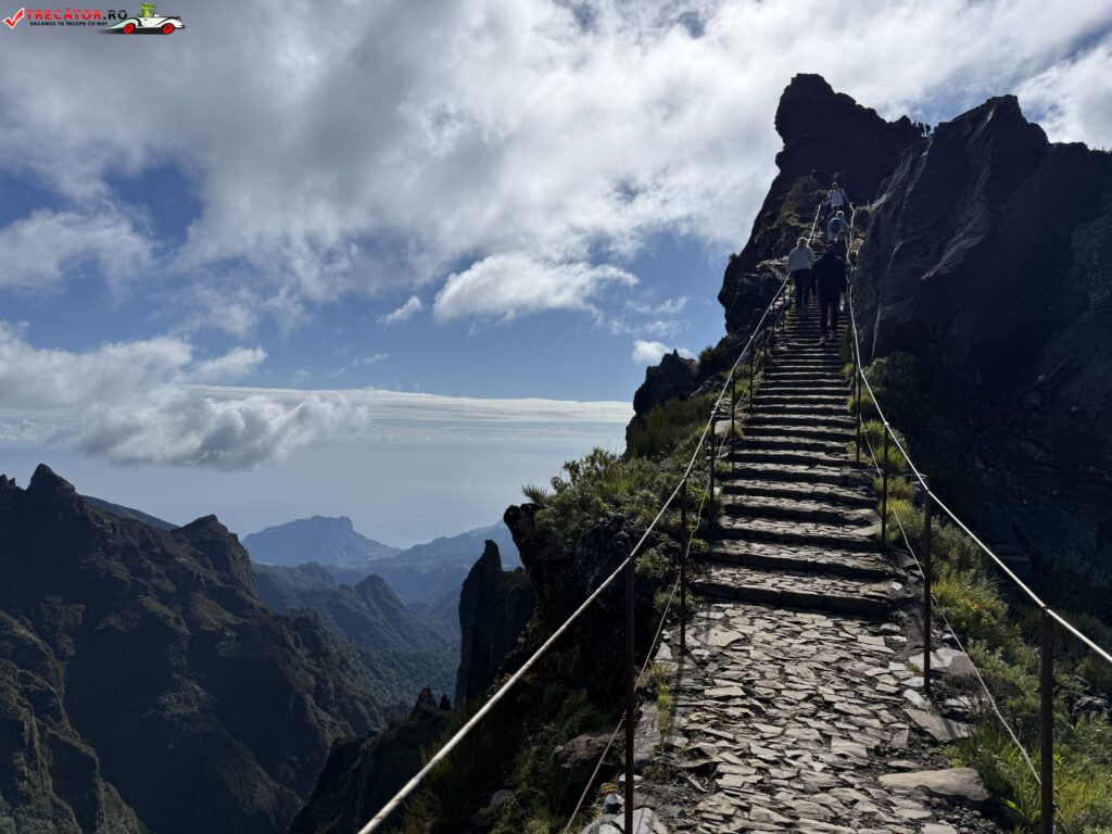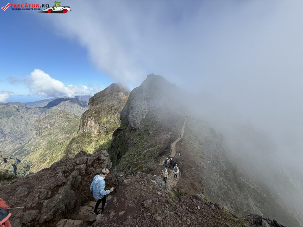 Drumul până acolo începe de la Pico do Arieiro, unul dintre cele mai accesibile vârfuri ale insulei, de unde pornește un traseu montan spectaculos. În primele zeci de minute de mers, urmezi o cărare strâmtă, cu porțiuni de stâncă, balustrade metalice și câteva tuneluri. Nu e o plimbare ușoară, dar nici ceva extrem. Cu încălțămintea potrivită și o minimă atenție, traseul e accesibil pentru cei obișnuiți cu o drumeție montană ușoară spre medie.