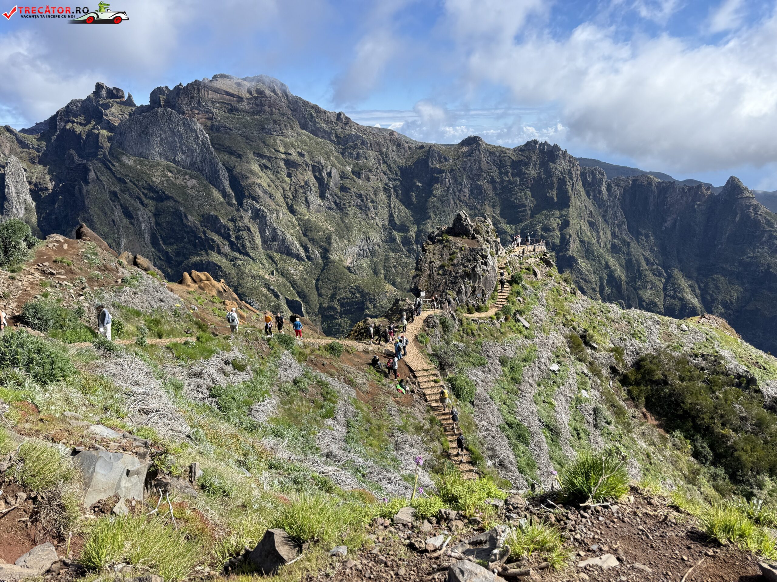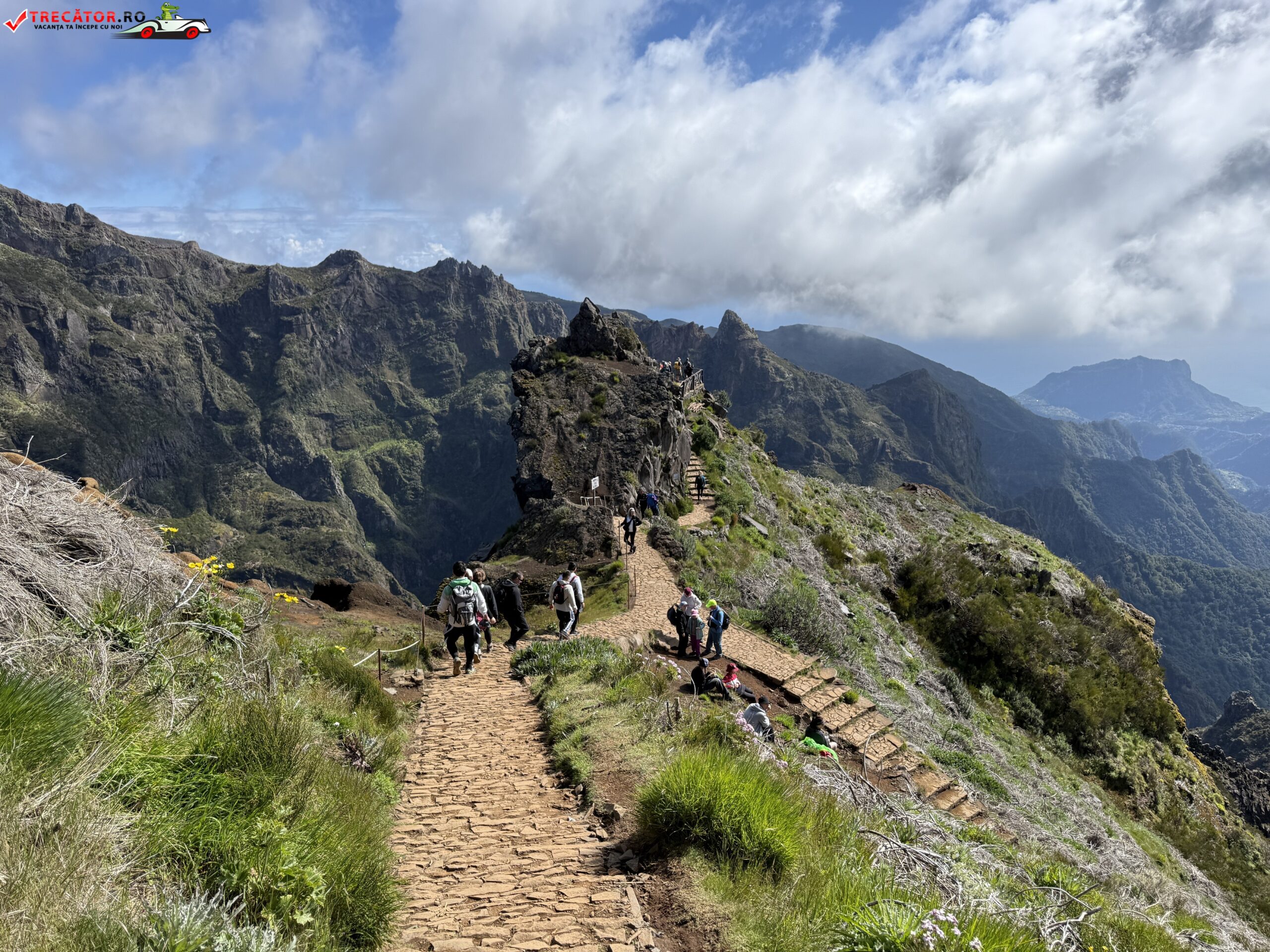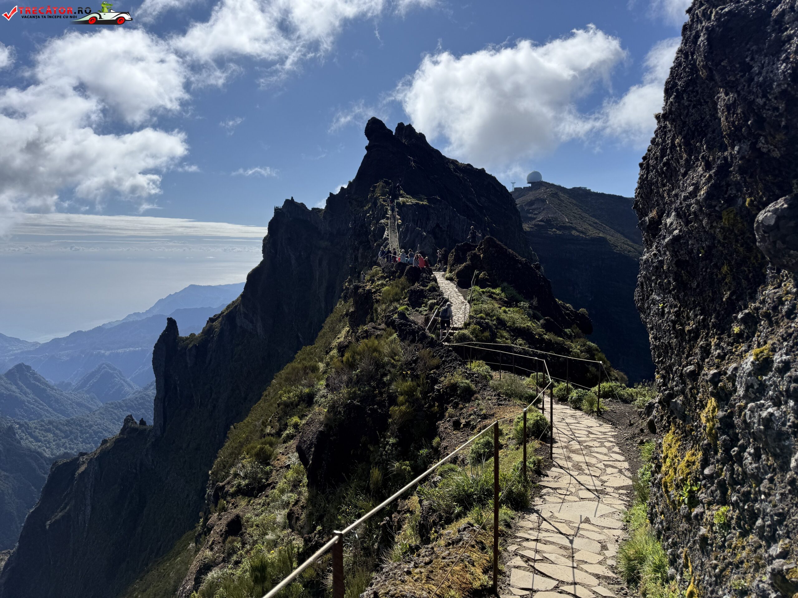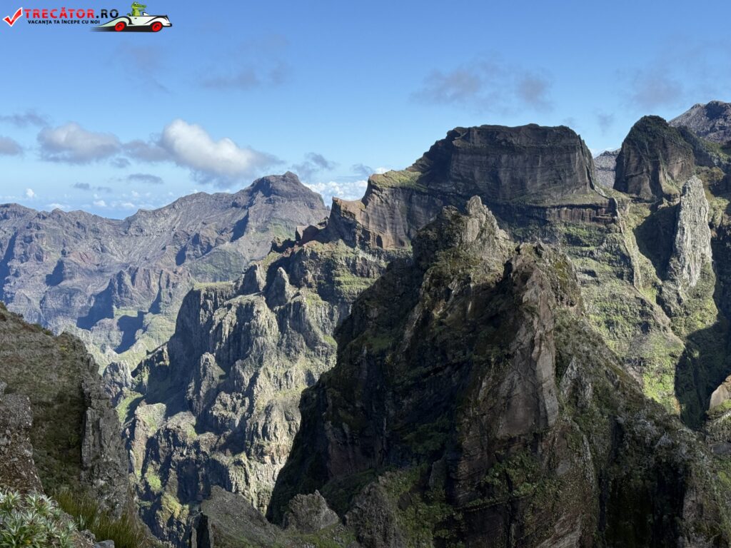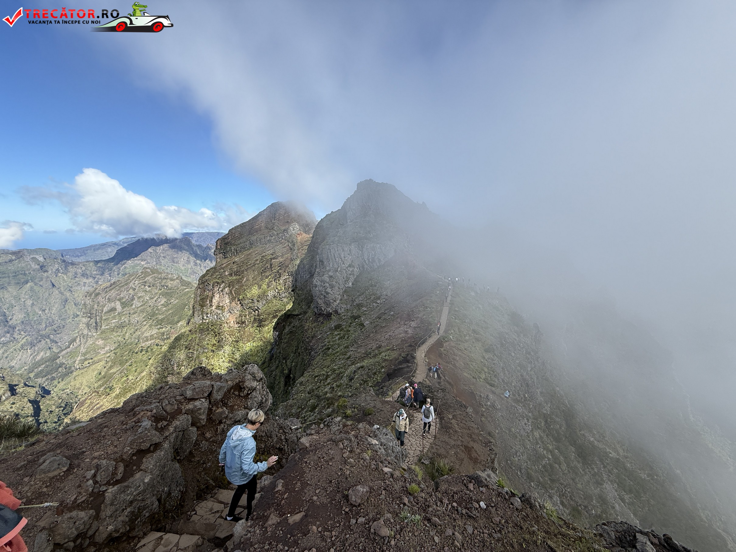 Drumul până acolo începe de la Pico do Arieiro, unul dintre cele mai accesibile vârfuri ale insulei, de unde pornește un traseu montan spectaculos. În primele zeci de minute de mers, urmezi o cărare strâmtă, cu porțiuni de stâncă, balustrade metalice și câteva tuneluri. Nu e o plimbare ușoară, dar nici ceva extrem. Cu încălțămintea potrivită și o minimă atenție, traseul e accesibil pentru cei obișnuiți cu o drumeție montană ușoară spre medie.