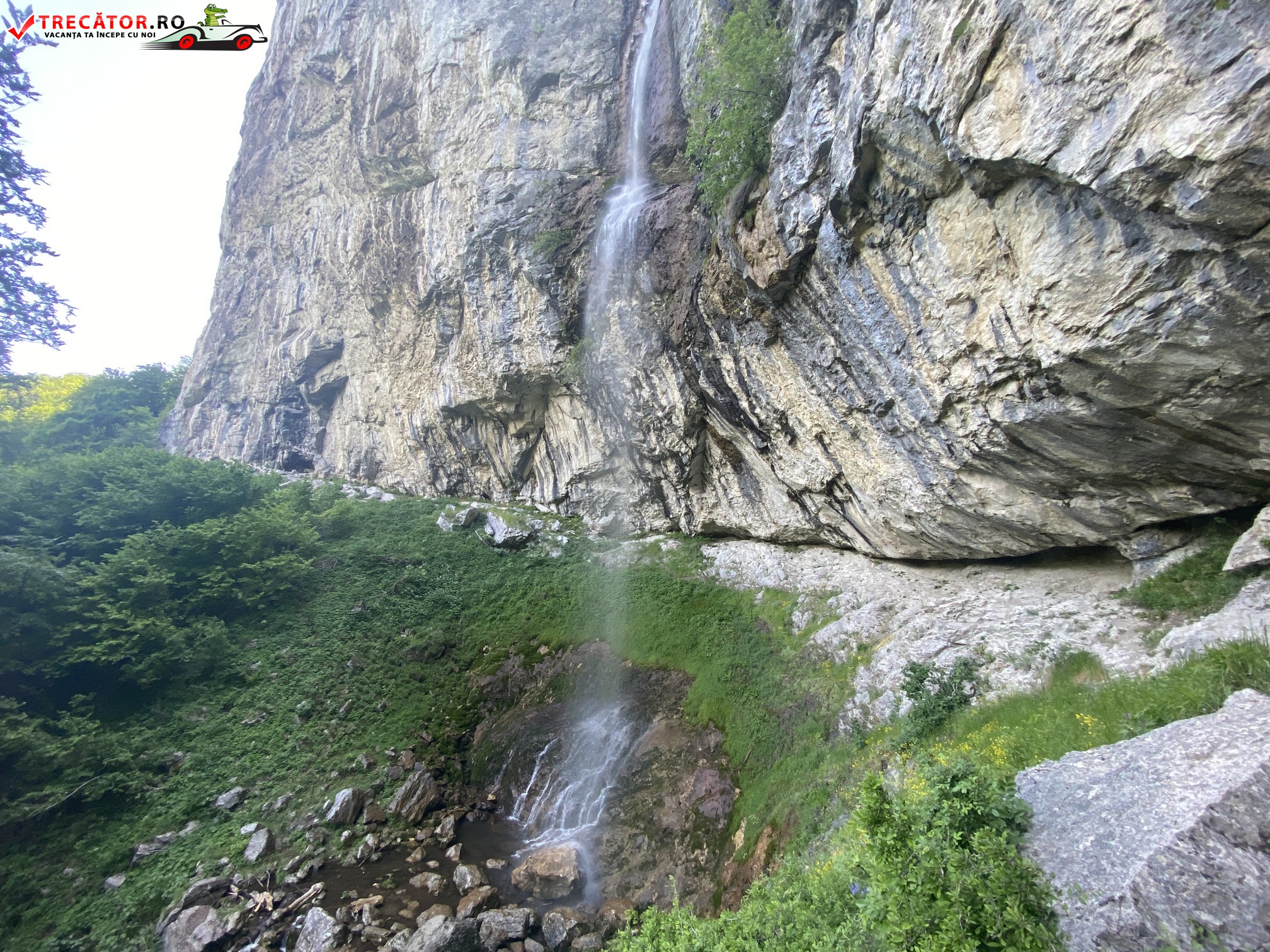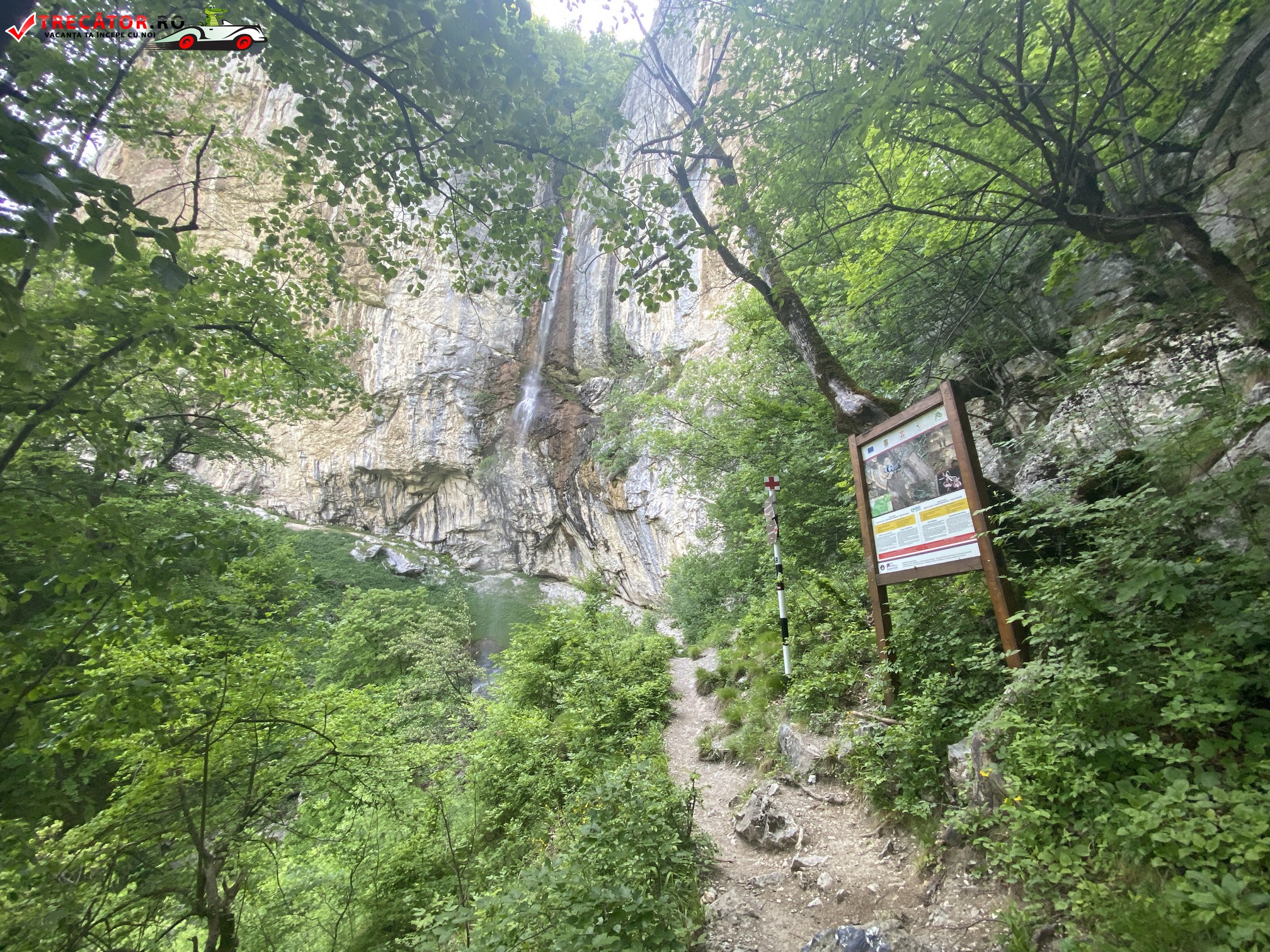 După alte câteva minute de urcuș, se vede amfiteatrul pereților de stâncă peste care se revarsă apele cascadei și se conturează imaginea spectacolului care va urma ajunși lângă cascadă!