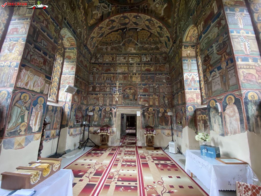 Pictura reprezinta un tot unitar de cultura generala – pe langa scenele religioase, in exterior se pot vedea scene istorice (asediul Constantinopolului) si cu aspect cultural (Filosofii antici). Pe stalpul de pe fatada sudica sunt redati sfintii militari (Sf.Gheorghe, Sf.Dimitrie, Sf.Mercurie).