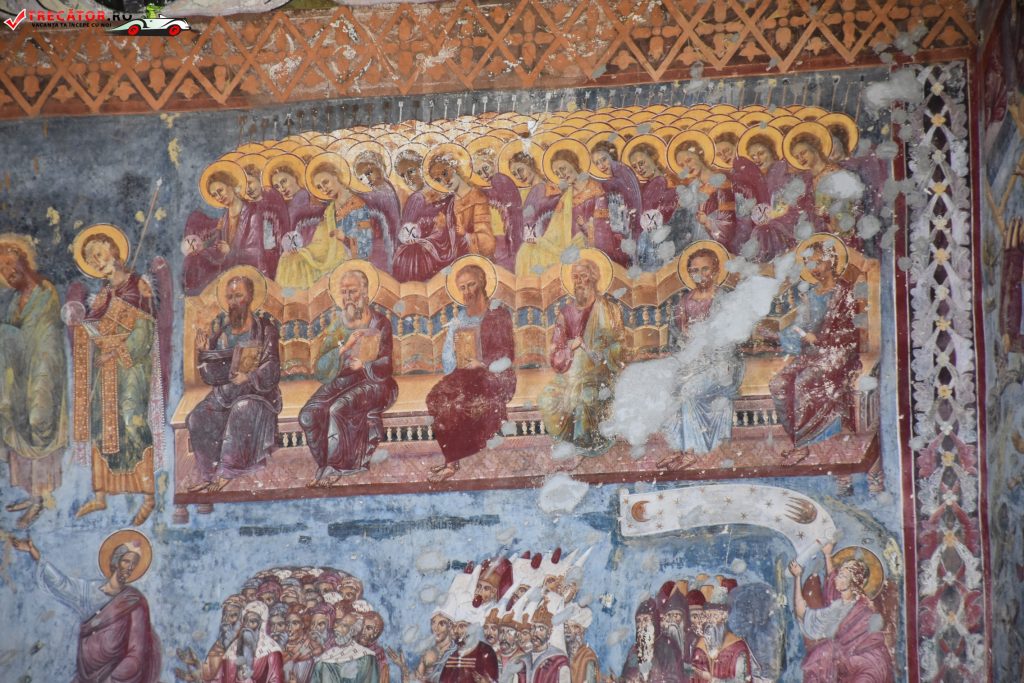 În pridvor pe stânga se vede mormântul soției lui Alexandru Lăpușneanu cu inscripția: “Bine credinciosul și de Hristos iubitorul Io Alexandru Voievod Domnitorul Moldovei a înfrumusețat acest mormânt soției sale Doamna Anastasia Alexandru Lăpușneanu care a trecut la veșnicele lăcașuri și a fost îngropată aici la anul 7066 (1558) luna mai 2”
