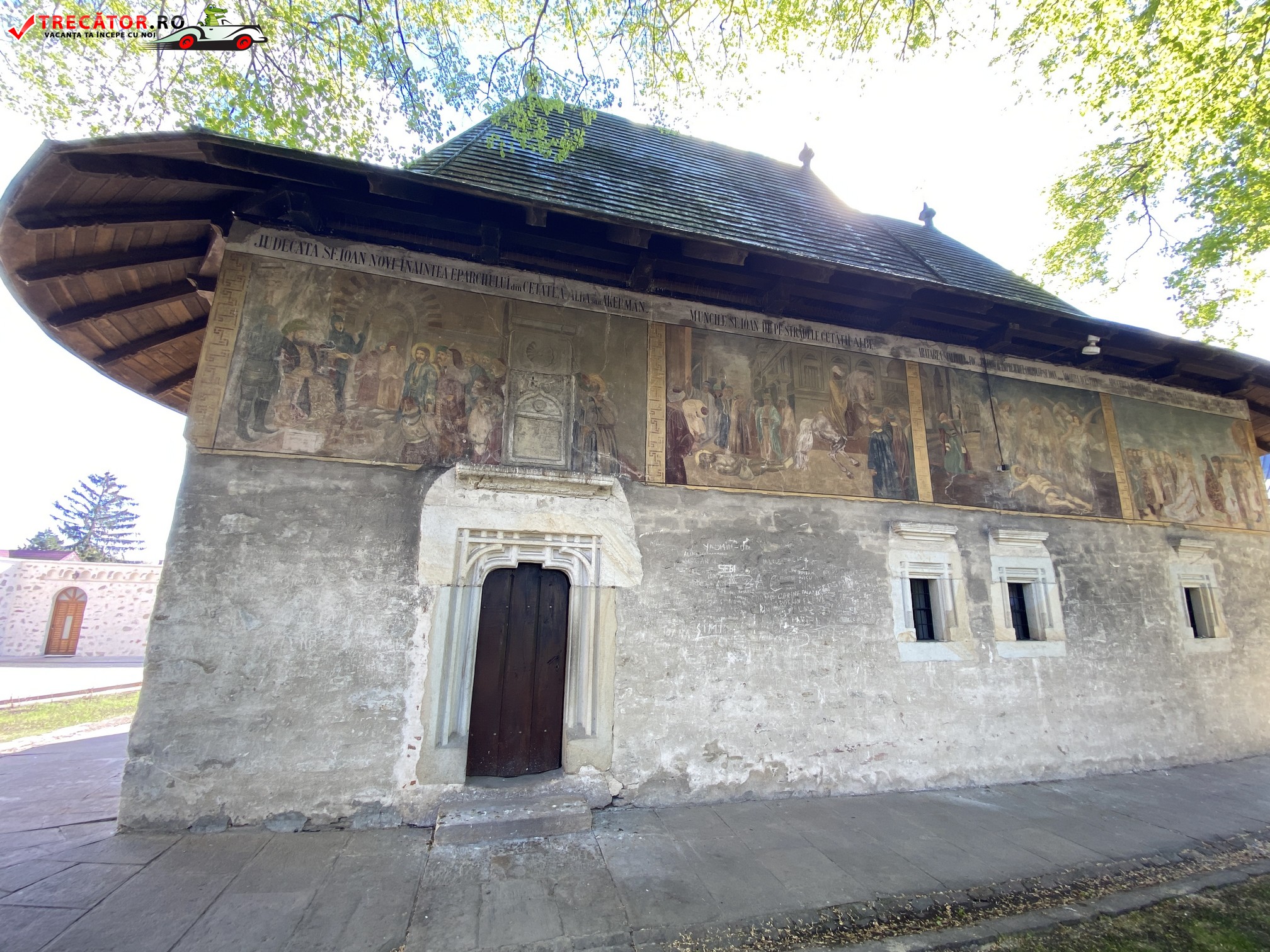 În pronaos sunt reprezentate Sinoadele Ecumenice, iar în calotă, Fecioara rugându-se. La exterior, pictura s-a deteriorat și a fost tencuită, în afară de latura sudică, unde se mai păstrează încă. Pe fond albastru se poate vedea „Arborele lui Iesei” încadrat de filosofii antici, „Acatistul Maicii Domnului”, „Pilda fiului rătăcitor” și „Cucerirea Constantinopolului”.