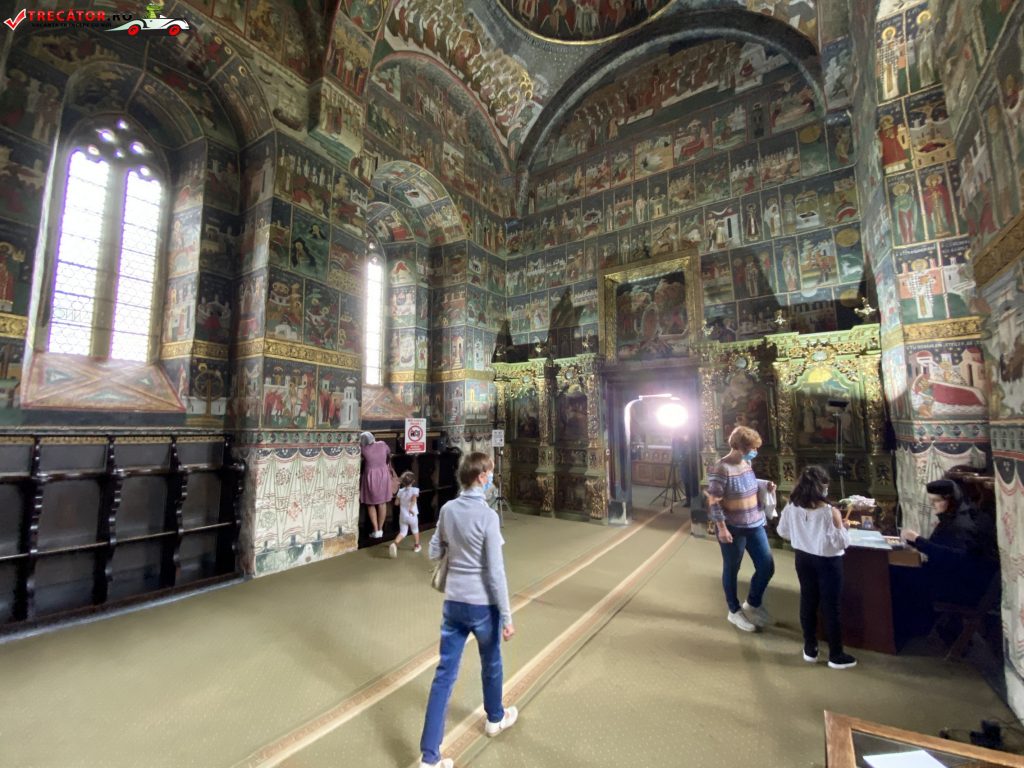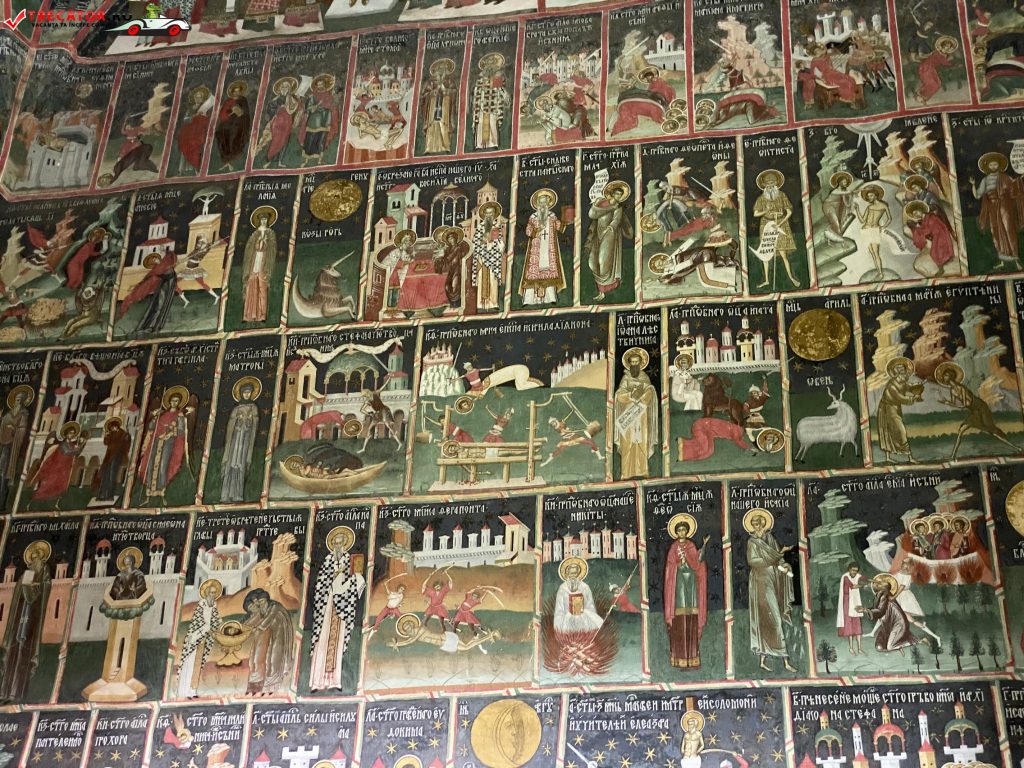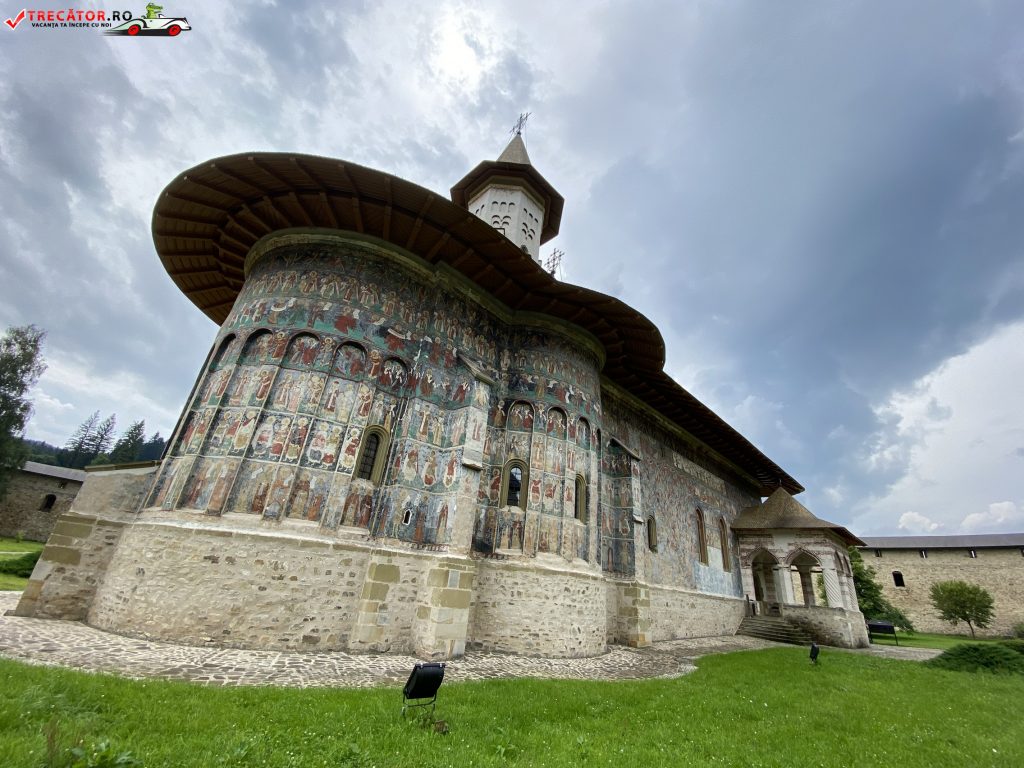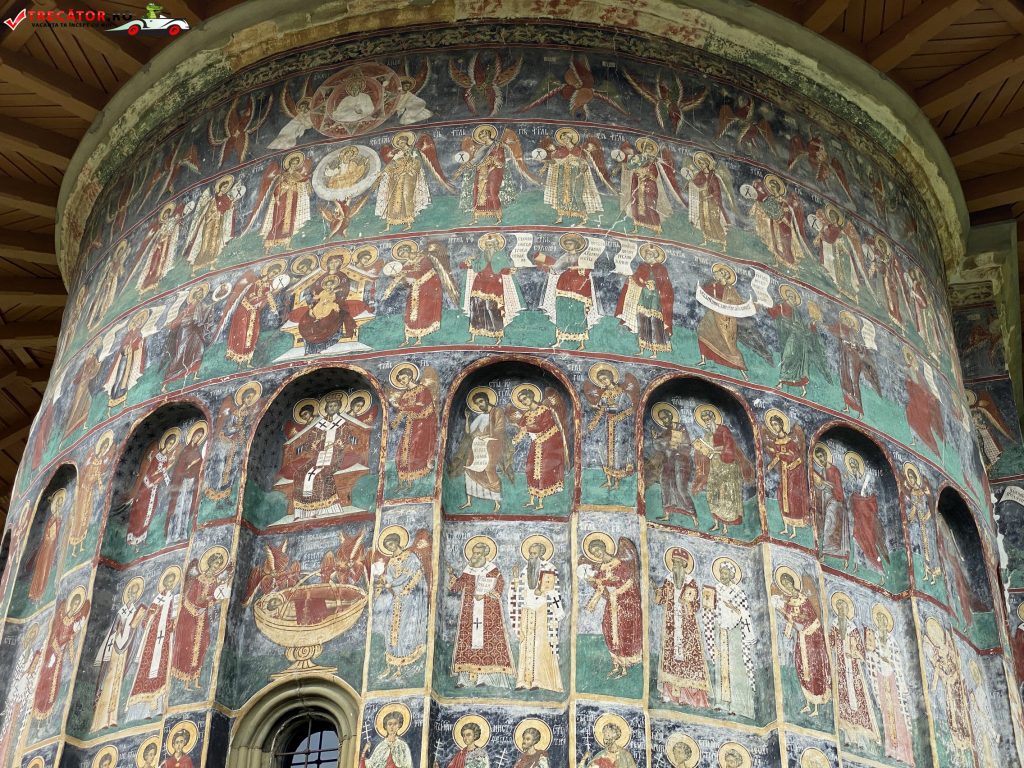 Pictura, realizata in fresca, a fost executata de doi pictori moldoveni, Ioan Zugravul si fratele sau Sofronie, si se pastreaza in forma originala. Programul iconografic al picturii interioare si exterioare respecta traditia constituita in prima jumatatee a secolului al XVI-lea – epoca lui Petru Rares – dar introduce si unele teme noi, cu caracter teologic-dogmatic, cum este scena din conca naosului, reprezentand imnul liturgic „Unul Nascut …” si alte reprezentari ale Sfantei Treimi.