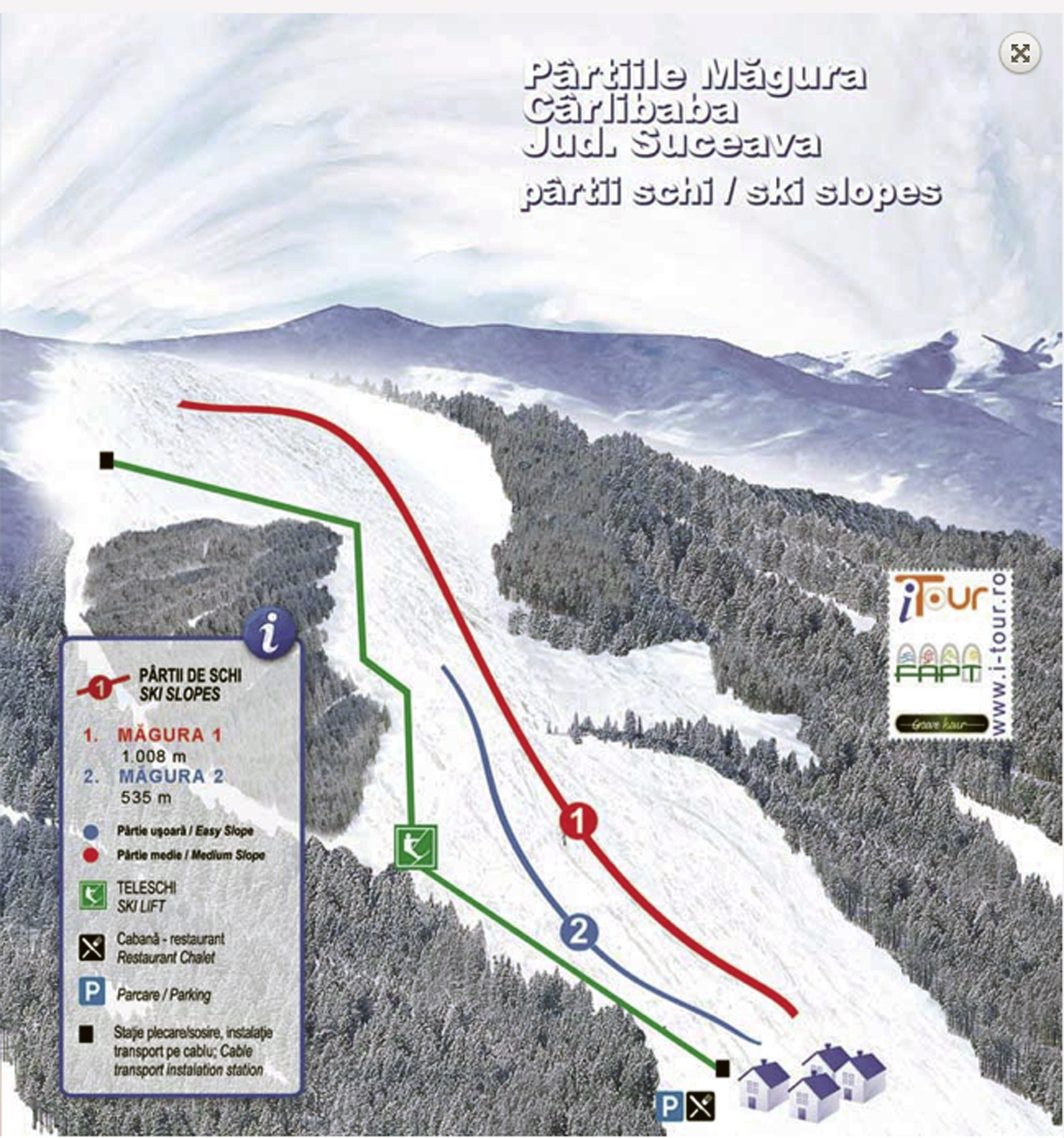 Partiile din Carlibaba se numesc Magura 1, de dificultate medie si lungime de 1,008 m si Magura 2, de dificultate usoara si lungime de 535 m. Acestea sunt deservite de teleschi.