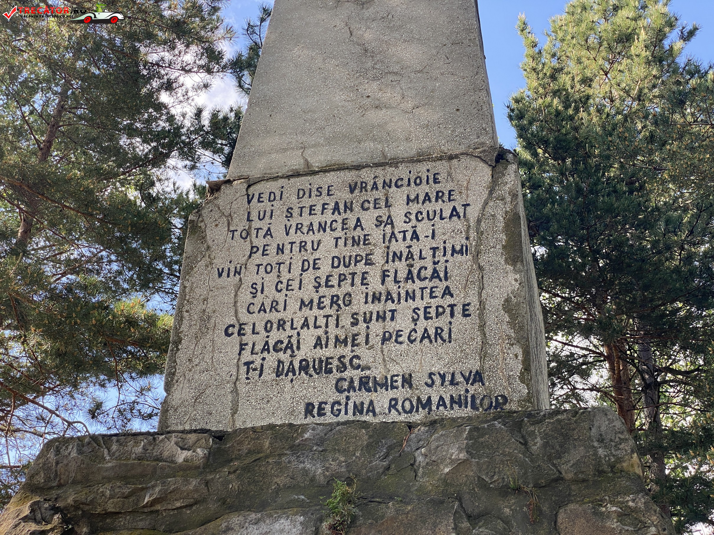 ”Vedi, dise Vrâncioie lui Ștefan cel Mare, totă Vrancea s-a sculat pentru tine. Iată-i vin toți de dupe înălțimi și cei șepte flăcăi cari merg înaintea celorlalți. Sunt șepte flăcăi ai mei, pecari ț-i dăruesc. Carmen Sylva, Regina Românilor”.