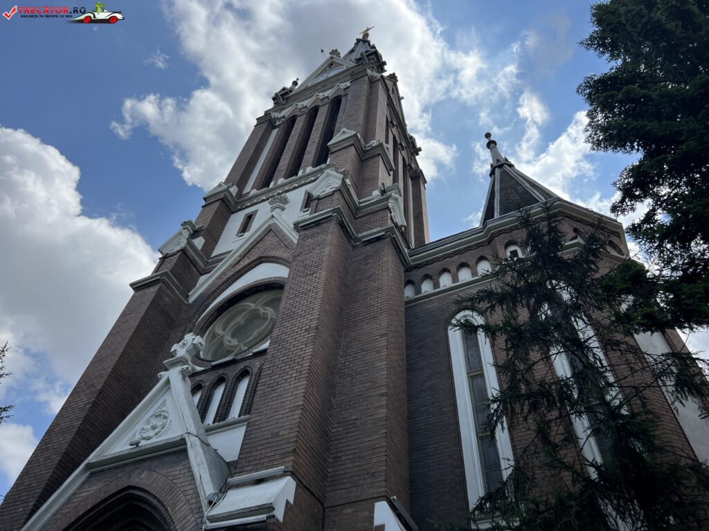Inaltimea Bisercii Rosii nu avea cum sa nu se faca remarcata indiferent in ce zona a orasului te-ai afla, Turnul sau fiind construit pe o inaltime de 46 metri. De asemenea, nu poti trece pe langa biserica fara sa nu ii remarci vitraliile destul de inalte, construite in stil neogotic.