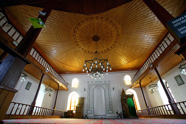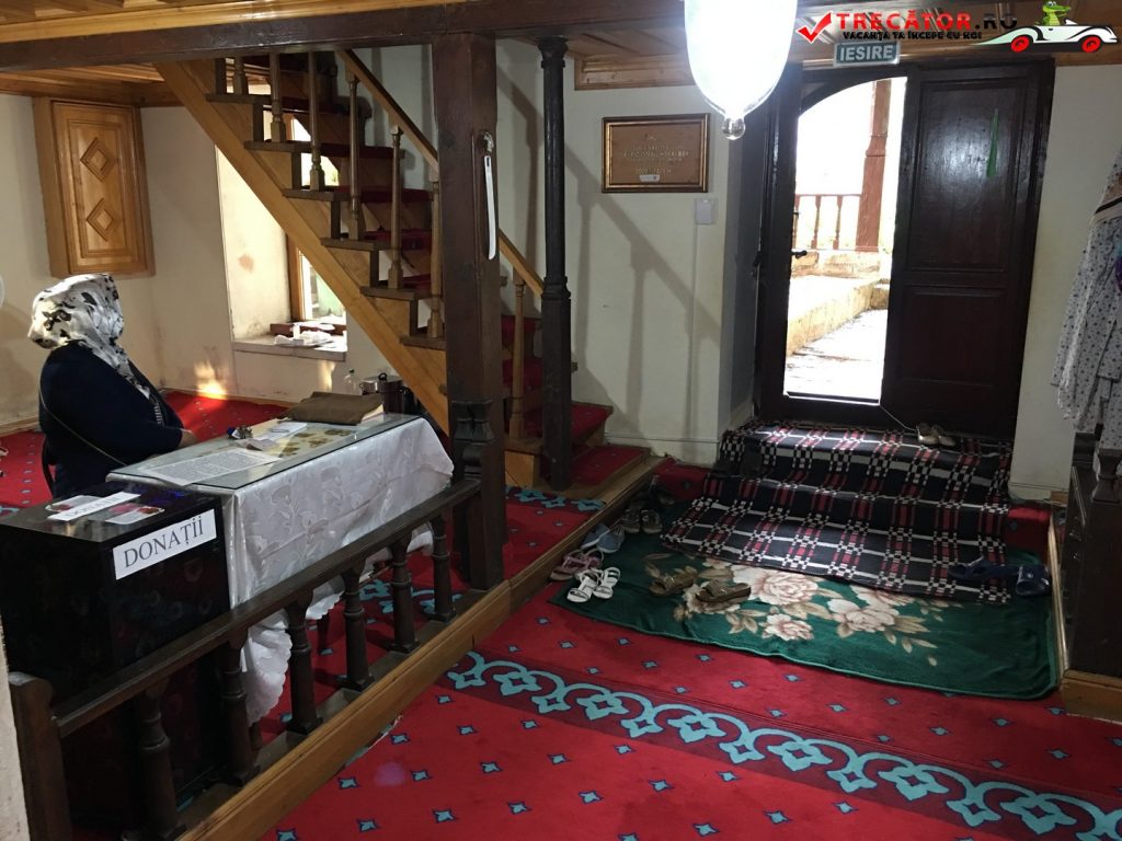 Tavanul cu gobek din marchetarie din lemn este o mare realizare artistica. O nota de originalitate o da impartirea printr-o balustrada joasa aflata la intrarea in lacasul religios a unui spatiu destinat exclusiv femeilor. Minaretul se afla pe latura nordica a moscheii. Pe terasa minaretului se poate ajunge prin intermediul unei scari interioare, in spirala.