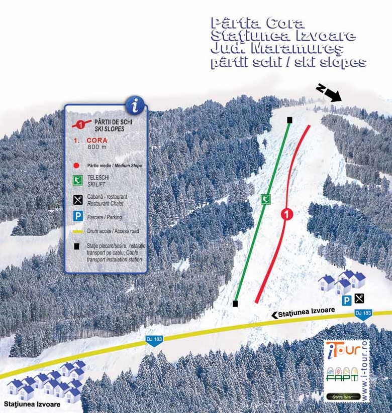 Partia de schi Cora, asa cum este ea denumita astazi, este o partie omologata de Ministerul Turismului, de dificultate medie si o lungime de 800 de metri. Partia este deservita de un teleschi, iar de curand s-a deschis Cabana Iza, unde turistii se pot relaxa si lua o gustare.Statiunea Izvoare schi