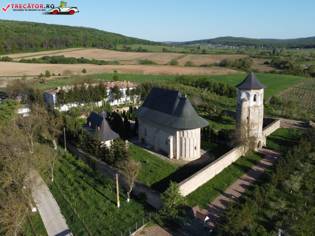 Este situată la 25 km sud de Iași, la 35 km nord de Vaslui (la 13 km de șoseaua națională Iași-Vaslui), la 10 km nord de localitatea Codăești jud. Vaslui și la 16 km sud-est de gara Bârnova. La nord-vest se află comuna Grajduri, iar la nord-est comuna Schitul-Duca. Așezământul este construit într-un decor plin de frumusețe, la poalele unei păduri de carpen, fag și brad, în sud-vestul satului Moldoveni, și la câteva sute de metri de satul Ruși. Împrejurimile, cu un relief variat, sunt dominate de dealul Rotunda, având o înălțime de 456 m.