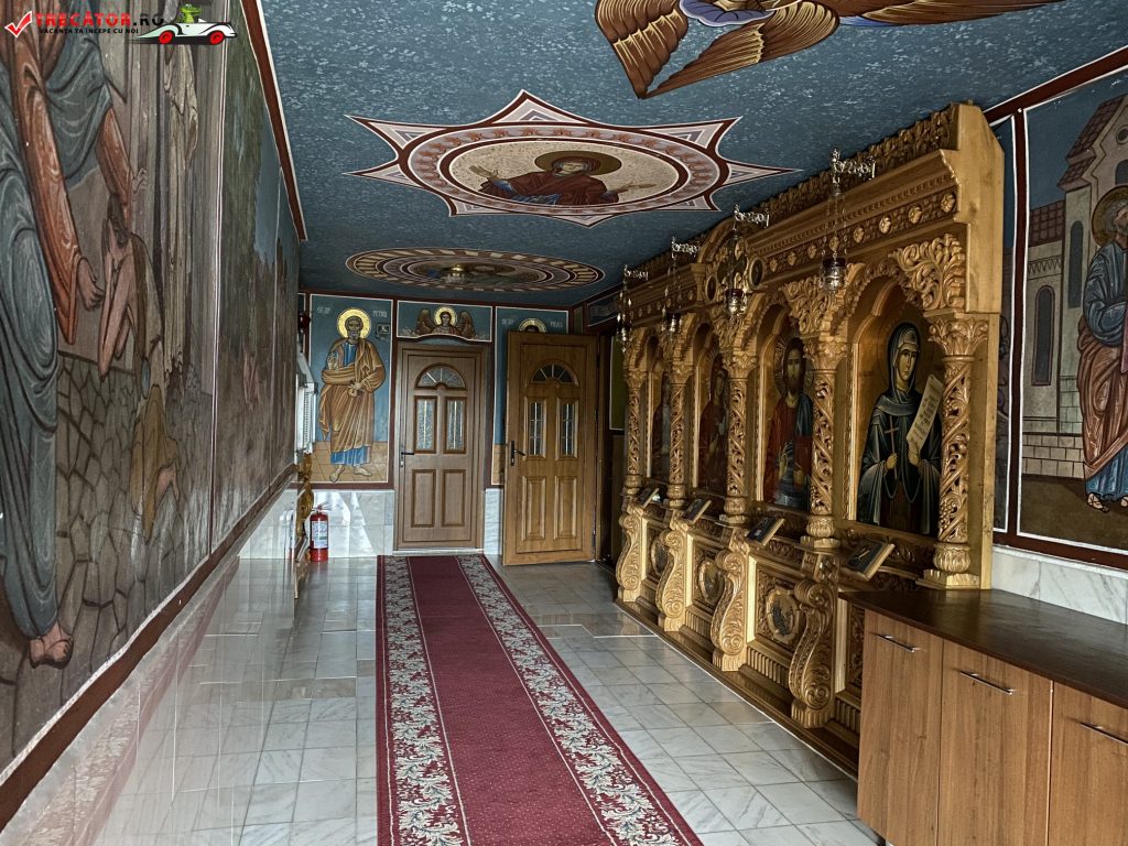 La intrare este amplasata o poarta monumentala, sculptata in lemn de stejar, opera a sculptorului Ionel Bulgaru, realizata in anul 1996, in stilul caracteristic artei populare, decorata cu zece scene religioase in altorelief, marginite de doua coloane torsate, surmontate de un acoperis in doua ape de sindrila si o cruce latina.