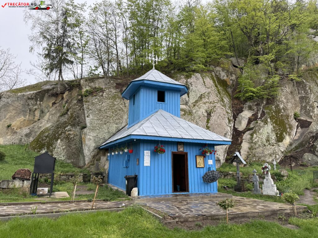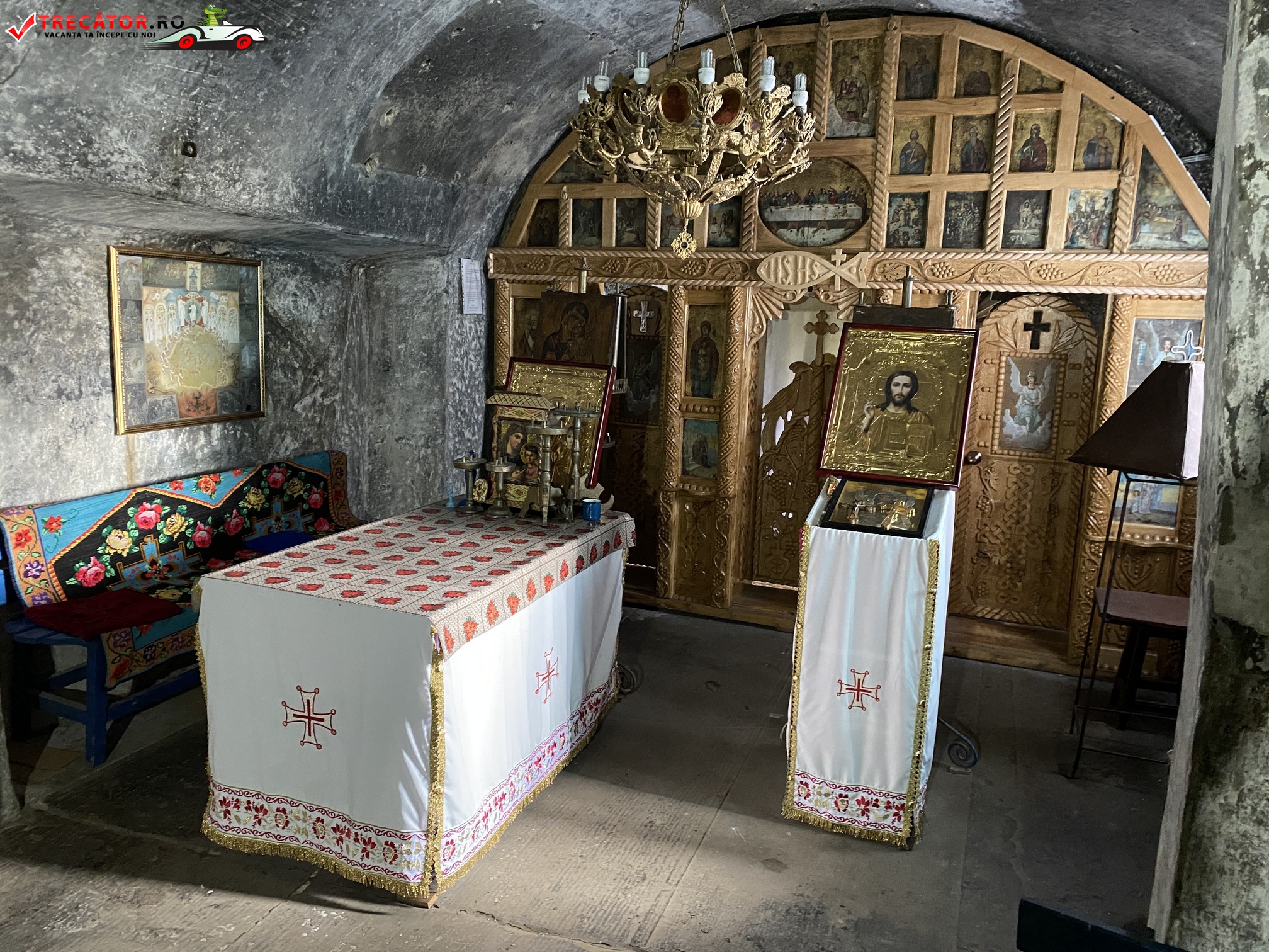 La intrarea in biserica, exista un pridvor de lemn din 1825, apoi naosul si altarul care sunt sapate in stanca, cu tavan boltit, despartite de doi pilastri. Pe unul scrie cu chirilice „Ma(teio) leat 7056” (1548). Pe peretele nordic al altarului, alta inscriptie in paleoslava, din care s-au descifrat doar numele ctitorilor legendari Simion si Vlad si al ieromonahului Daniil.