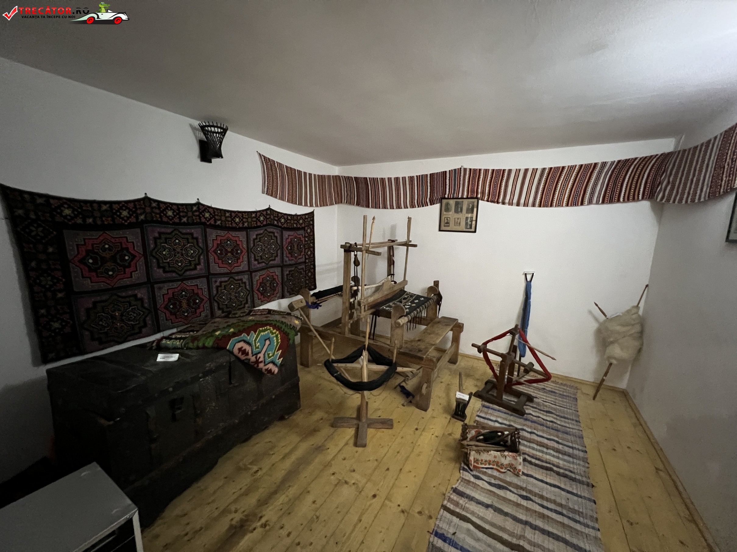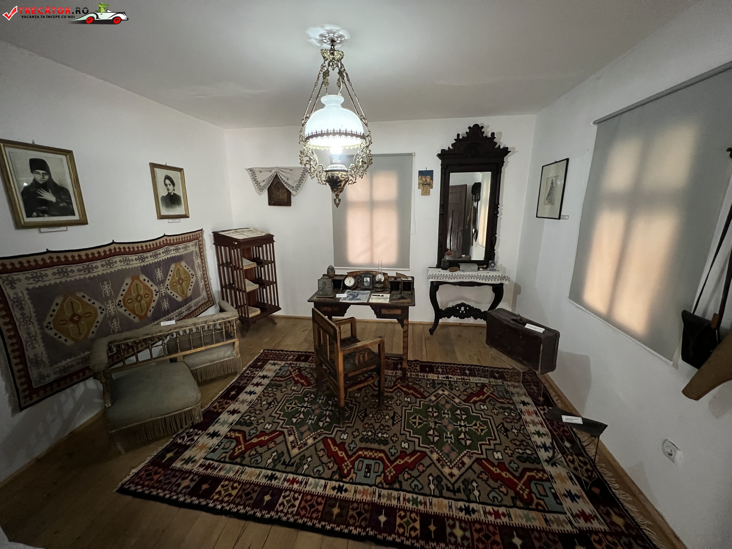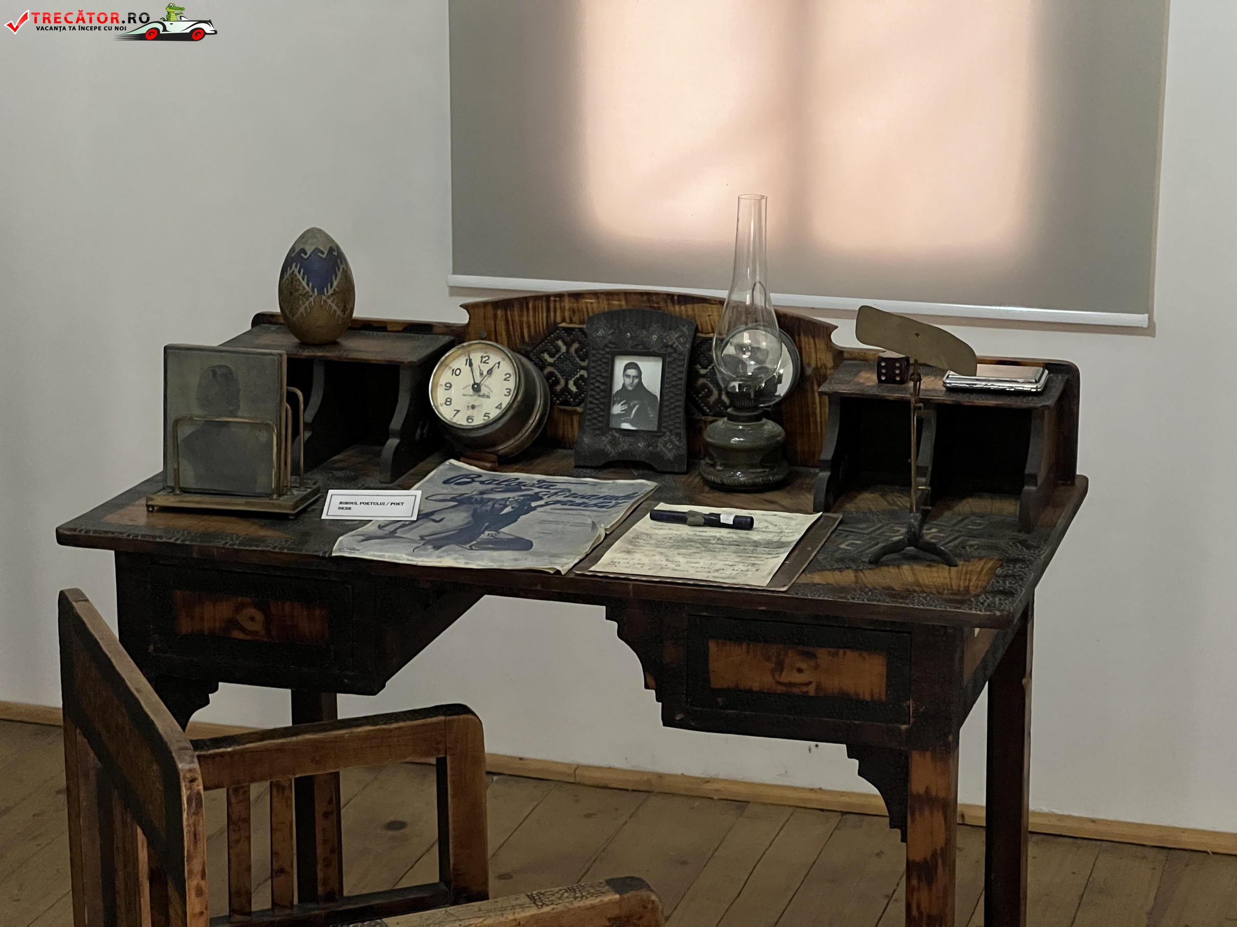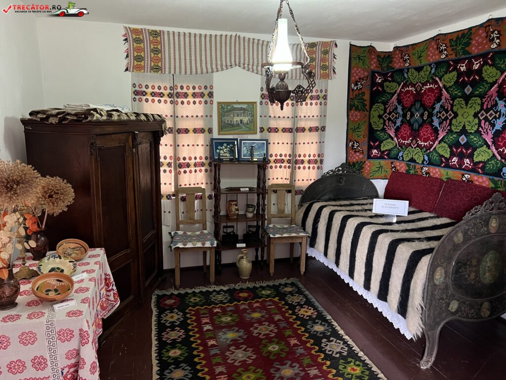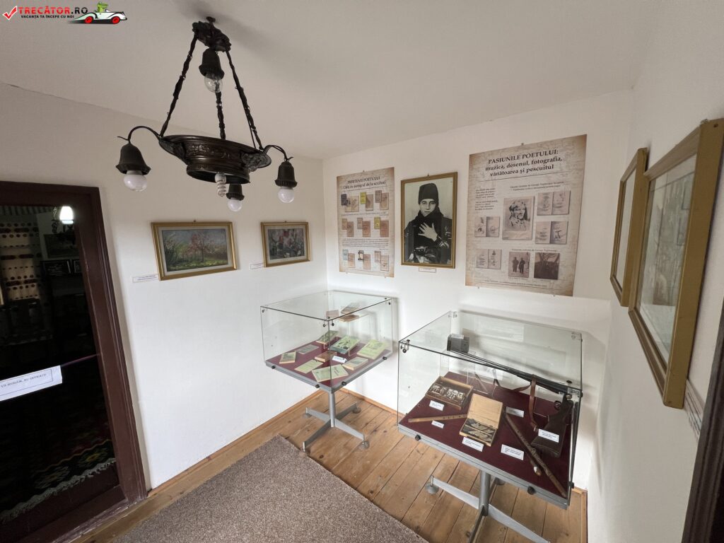 Către stradă, un dormitor cu mobilier de epocă și multe țesături populare evocă pentru vizitator calmul orelor de odihnă ale poetului.