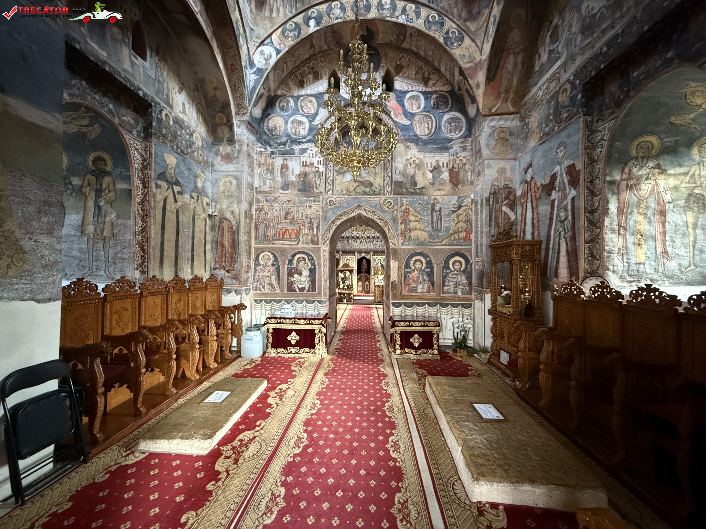 În pronaos se află două pietre tombale, două morminte. Unul dintre ele adăpostește osemintele Alexandrei, soția ctitorului, iar celălalt osemintele Saftei Vlădescu, cumnata Alexandrei. La moartea soției, clucerul Vlădescu s-a călugărit, devenind monahul Teodosie. Iar funcționalitatea presupusei biserici de cult s-a schimbat și ea în aceea de mănăstire de călugări.
