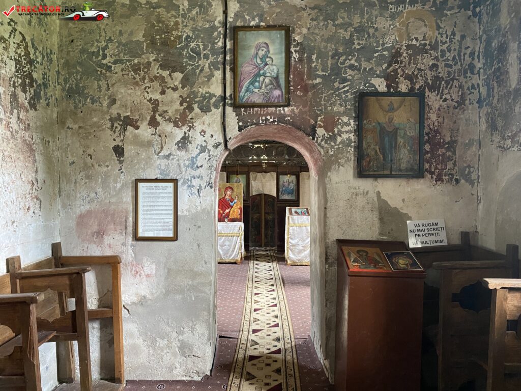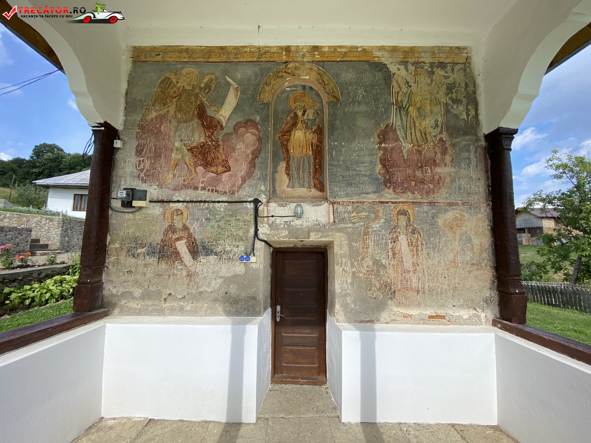 Pridvorul a fost adaugat ulterior, cele sase barne de sprinit fiind sculptate in lemn de stejar. Interiorul bisericii este impartit in pronaos, naos si Altar. Intre pronaos si naos se afla un zid gros, cu trei deschizaturi inguste. Catapeteasma bisericii este cea originala, ea fiind sculptata in lemn de tei. Icoanele de pe catapeteasma nu s-au pastrat in intregime, doar unele dintre ele fiind originale.