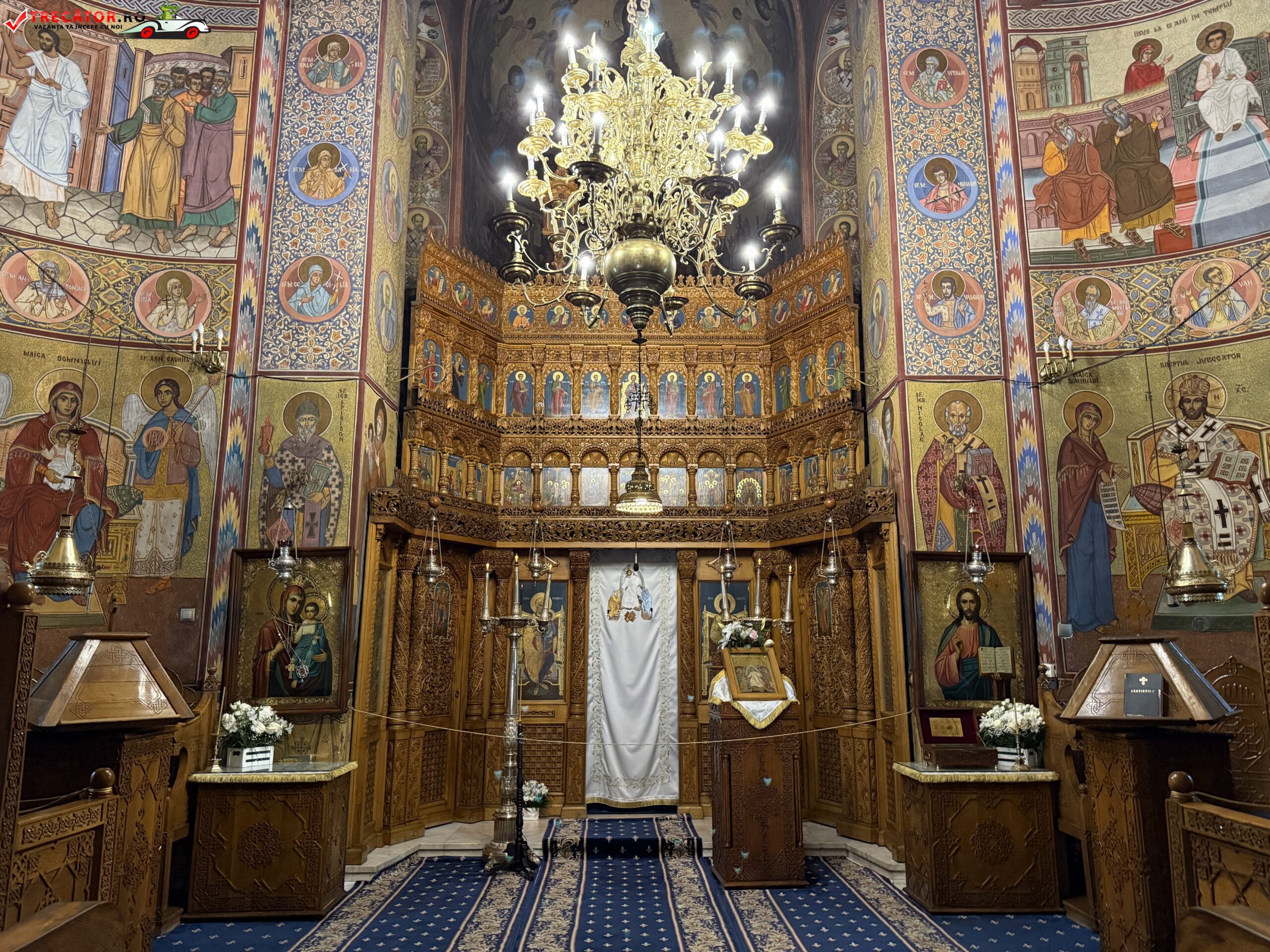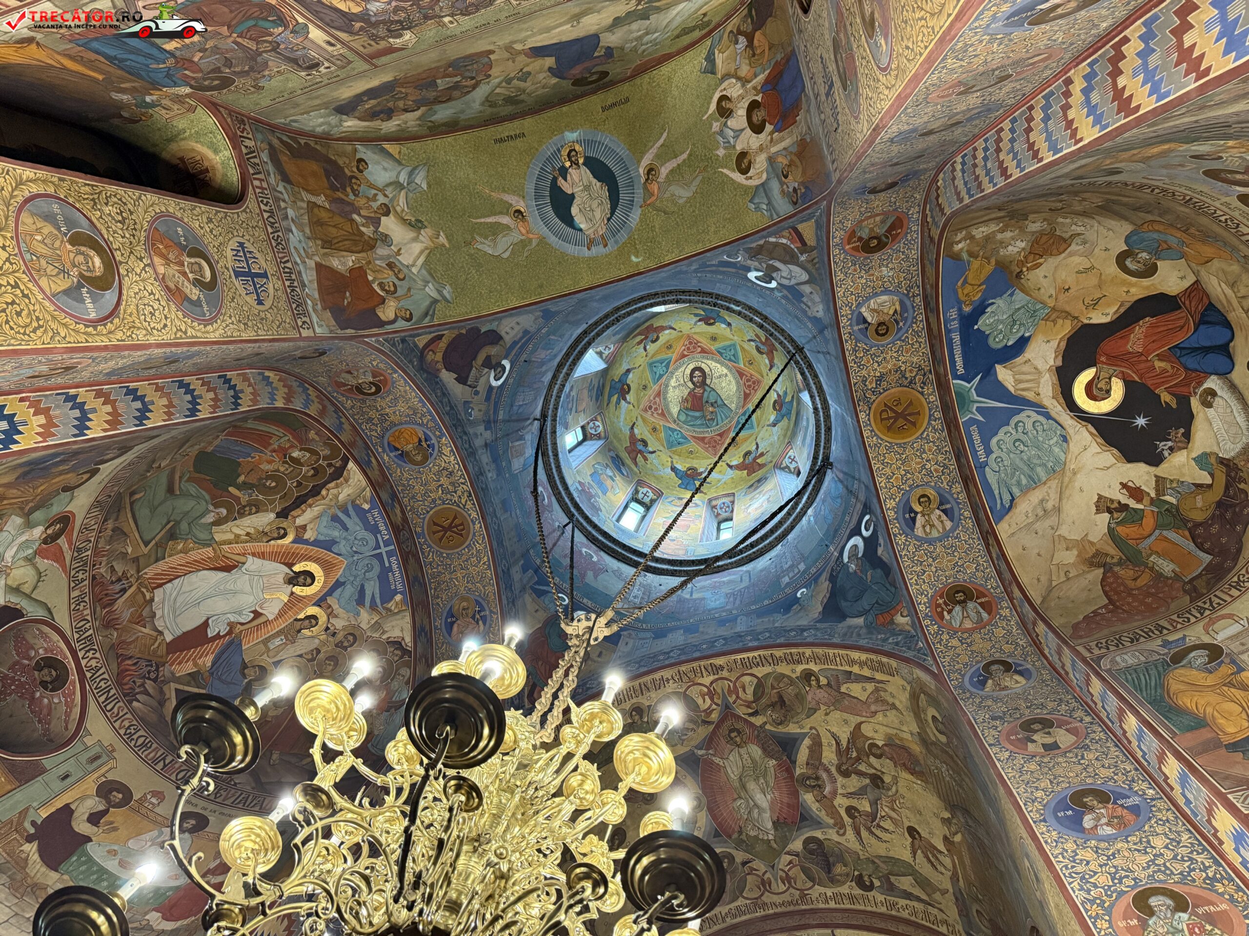 Dintre cele trei turle, cea situata peste incaperea naosului este cu mult mai inalta, avand ceva din singuratatea solemna a unui catarg octogonal, in timp ce celelalte doua rasar ca niste miniaturi gemene ale celei dintai, punctand spre ceruri locul pronaosului, sfantul lacas. Ornamentele cele minutios incrustate de pe unda braielor turlei mari te duc cu gandul la frumoasele altare indiene. Intrarea principala a sanctuarului este flancata de doua panouri cu impletituri daltuite cu migala si purtand la mijloc prin vremuri ca pe un stindard inscriptia cu pisania manastirii.