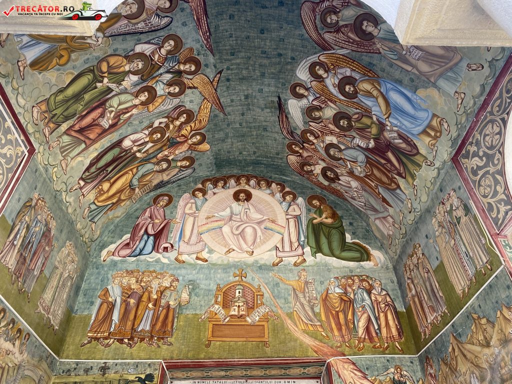 În pridvor se păstrează pictura din anul 1914, precum și pisania pusă atunci, deasupra intrării în pronaos. Separația dintre pronaos și naos este realizată prin stâlpi de cărămidă, legați prin arcade, iar naosul este separat de altar printr-o splendidă catapeteasmă sculptată în anul 1864, ce celebrul Karl Storck. În pronaos, pe peretele vestic, se păstrează tabloul ctitorilor. În interiorul bisericii se păstrează icoana făcătoare de minuni a Maicii Domnului, lucrată în argint masiv de meșterul grec Mavros și dăruită de voievodul Leon Tomșa, în anul 1632.